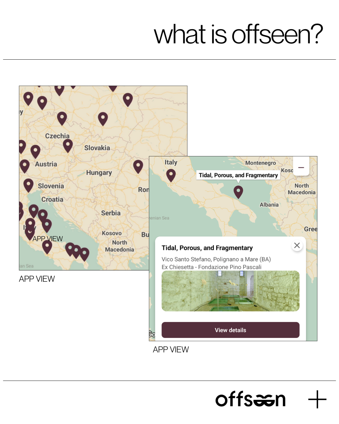 We collaborate with offseen, a platform dedicated to mapping exhibitions and exhibition spaces. The project collects and geolocates current and past exhibitions, making them accessible through an interactive map and an archive.