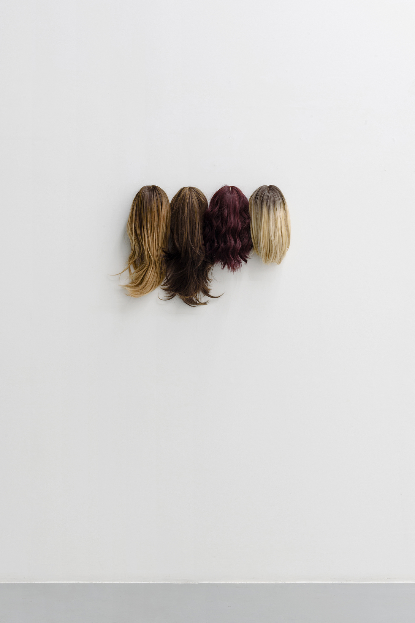 Eva Gold, GOODNIGHT JESSICA, 2025, parrucche sintetiche, filo di alluminio, stoffa in acciaio