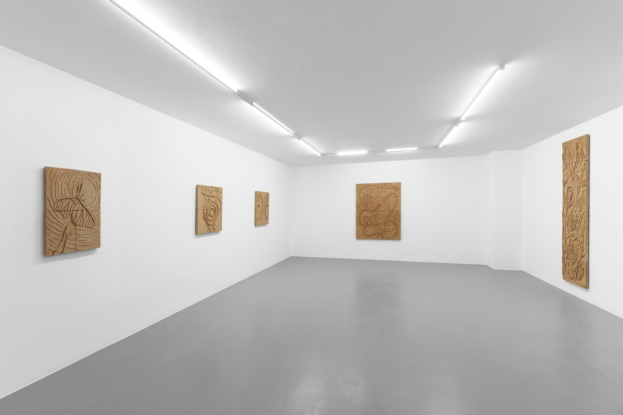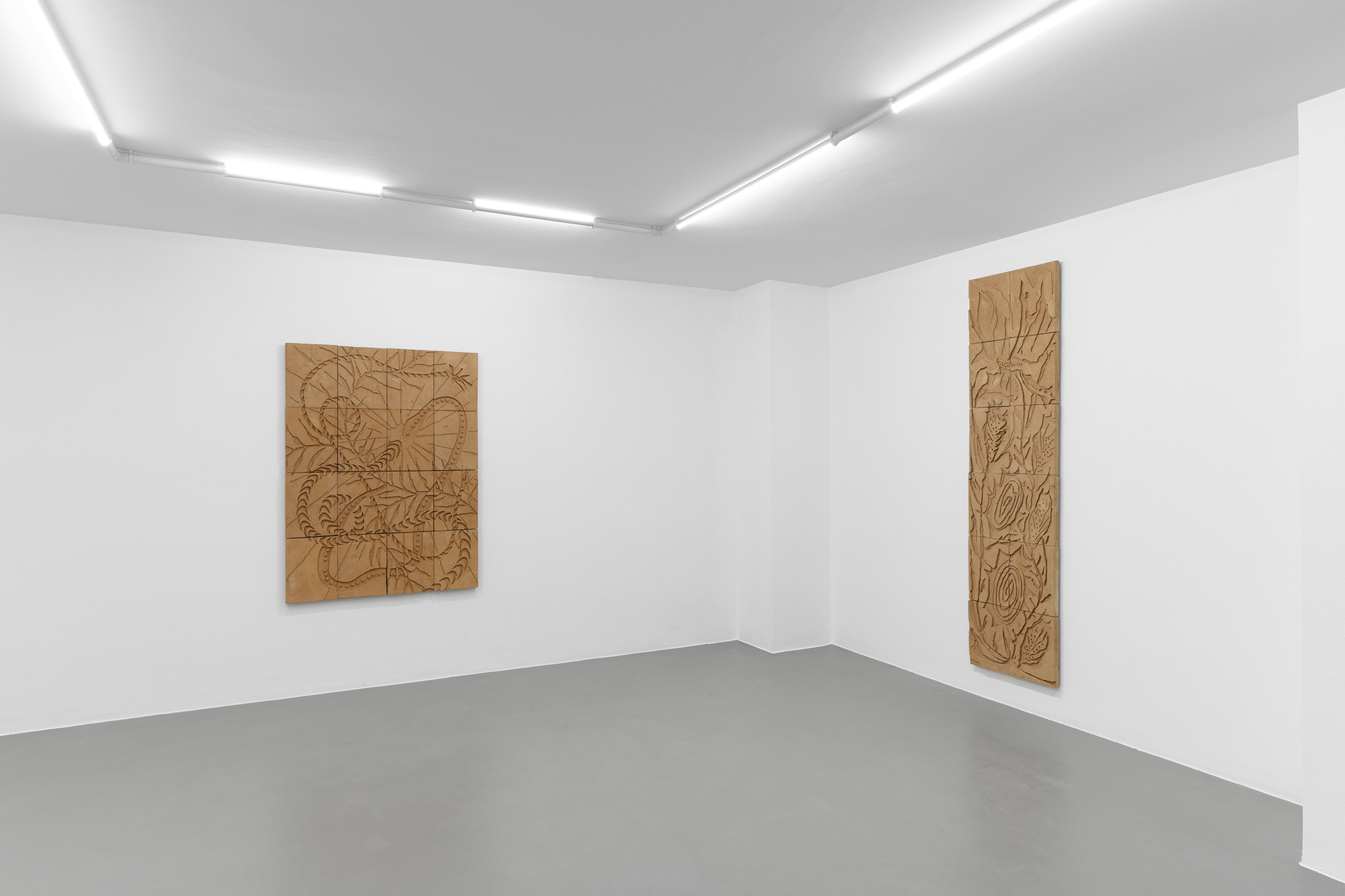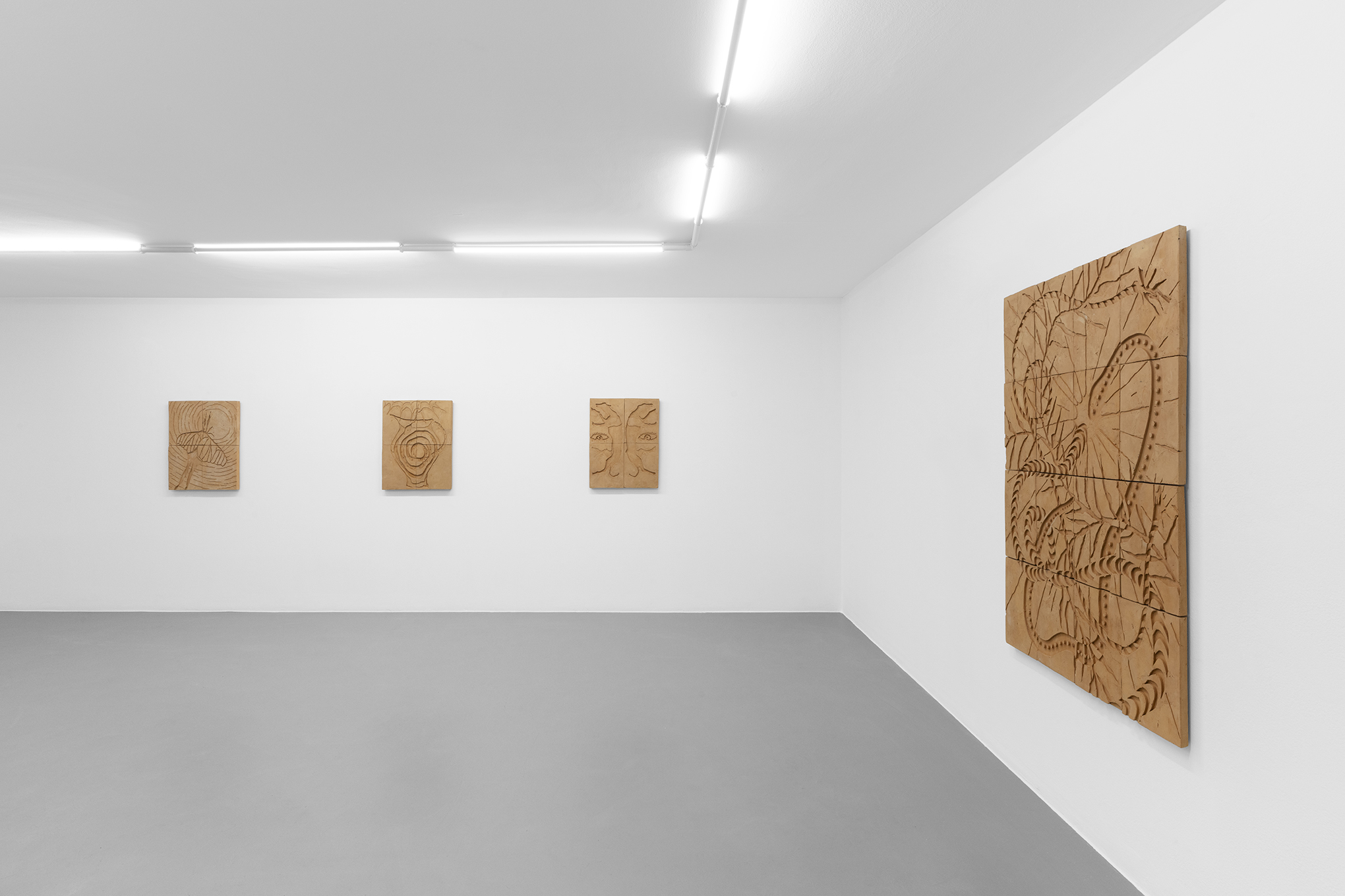 The wall-based works belong to a cycle entitled Background / Foreground, consisting of glazed or natural clay bas-reliefs where fictional narratives unfold across juxtaposed tiles. The complex iconographic system—featuring animals, anatomical elements, and objects of worship—interweaves personal stories with popular or seemingly trivial symbols, essential in shaping a shared memory capable of defining communities and cultures.