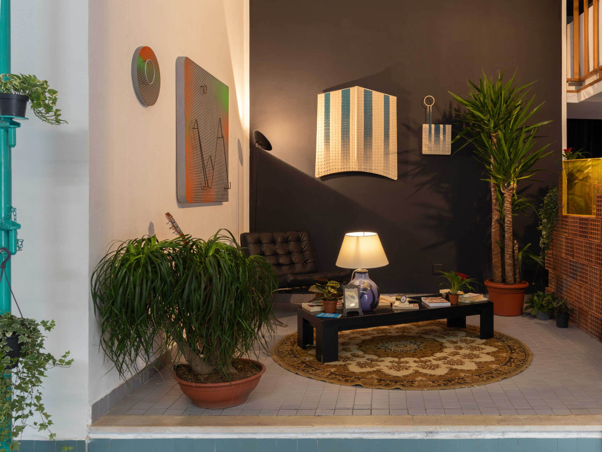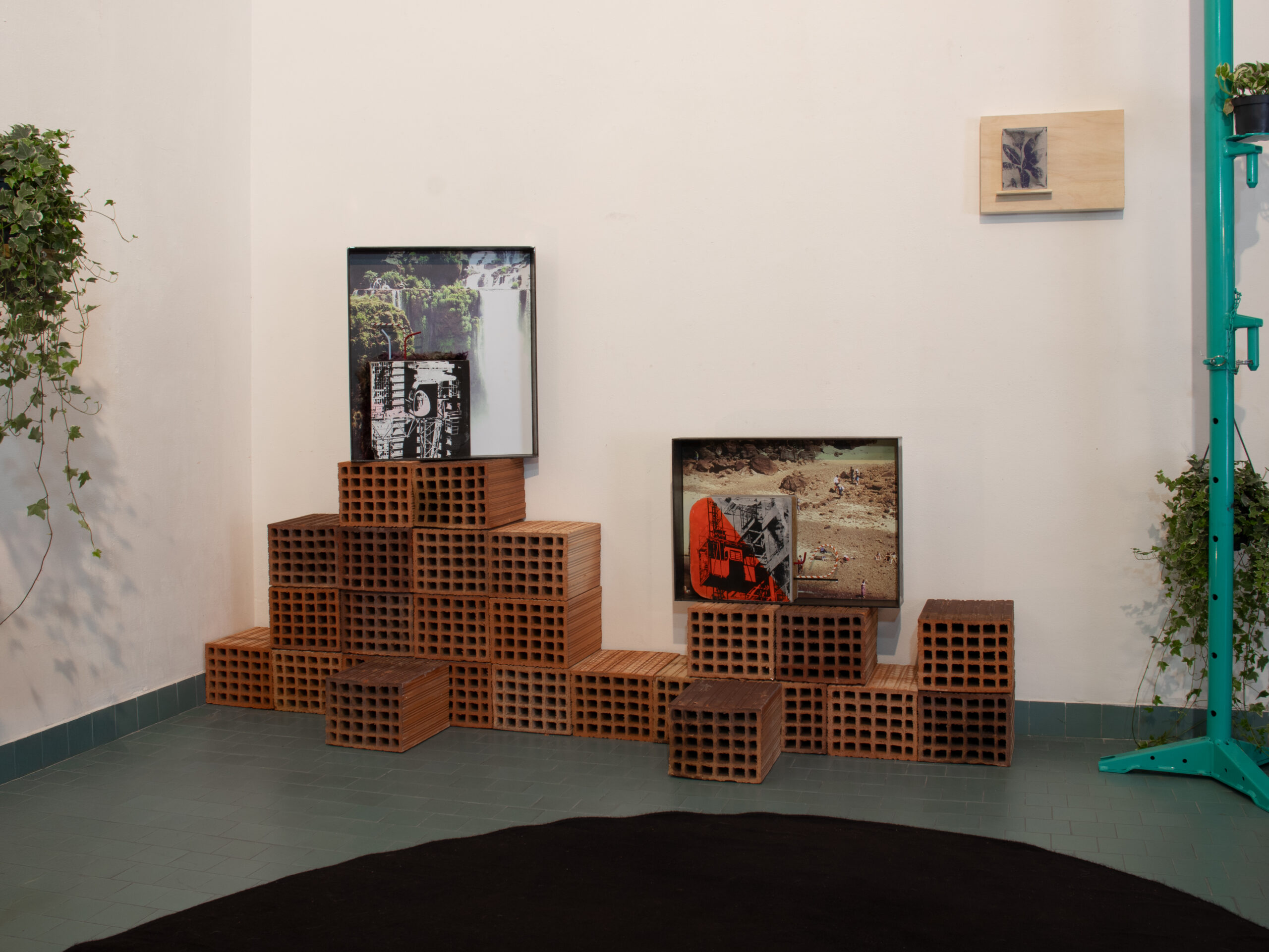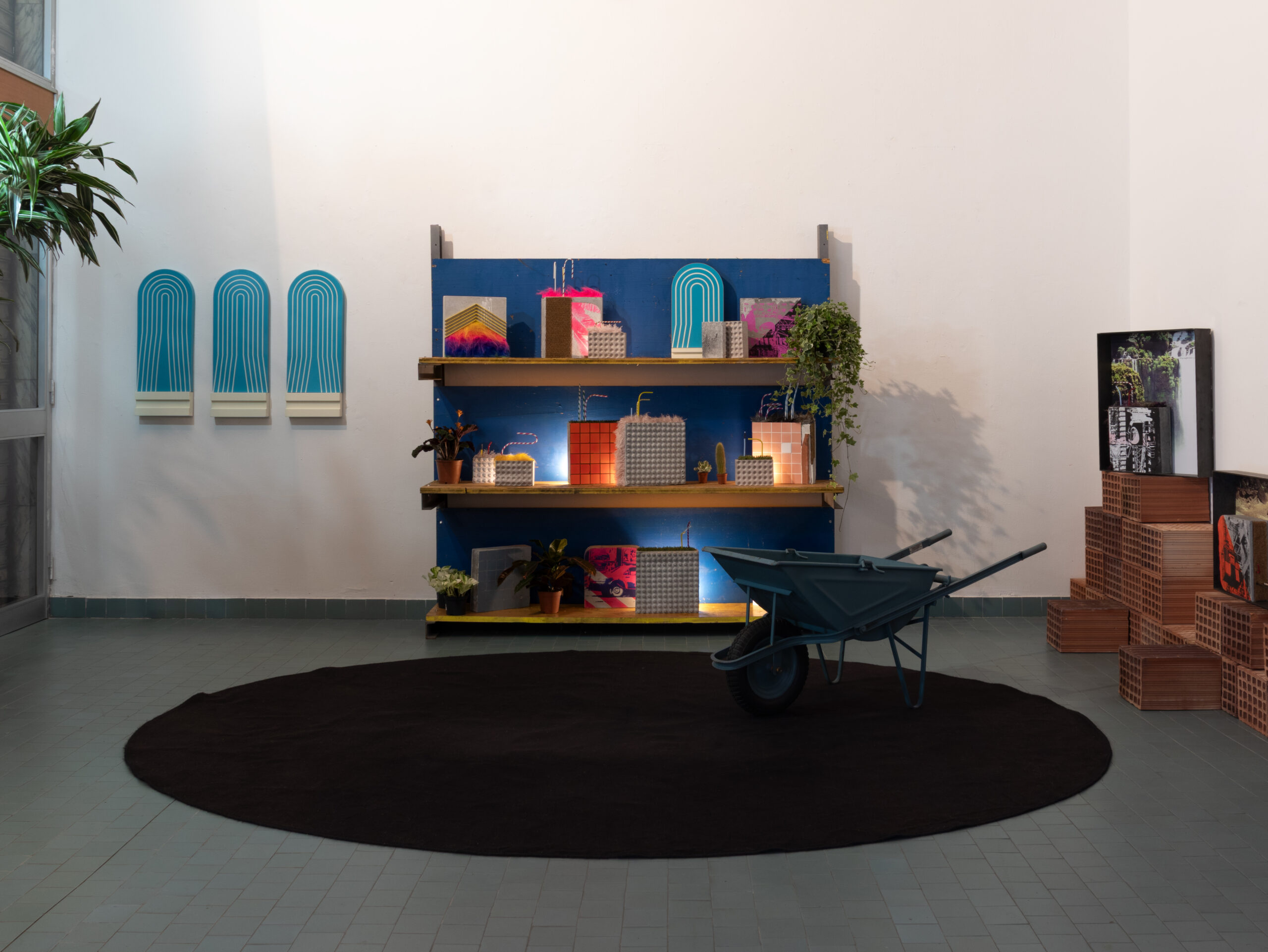 years of artistic research, creating a dynamic and cohabitative narrative. The exhibition, designed in the form of a construction site and habitat container, ranges from the tactile comfort of a domestic interior to the harshness of the workplace, creating a short circuit between the work and the viewer. Francesco Meloni uses different media, demonstrating a strong aptitude for free philosophical research; photography, painting, installation, sculpture, performance, and music merge together and play at transcending their formal limits, producing hybrid works that speak the language of the living mind of the world. The built habitat becomes a physical manifestation of the construction site as a mirror of existence. From documentary photographs to the latest tiles/totems, the works are tangible objects of highly refined conceptual studies on reality and human dynamics. It is as if the worker, from the height of the blue tiles of his construction site, could grasp the essence and beauty of life.