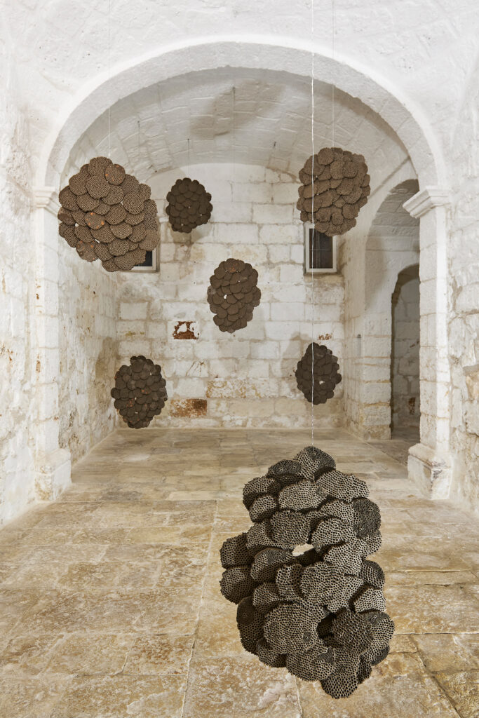 Mente Alveolare Mente alveolare20269 sculture, argilla e filo d’acciaioDimensioni Variabili Geometria del rigore o poesia del respiro – Un insieme di alveari sospesi, così si presenta Mente alveolare l’opera di Donato Trovato nell’ambiente di Exchiesetta. Altorilievi modulari in terracotta, una concatenazione di moduli allacciati con precisione matematica in un corpo unico, frutto di un lungo […]
