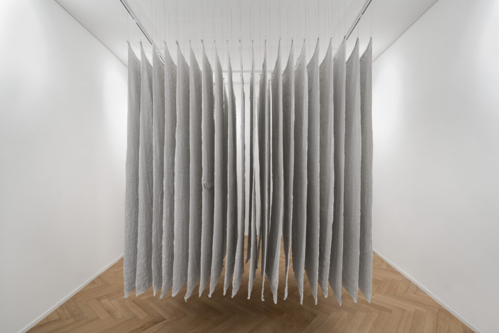 Quaranta sacchi di juta bianchi in due file da venti Elia Varini’s work enters into a conversation with the LAB exhibition space.It is an exploration of form and color in relation to the architectural space and the viewer’s perception.