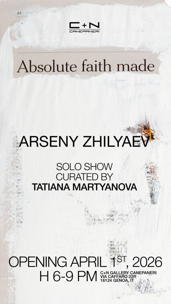 Absolute Faith Made On April 1, 2026, the C+N Gallery CANEPANERI presents “Absolute Faith Made”, a new solo show by Arseny Zhilyaev, at its Genoa venue. Curated by Tatiana Martyanova, the exhibition centers on key works from the ongoing series “Behind the Fog of War There Is Always Pain” (2022 – ongoing), alongside new and […]