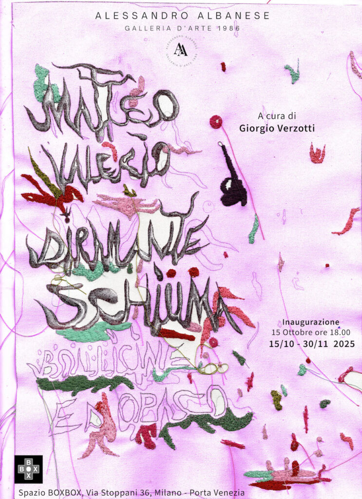MATTEO VALERIO. Diramante Schiuma Bollicine ed Opaco Dal 15 ottobre al 30 novembre 2025, la Galleria Alessandro Albanese presenta la mostra Diramante Schiuma Bollicine ed Opaco di Matteo Valerio, a cura di Giorgio Verzotti. L’esposizione segna l’inaugurazione ufficiale di BOXBOX, il nuovo spazio della galleria nel cuore di Porta Venezia a Milano.Nato dalla collaborazione […]