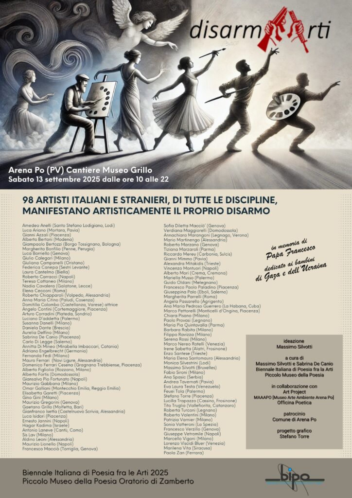 disarmArti oltre 90 artisti di tutte le discipline manifestano artisticamente il proprio disarmo in memoria di Papa Francesco dedicato ai bambini di Gaza e Israele a cura di Massimo Silvotti e Sabrina De Canio sabato 13 settembre 2025, dalle ore 10.00 alle 22.00 Cantiere Museo Grillo, Arena Po (PV) Sabato 13 settembre, ad Arena Po, […]