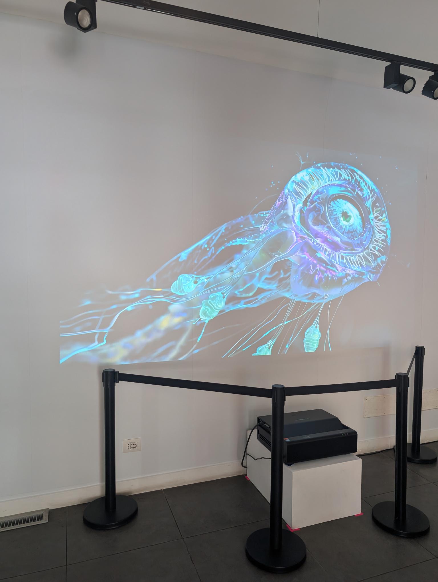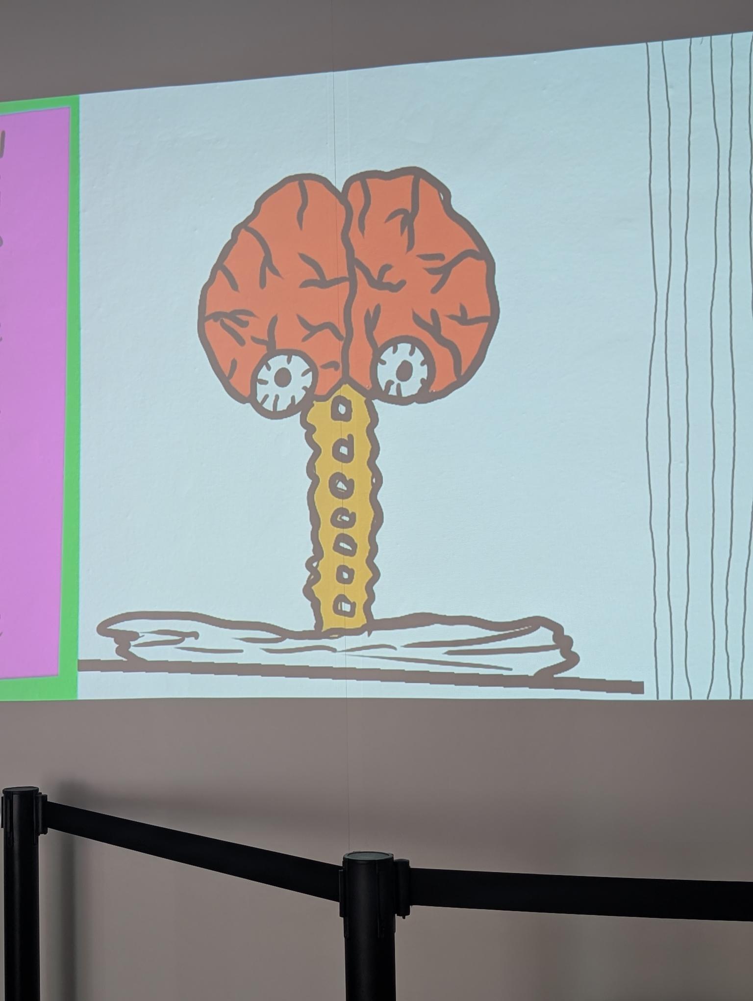 On the same screen, appears the video Nibble Nibble (2025) by Rae Jung Sim. Although initially playful, the image quickly fractures, revealing the exposed viscera of the brain in a palette of cheerful colors.