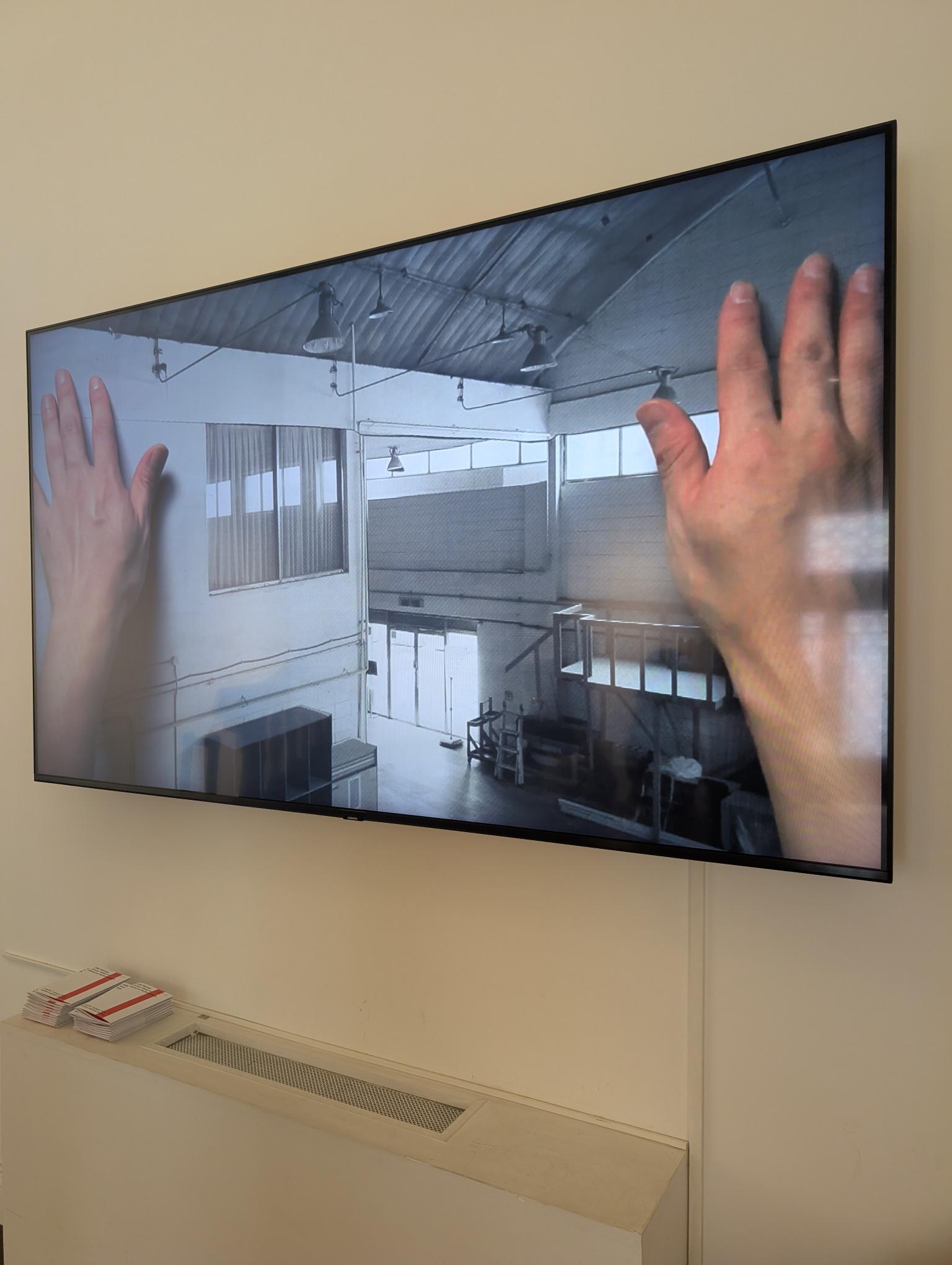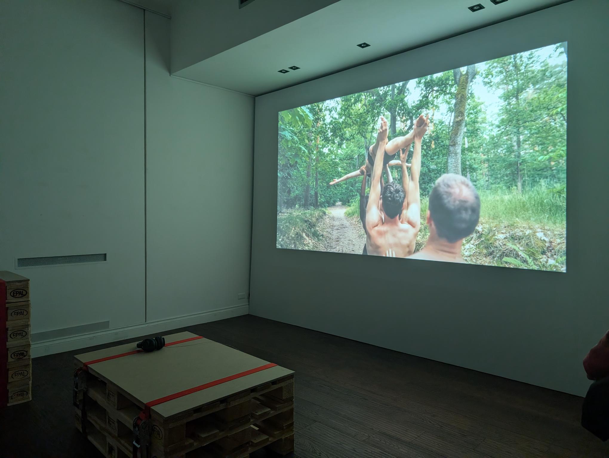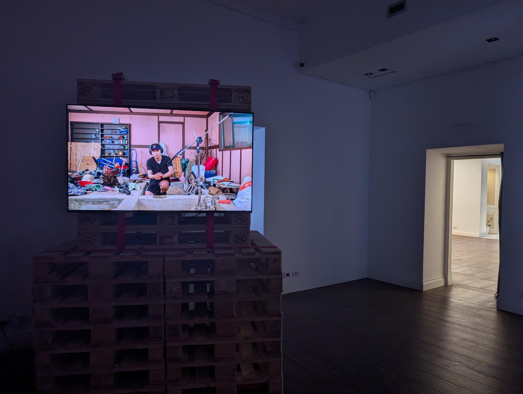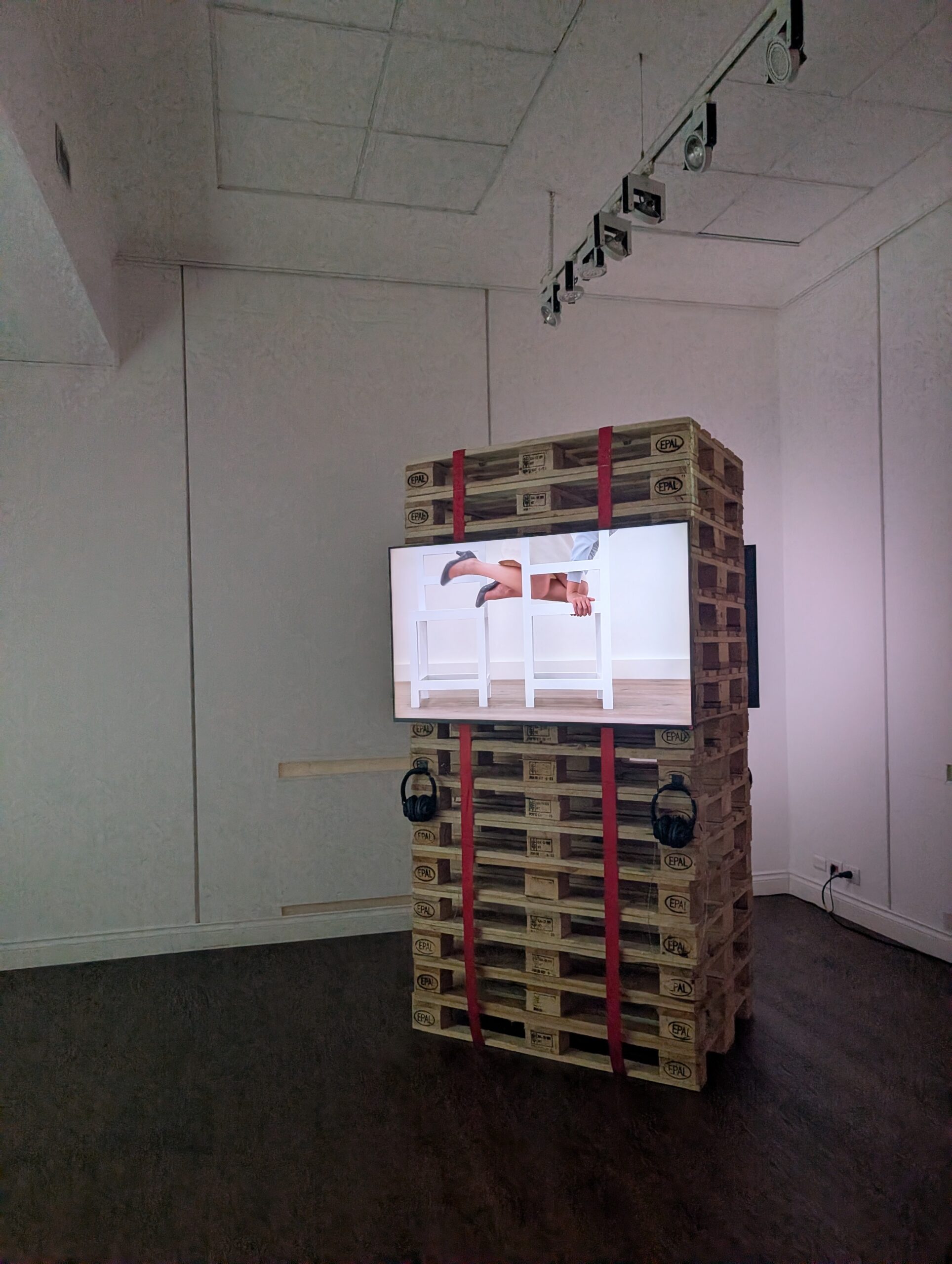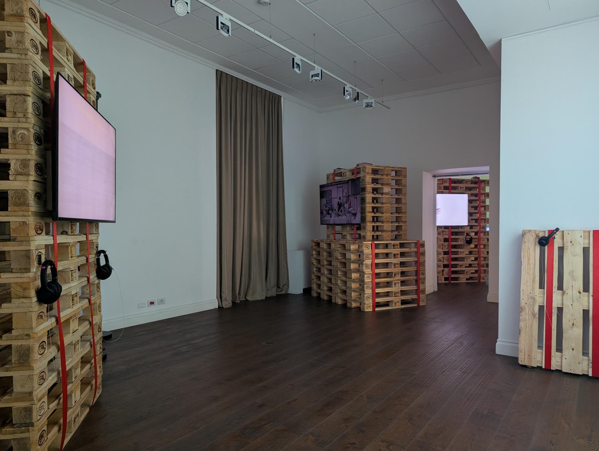 The exhibition consists exclusively of video works, distributed across several darkened rooms and hung on stacked Europallets, with the aim of amplifying the sense of transience and movement within the display.