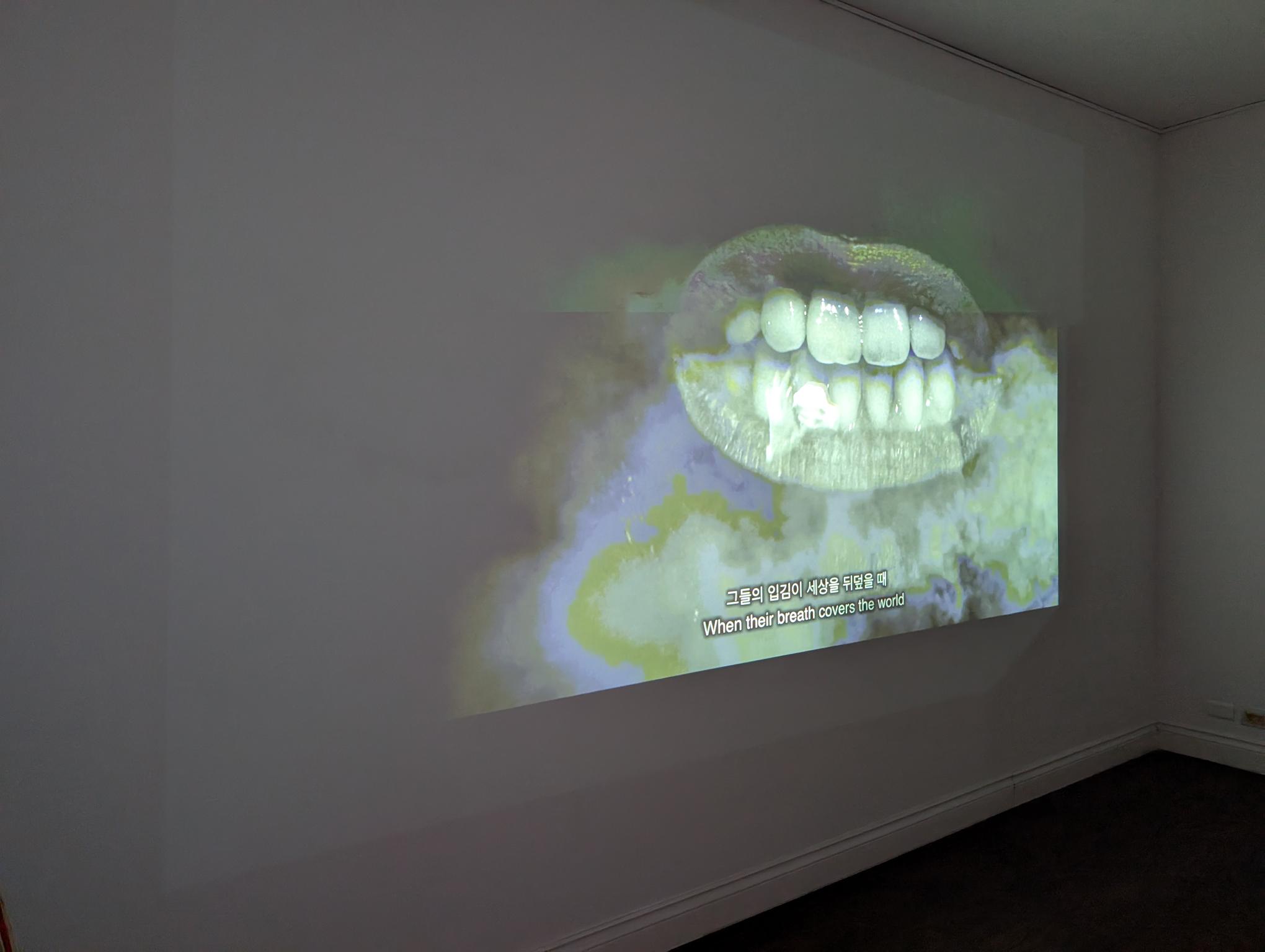 They arrive. Silently, quickly (2016) by Ji Hye Yeom is a turbulent accumulation of cutouts with stylistic references to film noir, created as an echo of the 2015 MERS coronavirus (Middle East Respiratory Syndrome) epidemic. A slow-motion portrait of a gorilla and human hands gesturing in sign language intertwine with a clenched female jaw emerging from the darkness amid dense smoke, declaring: “They are life and non-life. If we don’t exist, they don’t exist. If we die, they also die. They are very terrifying. […] They are coming. Be careful.” Then it disappears into the darkness.