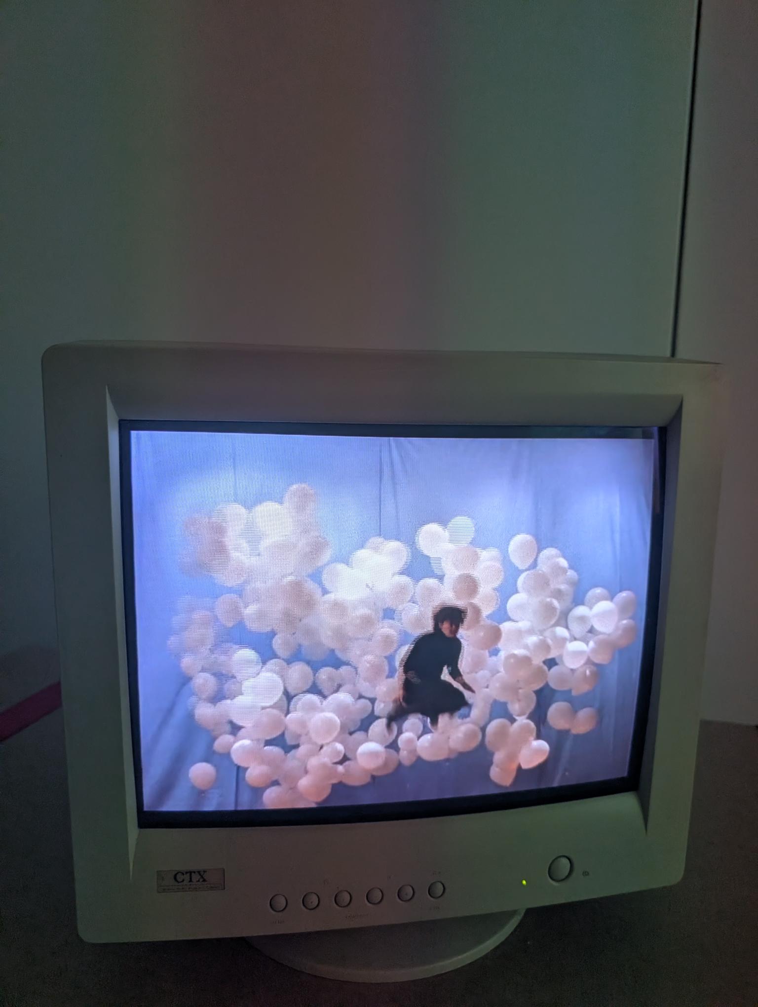 Going Far (2005) is a work by Jaye Rhee in which the artist appears to float from left to right across the center of the screen filled with white balloons. Not everything is as it seems: the scene originates from a performance in which the artist performs numerous jumps, carrying out meticulous physical work followed by careful editing. The result is a video whose core lies in the illusory nature of representation.