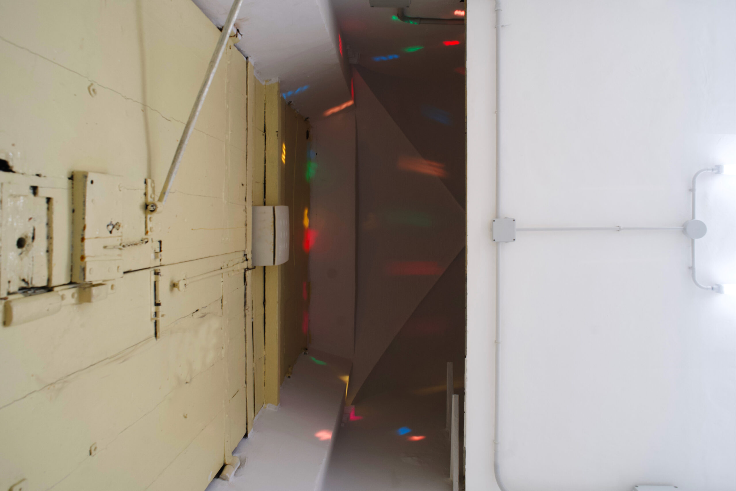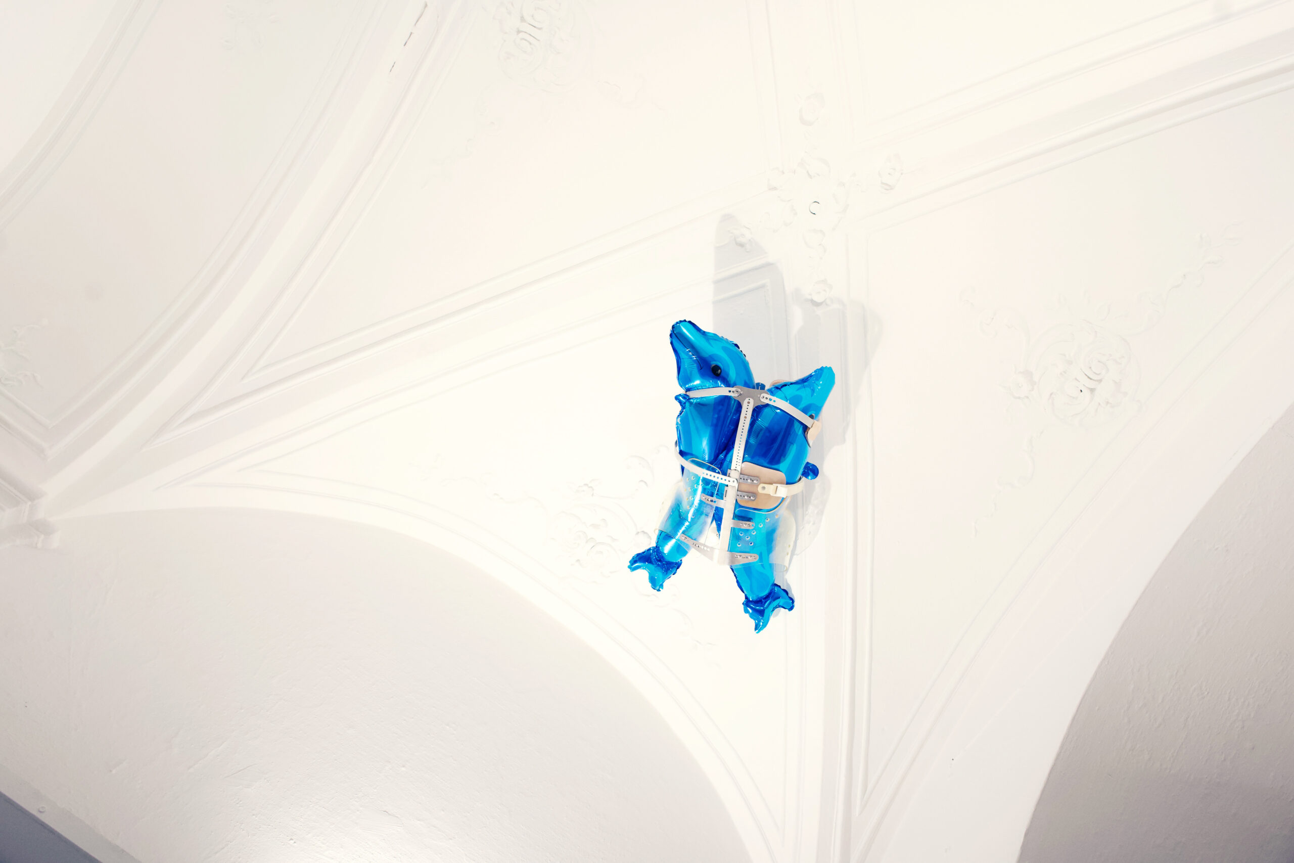 In foot drop, using pairs of objects, Basso creates what he defines as associative shorthand – an immediate, instinctive, at times grotesque visual writing capable of colliding non-linear directions of meaning. Where a dolphin inflates to fly into the sky, an orthopedic brace arrives to ‘contract to correct a brother’, then again, organ pipes held together by a black leather whip, some amplifying devices echo silently to a strobe light; in this sense, the exhibition space is to be understood as a layered set of relationships between objects, rather than as a mere place where a few stand-alone works are exhibited.
