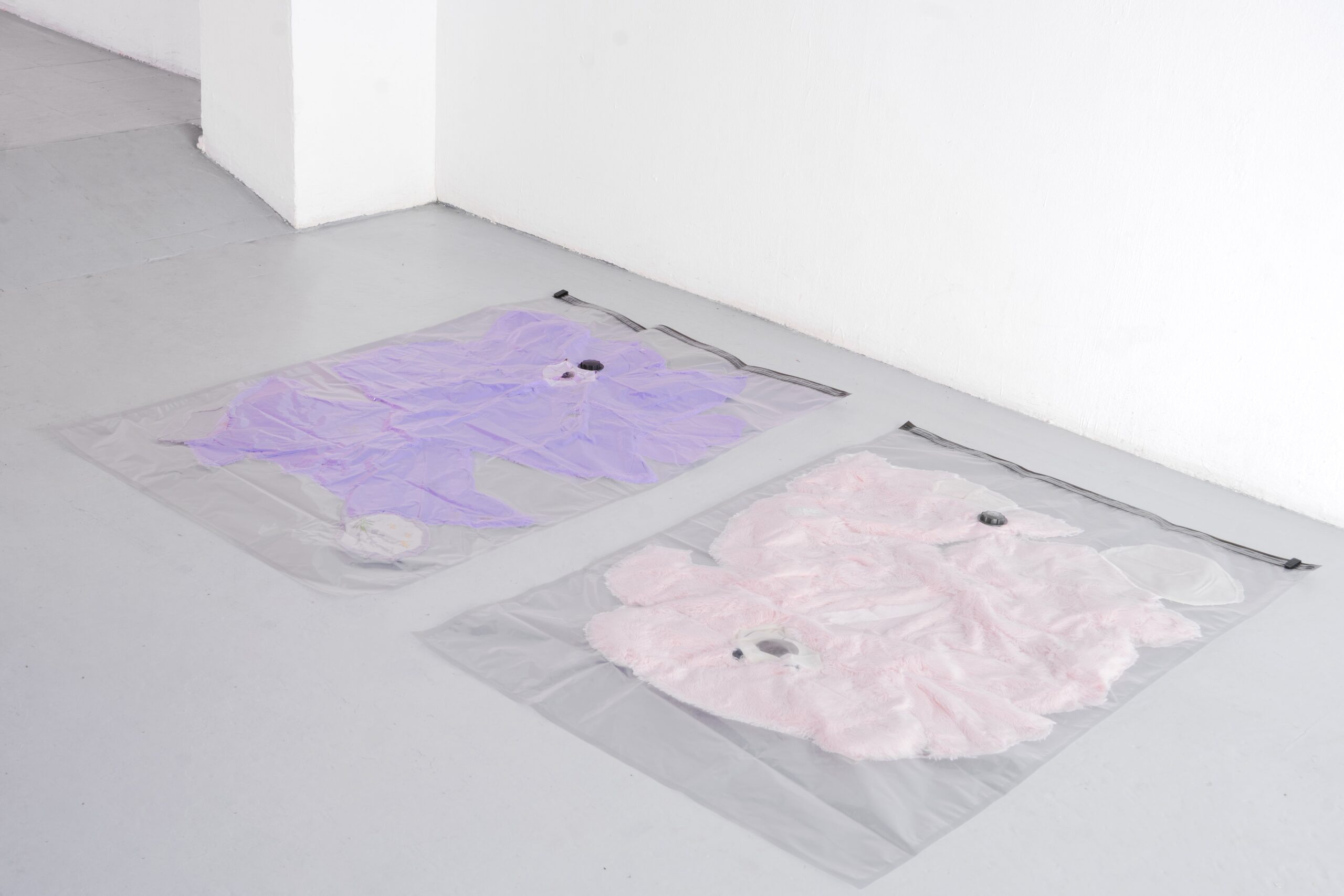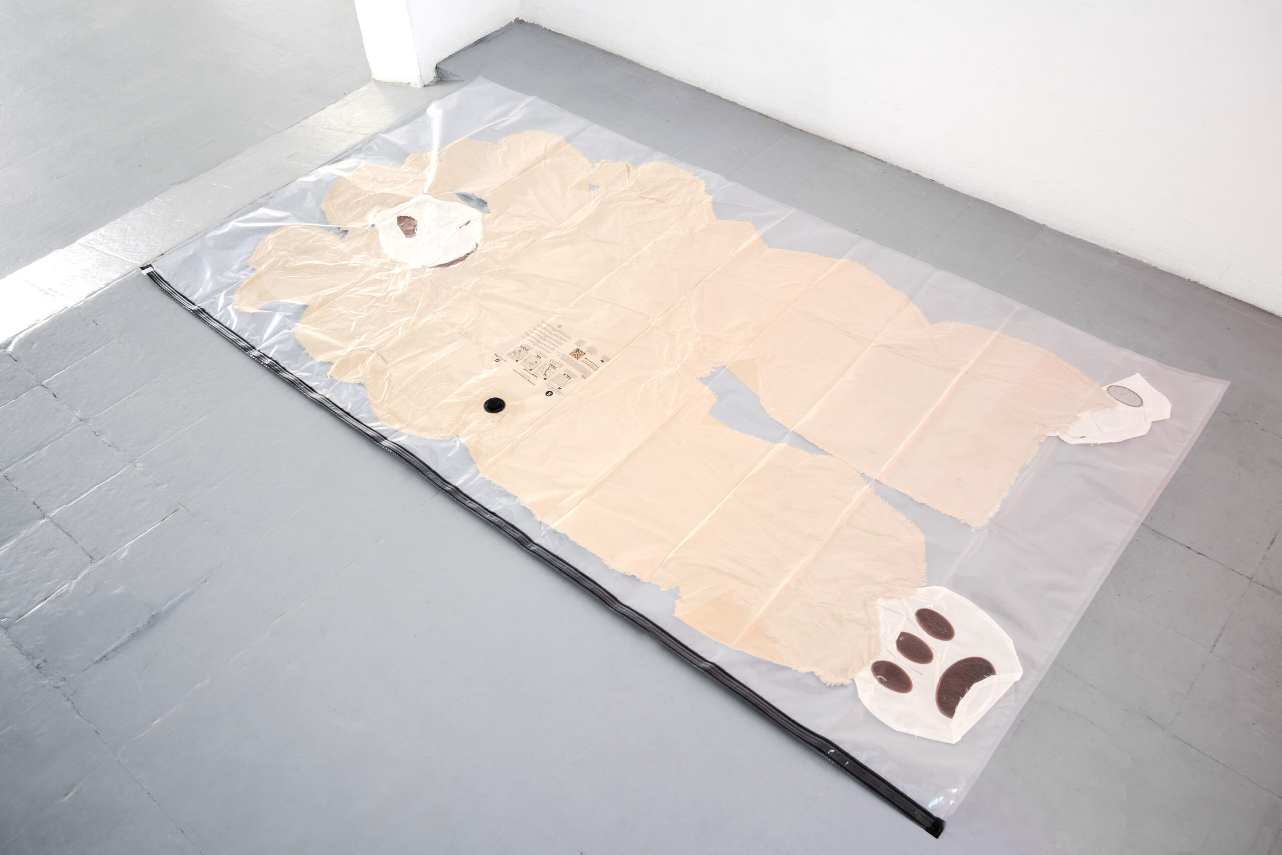 Gelateria Sogni di Ghiaccio presents “Frammenti di un discorso amoroso” (A Lover’s Discourse: Fragments), a spatial composition of objects and moving images by Enrico Boccioletti. The installation borrows its title from Roland Barthes’ famous essay (1977), staging the emotional expenditure we devote to childhood objects, a phase of radical intensity that precedes and resists the normativity of linguistic and social contexts. “Frammenti di un discorso amoroso” begins with the discovery of a notebook containing sketches made by the artist during his preschool years. Its protagonists are Gaveri Roferoff and Grattocchia, mythical figures who, in the artist’s childhood imagination, preside over the cycle of day and night, manipulating meteorological and elemental events, thus influencing human affairs. Playing with the conventions of autotheory, Boccioletti uses the sketchbook as a starting point to construct a medium-length animated film in which macro shots of these figures alternate with images of clouds created using the pinhole technique, a process dating back to the early days of photography. The editing simulates the unstable movement of a handheld camera, while the already claustrophobic depth of field is further compressed in post-production, creating a feeling of forced proximity. The images are accompanied by a sound composition consisting solely of acoustic feedback, which amplifies the perceptual tension of the work and contributes to creating a suspended, at times disturbing atmosphere. Within the same exhibition space, there are three plastic assemblages: teddy bears of different sizes and colours found in flea markets, emptied of their stuffing and compressed into domestic vacuum bags. Morphologically altered, deprived of air and its usual softness, the teddy bear betrays its promise of love and reassurance, revealing a second, harsh and overwhelming nature. The exhibition is conceived as an exercise in elusive storytelling, poised between improvisation and clairvoyance, in a counterpoint of references that explore self-referentiality, daydreaming, abstraction and mythopoesis. By overturning the conventions of childhood memory, Frammenti di un discorso amoroso presents itself as a fragmented narrative in which darkness and tenderness coexist ambivalently, resisting univocal interpretation and the clichés associated with the world of childhood.