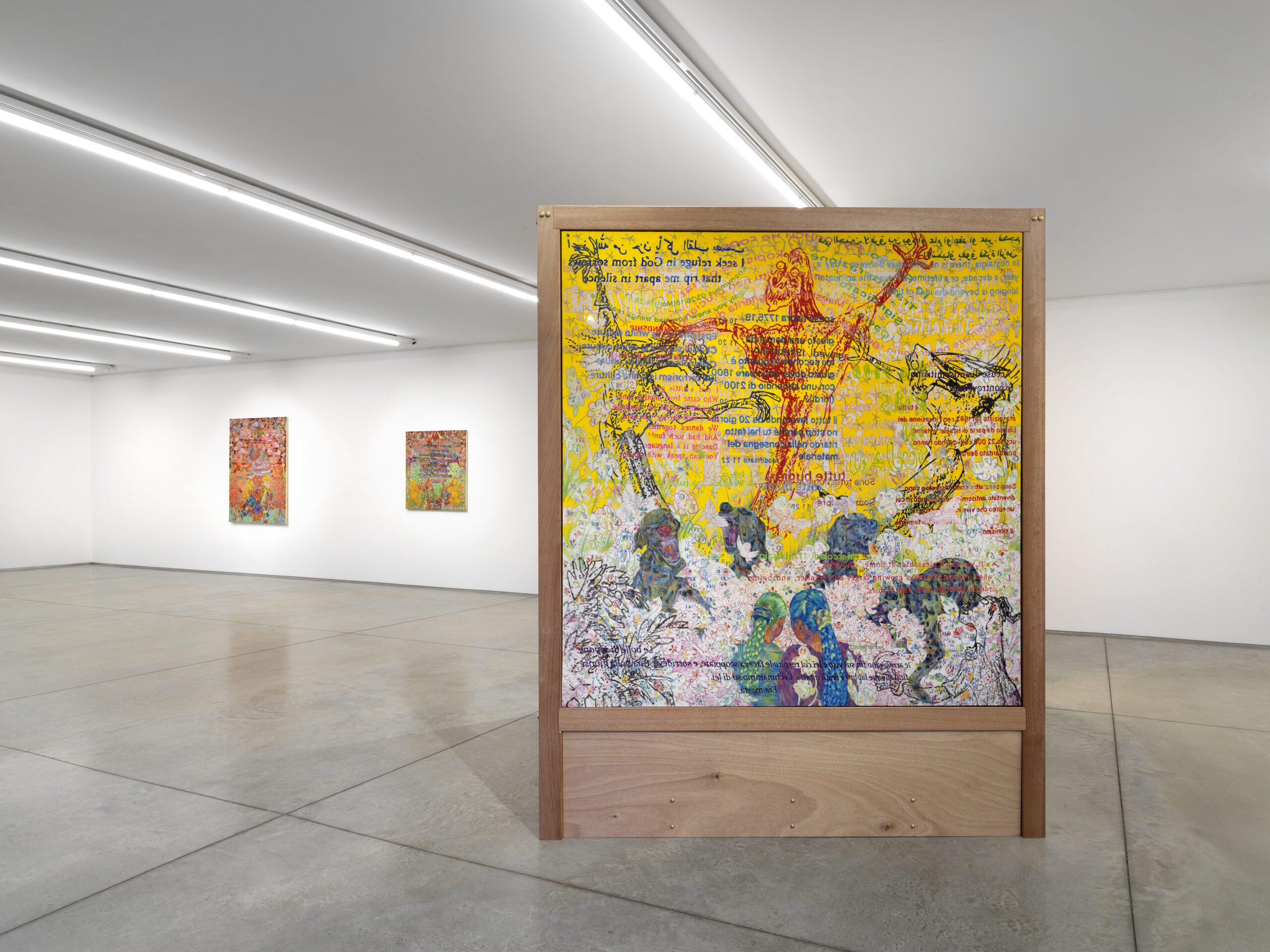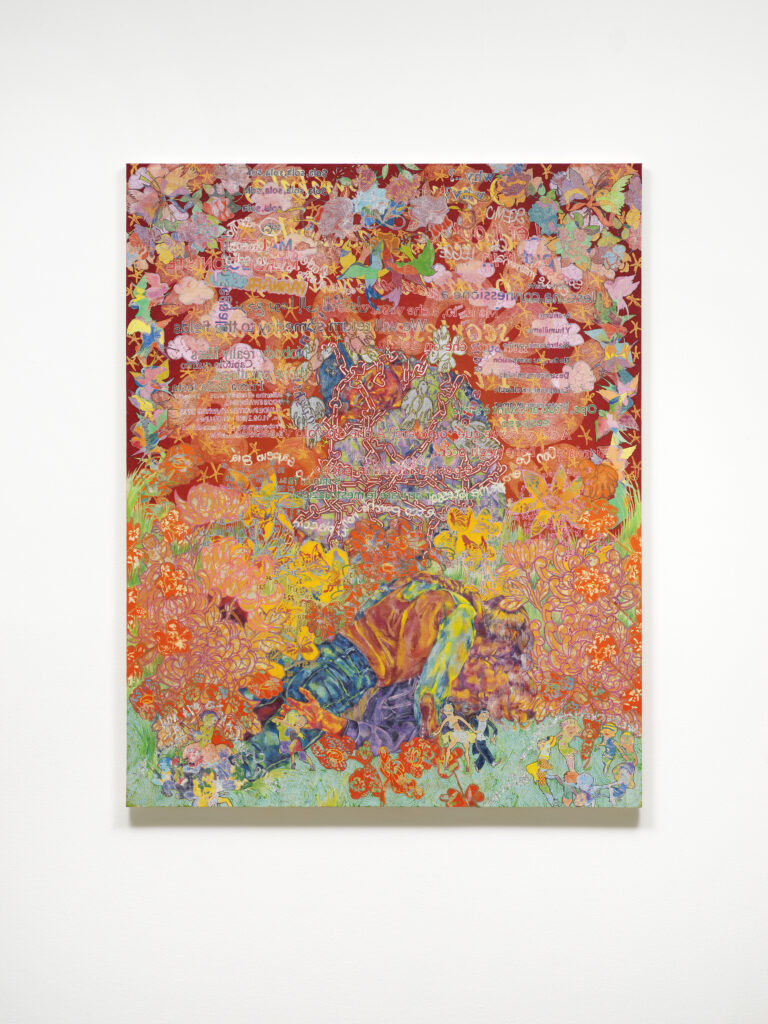 The final result is a rich, luminous, positive aesthetic, yet the painter is keen to point out that this is “a misunderstanding”: the anger and dissent that drive her practice have in fact made the inclusion of written words necessary, in a kind of internal struggle between a fantastical imagery and unequivocal language. Within this dichotomy, the canvas is torn apart, struck and pierced everywhere: “cannon fodder.”