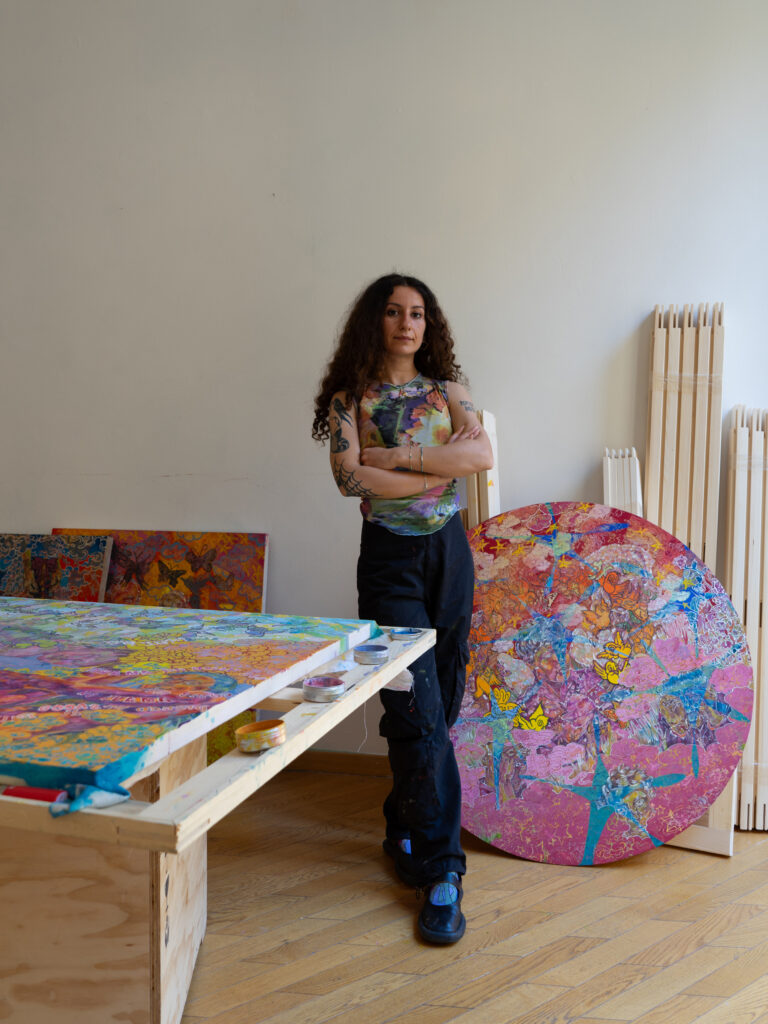 left: Giuditta Branconi, Mi ricordavo più felice di così / I remembered being happier than this, 2025, olio su lino / oil on linen, © Giuditta Branconi, Courtesy the artist; L.U.P.O Gallery, Milan, Ph. Dario Lasagni / right: Ritratto di Giuditta Branconi / Portrait of Giuditta Branconi, Ph. Pietro Cisani