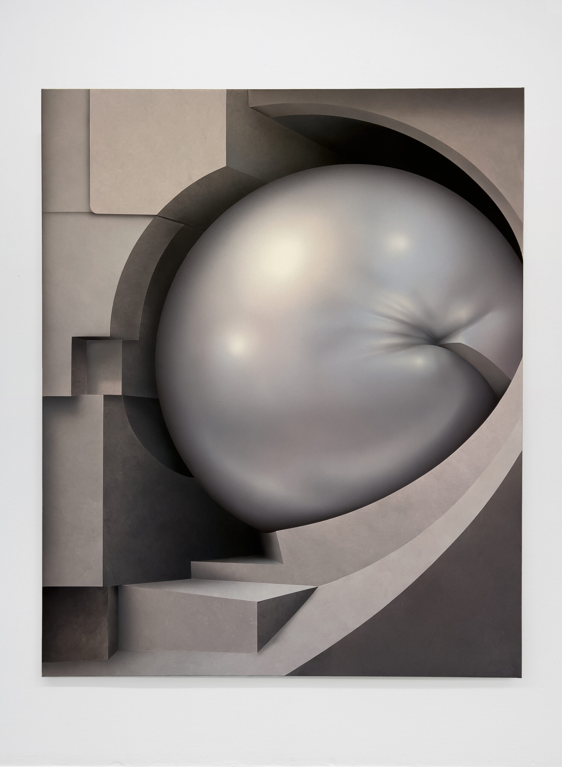 Painting is the privileged medium through which this condition of suspended tension is explored. The canvases on display, created specifically for the exhibition, feature abstract representations in which biomorphic round forms appear to be restrained and compressed within mechanical structures or architectural elements – recesses, niches, cavities. The constriction that bends and compresses the material of these rounded presences makes them look like soft entities on the verge of exploding; however, the cold pearly and metallic tones chosen by the artist manage to contain and temper the latent energy that could lead the composition to disintegration.