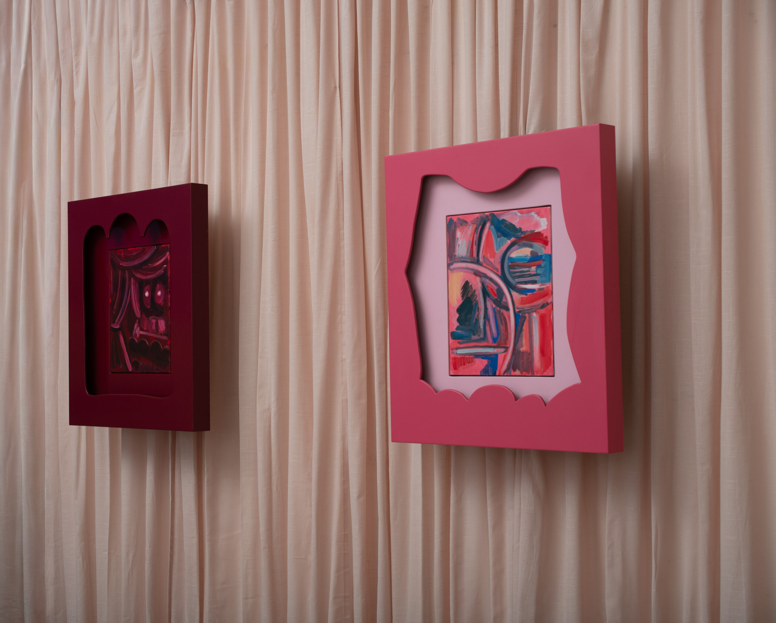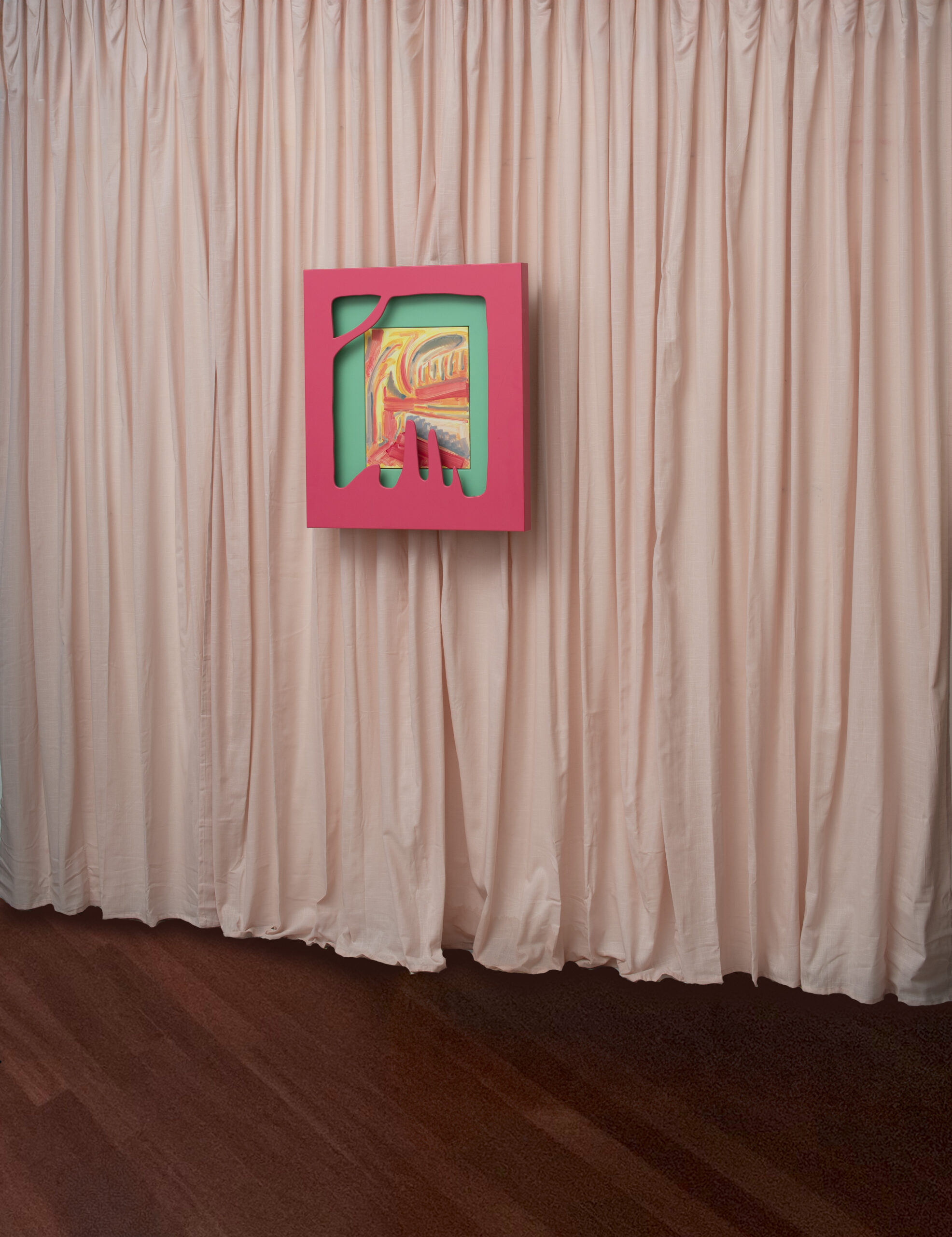 Nello spazio espositivo, morbide tende rosa avvolgono le pareti, trasformando la galleria in un ambiente teatrale e intimo. I dipinti sembrano fluttuare su questa pelle di tessuto, sospesi tra occultamento e rivelazione. Questo gesto estende l’esplorazione del palcoscenico e della superficie, la tenda diventa sia confine che soglia, facendo eco alla nozione di Butler dell’identità come illusione recitata piuttosto che verità interiore. All’interno di questa delicata architettura, lo spettatore si muove attraverso strati di esposizione e travestimento, dove il sé, come l’immagine, non viene mai completamente svelato.
