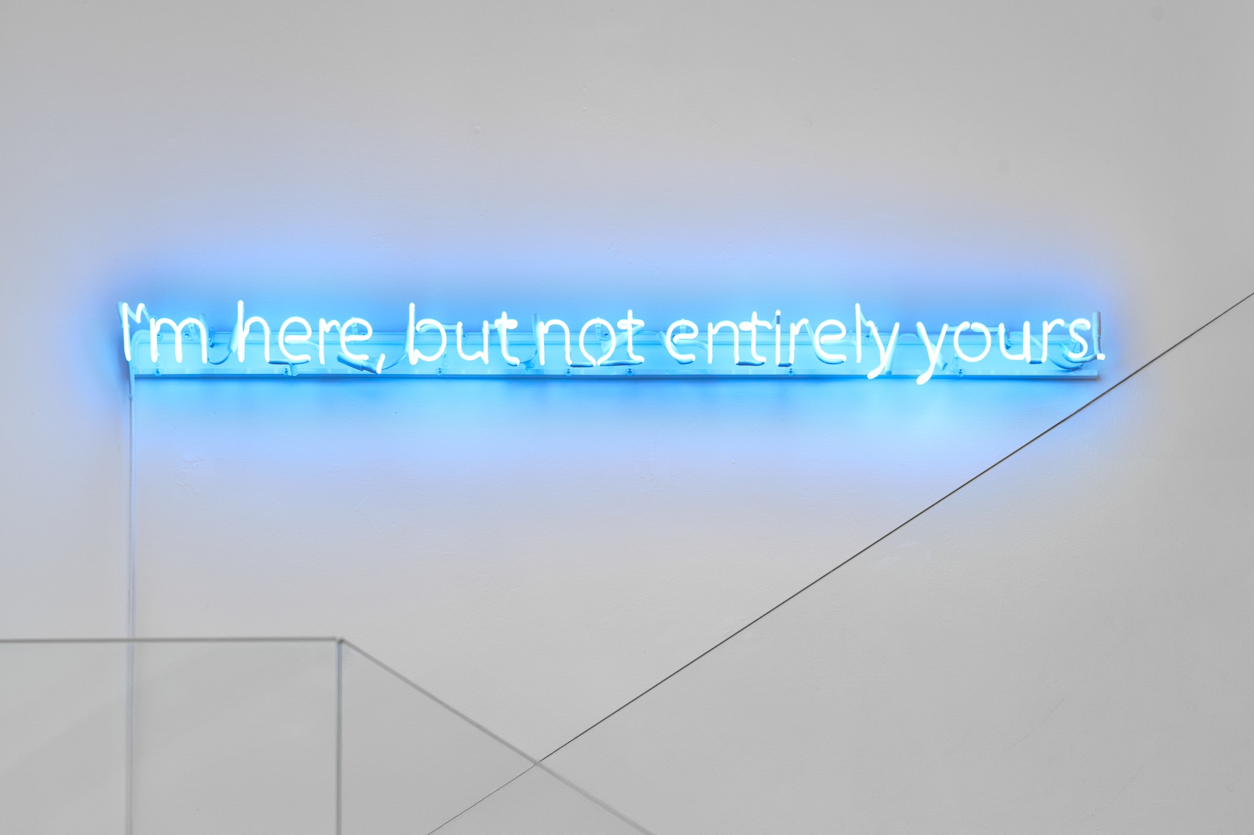 The neon work I’m here, but not entirely yours, which also gives the exhibition its title, immediately introduces this ambivalence. The sentence declares an incomplete presence, a willingness that is stated yet simultaneously withheld. The light-blue colour—typical of digital and corporate environments—reinforces the ambiguity of the message: reassuring on the surface, yet emotionally distant. Here quitting manifests as partial presence: a body that remains, a will that withdraws; an execution without identification; a form of presence that refuses to be entirely surrendered. In Fisher’s terms, this can be understood as a response to the constant demand for enthusiasm and engagement that transforms affect itself into performance.