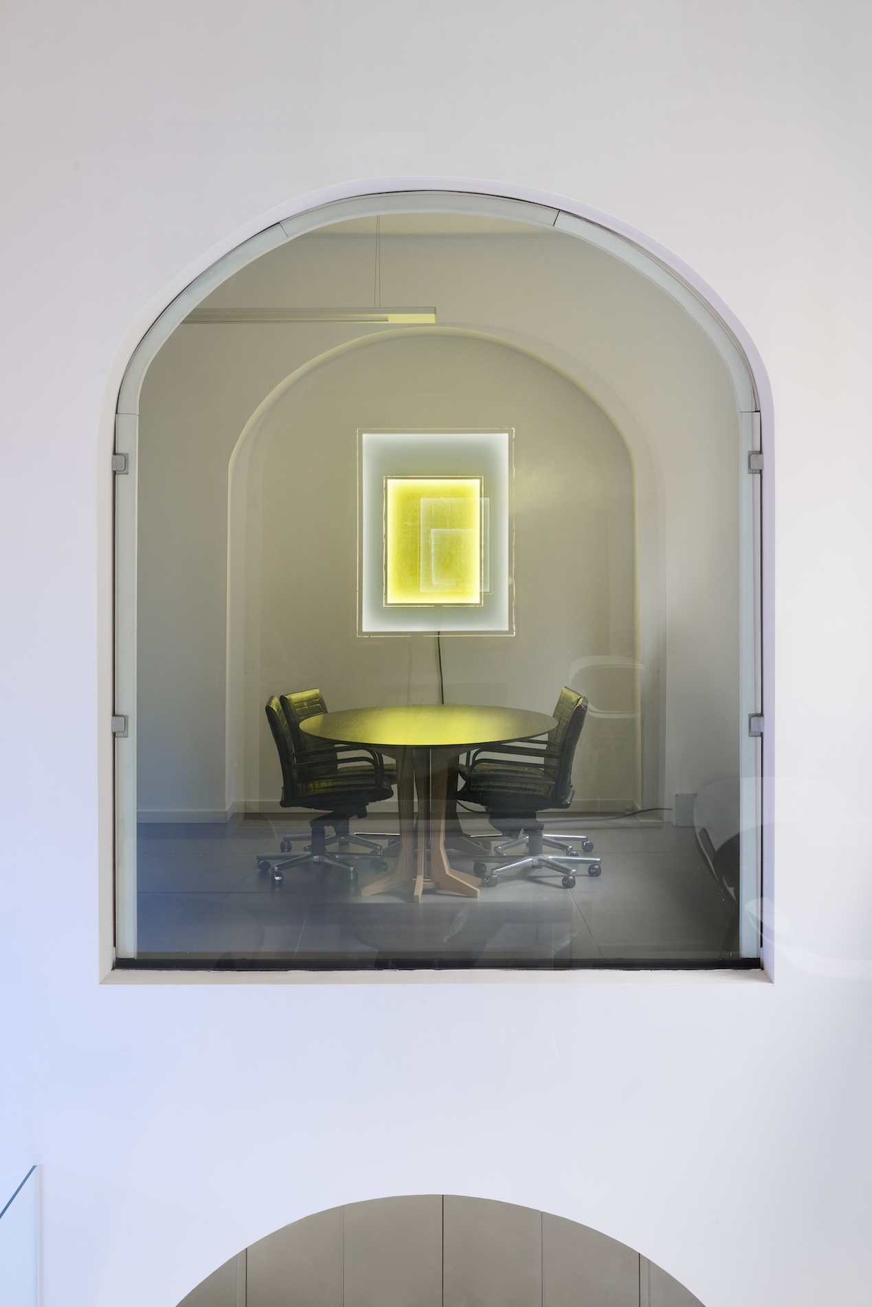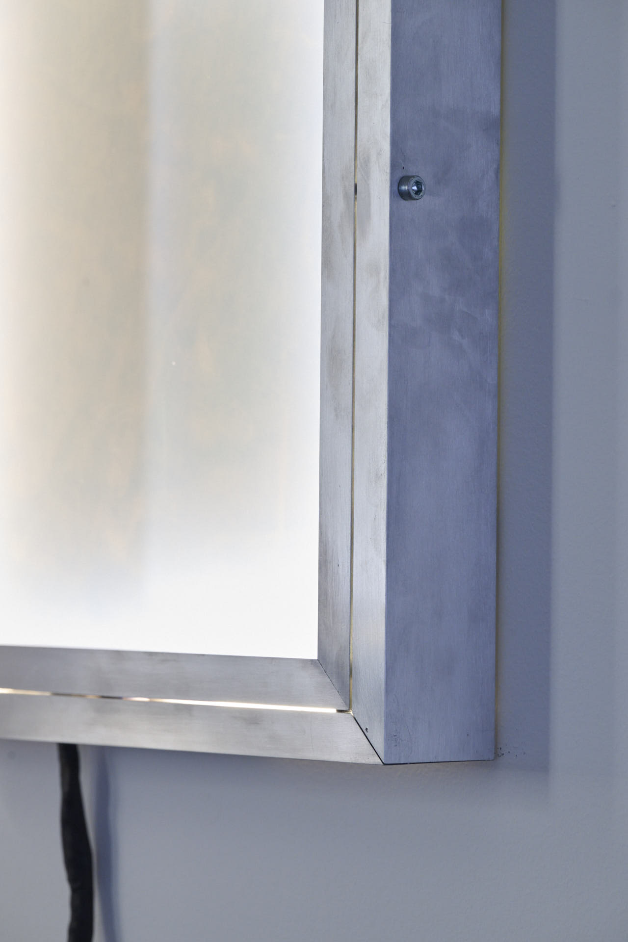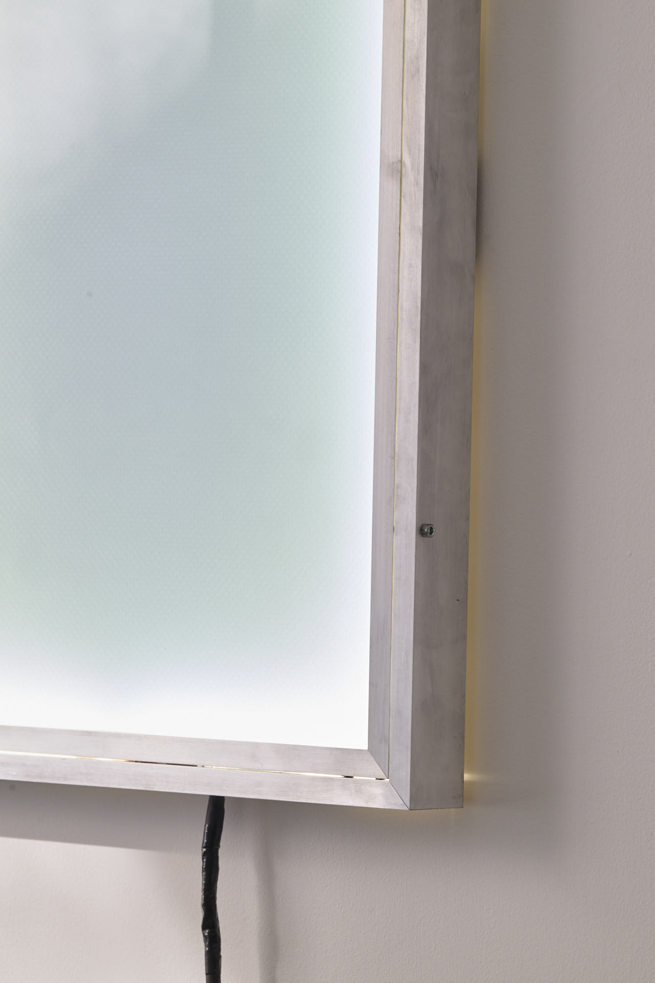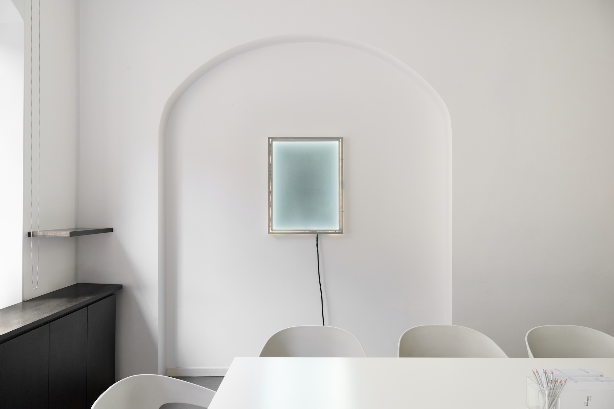 The series of monochrome bulletin boards shifts the reflection onto a perceptual register. Materials associated with hobbies and leisure activities are compressed into compact, apparently uniform surfaces. Here the monochrome is not abstraction but compression: a field of tension in which the image withdraws, allowing what remains marginalised in labour to surface. The switchable glass that darkens as the viewer approaches introduces a dynamic of mimetic frustration: the more one attempts to see, the less one sees. As in the world described by Fisher—where access to desire is continually promised yet systematically deferred—the subject’s identity appears trapped within an ongoing process of self-obscuring.