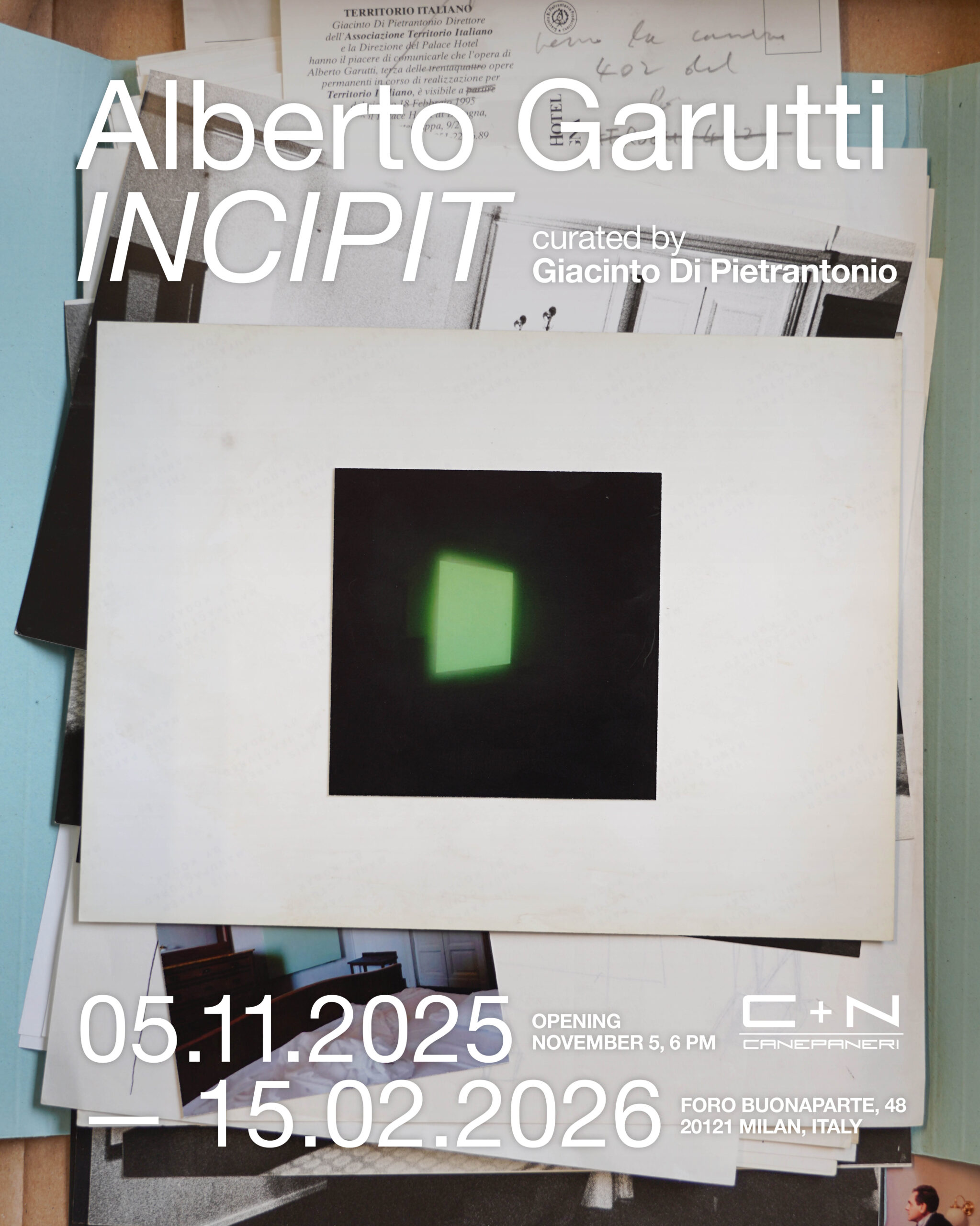 C+N Gallery CANEPANERI is pleased to announce INCIPIT, an exhibition dedicated to Alberto Garutti, curated by Giacinto Di Pietrantonio. Thanks to the collaboration with Studio Alberto Garutti, the exhibition presents a selection of works accompanied – for the first time since the artist’s passing – by groups of fragments and archival materials, selected to restore form and context to one of the seminal works in Garutti’s career: “Opera per camera da letto: dedicato a chi dorme” [Bedroom work: dedicated to those who sleep]. Conceived in 1995 for room 402 of the Palace Hotel in Bologna, as part of the widespread exhibition Italian Territory – a pioneering and radical project envisioned and curated by Giacinto Di Pietrantonio between 1993 and 1996 – the work is one of Garutti’s first to be conceived for a non-institutional space.