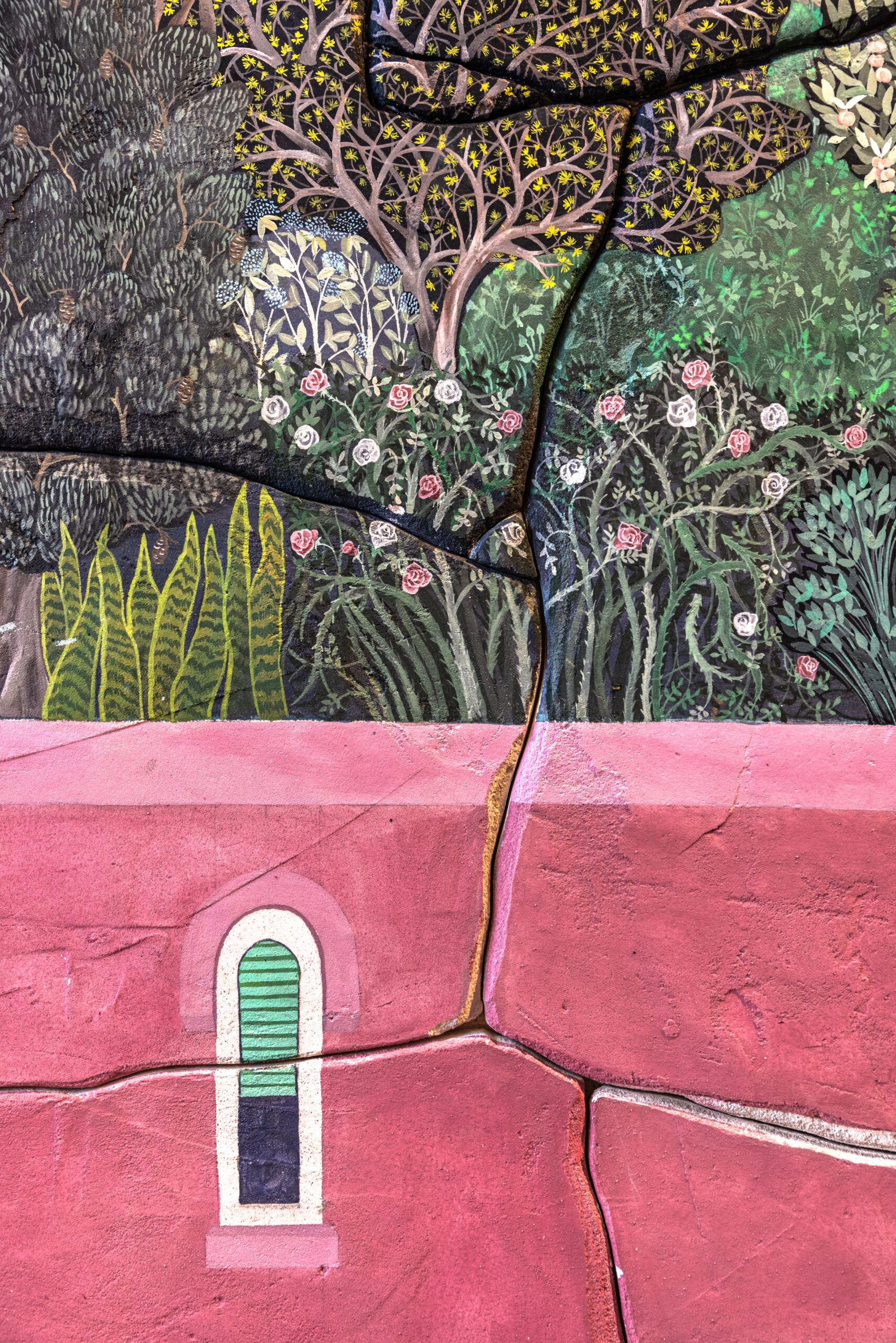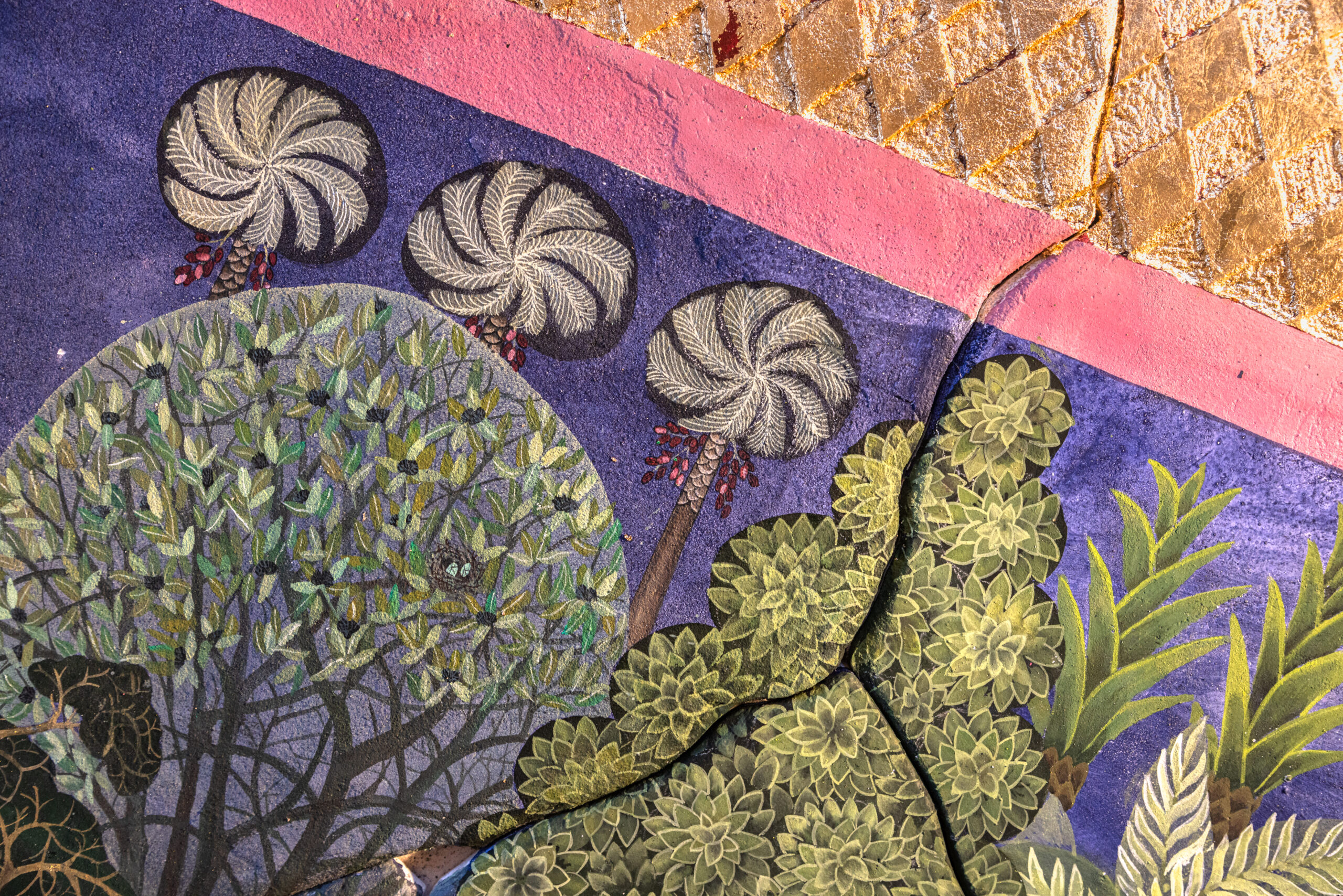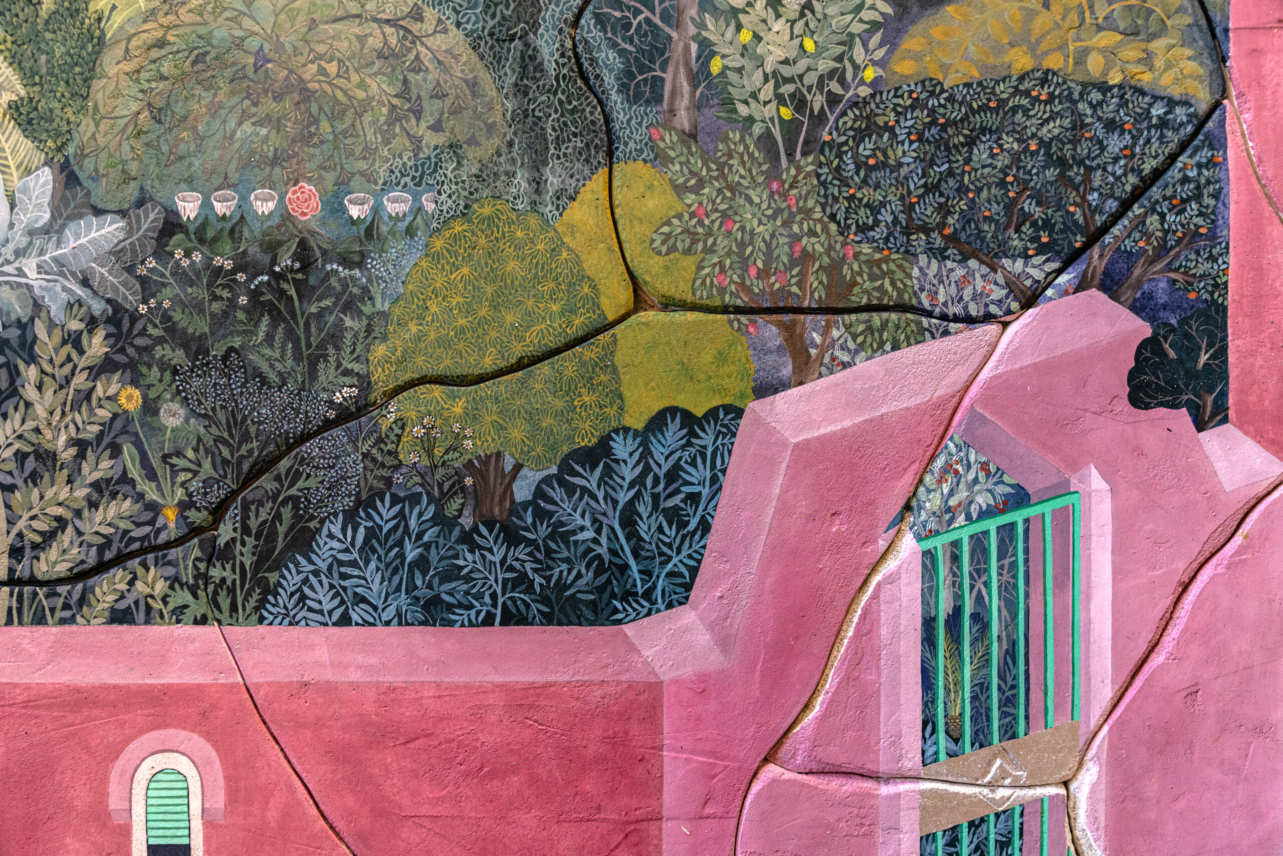 Created on a huge façade made of plasterboard prepared with a plaster composed of gypsum, fine sand and marble dust, the artwork gives the texture of a weathered wall. The entire work consists of a dry wall painting composed of a continuous surface, carved and then modelled in order to create a constellation of irregular fragments, with smooth edges, which evokes cracks and outcrops typical of deteriorated frescoes. The overall image reconstructed by the panels is that of a walled garden, populated by plants native from places the artist passed through: from the Italian Mediterranean scrub to the banana plantations of the Canary Islands, from the Australian eucalyptus trees to the Asian forests, up to the Senegalese baobabs. Each species represents a bond, an experience, a root that has marked the human and artistic path of Baima Poma. A portion of the sky, composed of rhombuses carved in bas-relief and gilded with gold leaf and bole, introduces a suspension element, while a landscape of rocks and arid soil defines the perimetral area of the artwork.