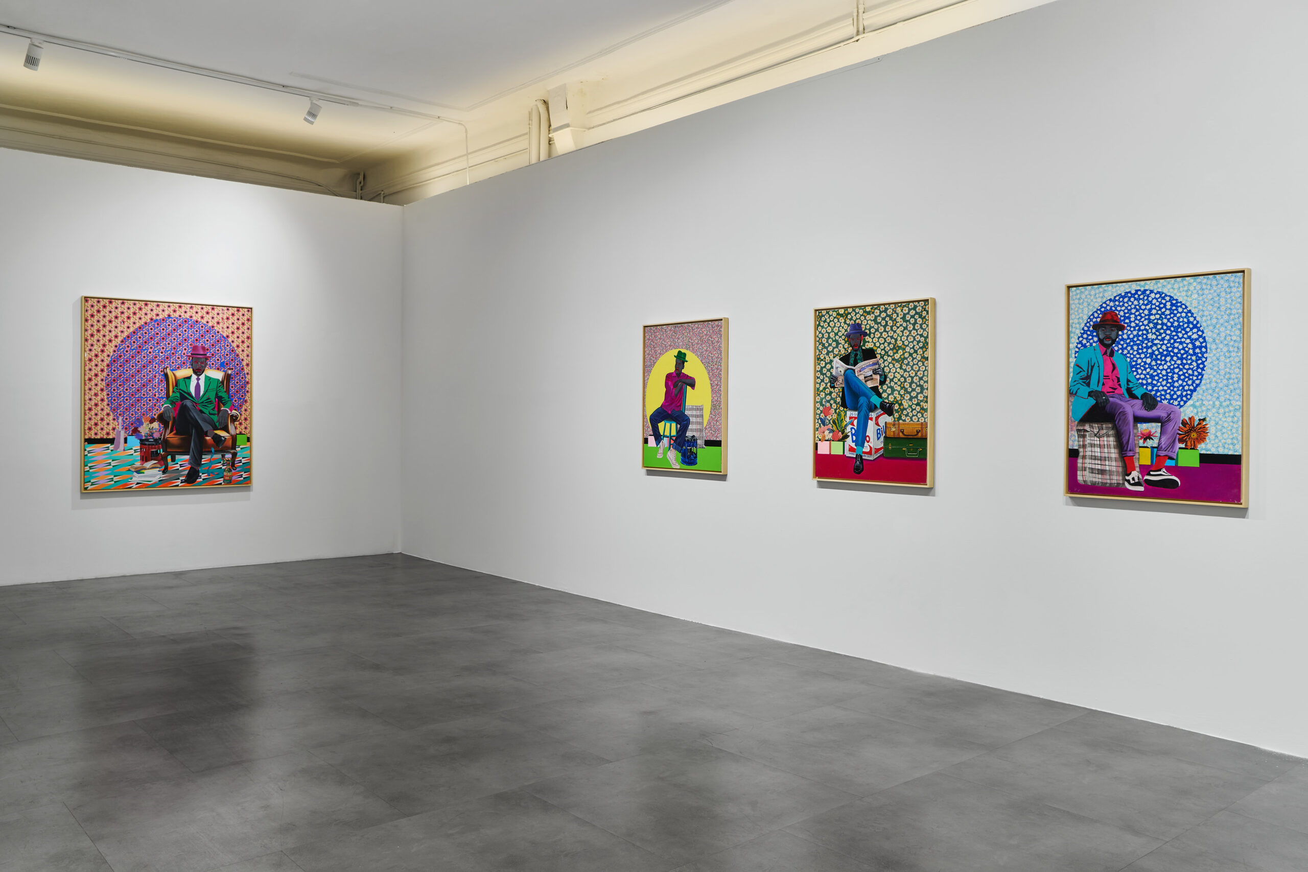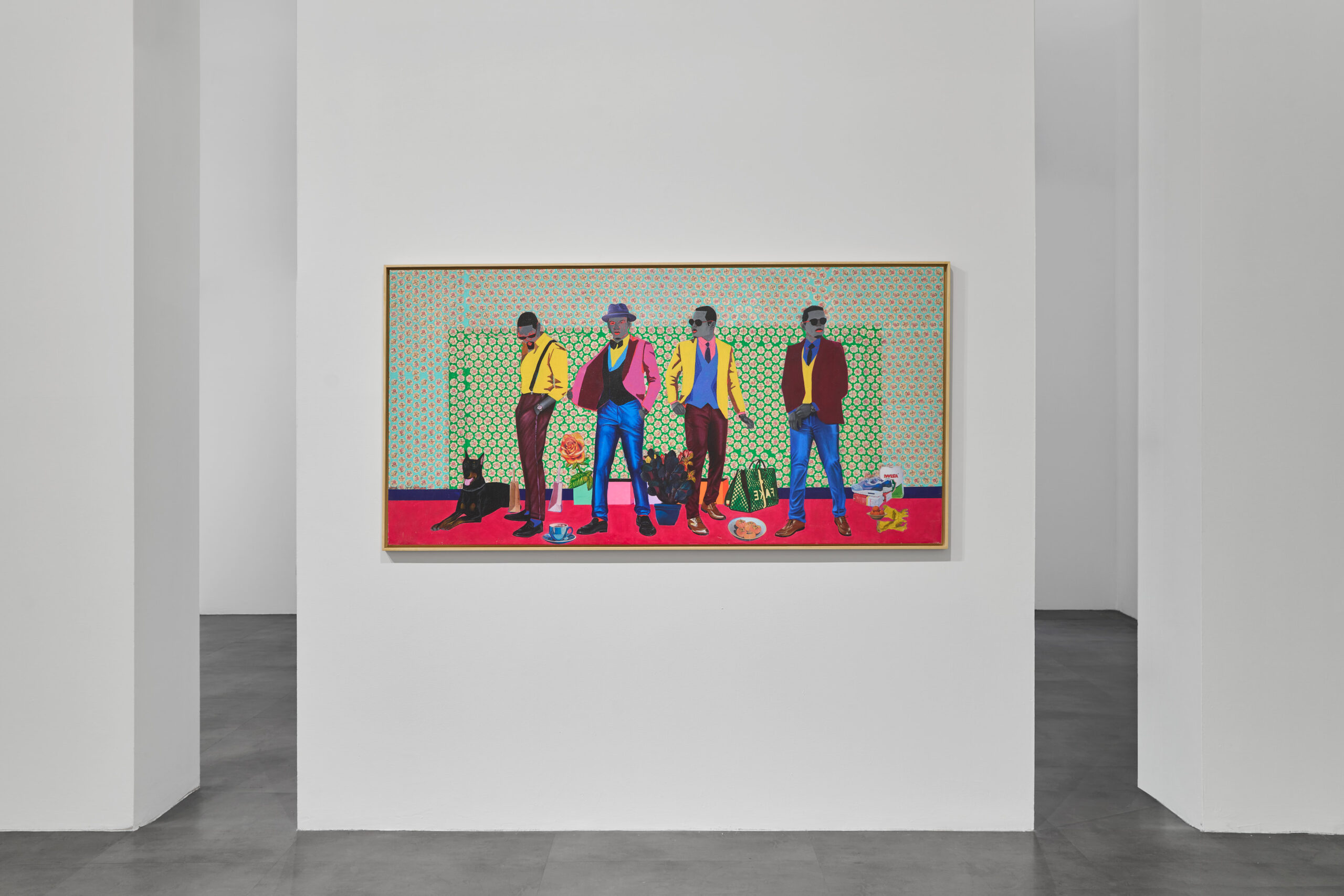 The floral wallpaper that characterizes the background of each painting, as is now a tradition for the artist, represents the period of English colonization that caused many traditions to change in African homes. The English tradition itself is something that comes from afar and represents the cultural contamination inherent in humanity. Furthermore, the objects that animate the scene, together with friends and relatives, clearly speak of the most difficult moments experienced by the artist and his family during their move from one country to another. In fact, we see objects that we recognize as bags used during a move, contrasted with a reproduction of the famous Brillo Box, which instead speaks to us of the expectations placed on the effort of moving, such as the ambition to pursue a career as an artist.