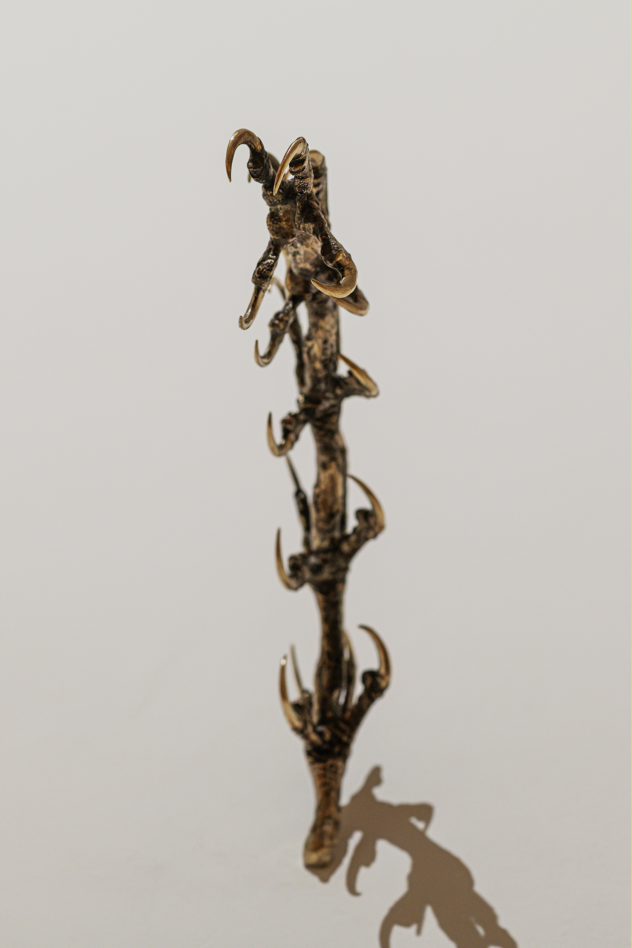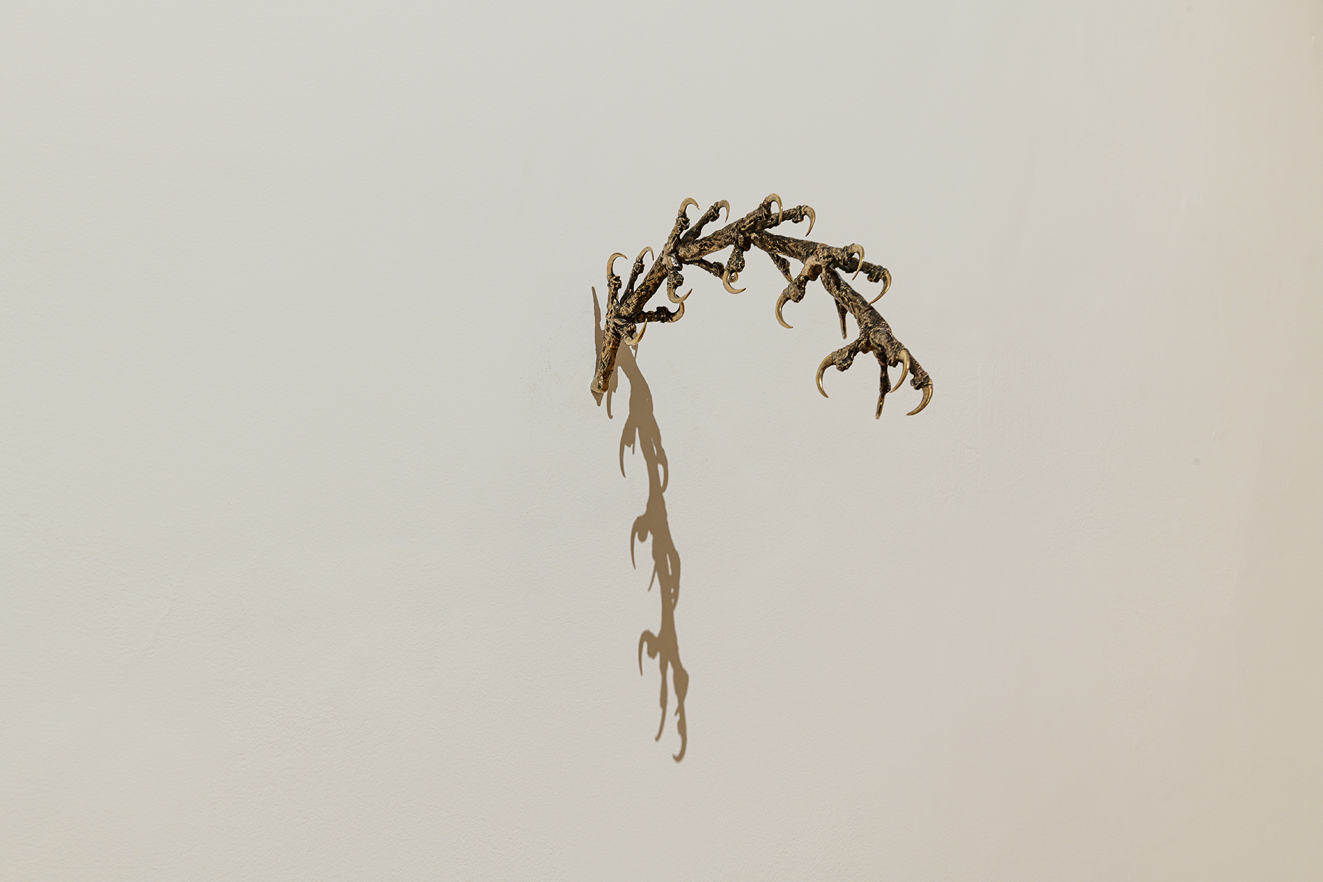 Further on, skin—a material so familiar to us—begins to sting. At mid-wall, at eye level, there is a single metal sculpture, composed of a raptor’s claw repeated, “captured in the act of seizing its prey”3. As the curator notes: “The coldness of the sequence brings out the ruthlessness of power and violence, often centered on precise and relentless rituals”4. One cannot help but perceive the suffering, almost automatically intertwined with the act of repetition. Just think of the anticipation of receiving a punishment, imagining the pain it entails simply because it has already been experienced before. It is a method similar to that used in the course of traditional school education, based not on understanding but on the mechanical reiteration of knowledge. Repetition is also inherent in the cruelty of certain family or social rituals, which, although they could die out within a generation, continue to exist precisely because their power lies in being repeated.