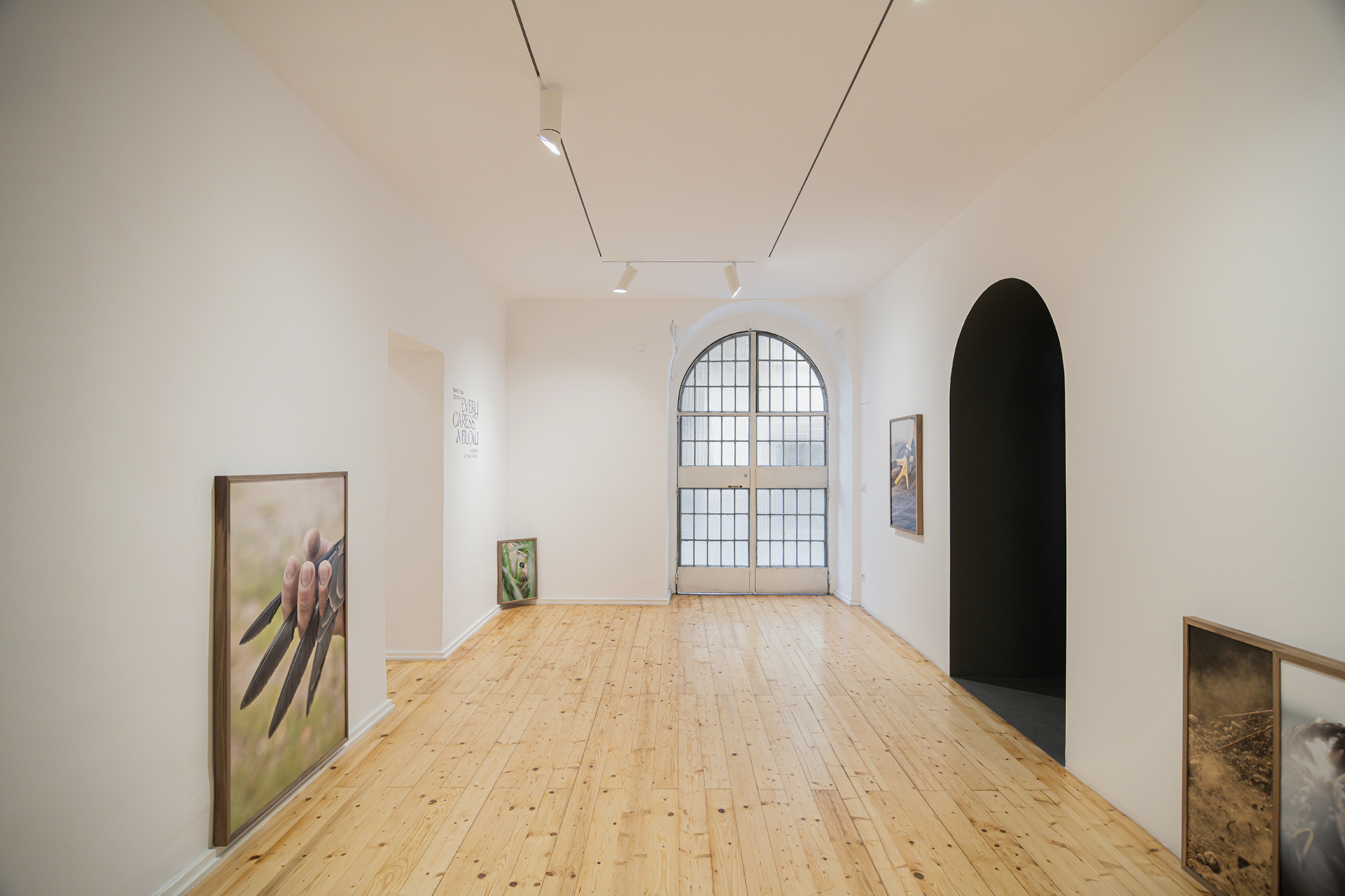 At the same time, this analytical dimension—manifested in a metal sculpture depicting a raptor’s claw, repeated and resonating in space as the sole presence on the wall, or in a photograph of a rabbit’s frozen, terrified gaze, concealed behind tall grass and placed on the floor in the corner of the room—is so restrained that it becomes clear the emotional detachment is not neutral. It is terror held in suspension.