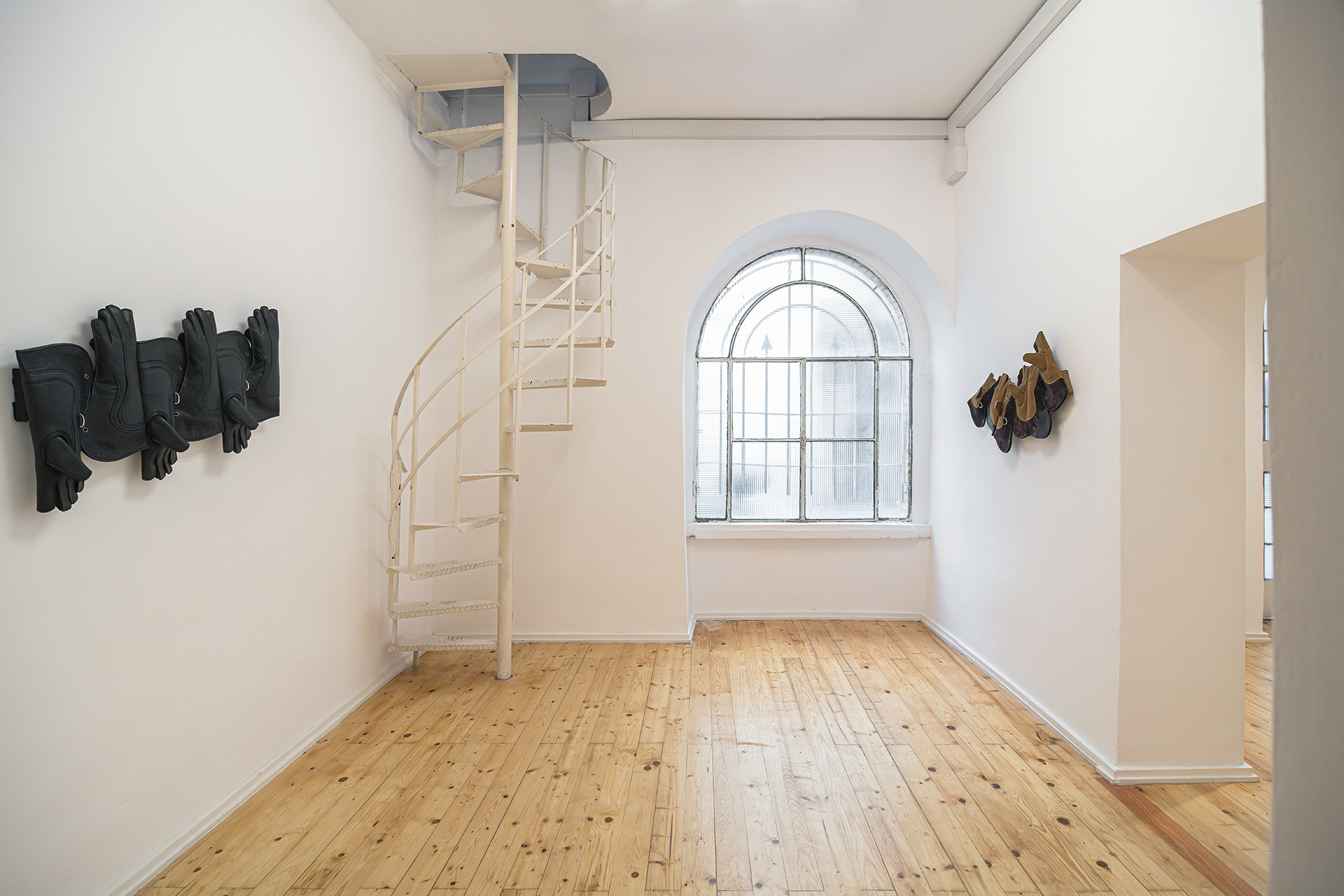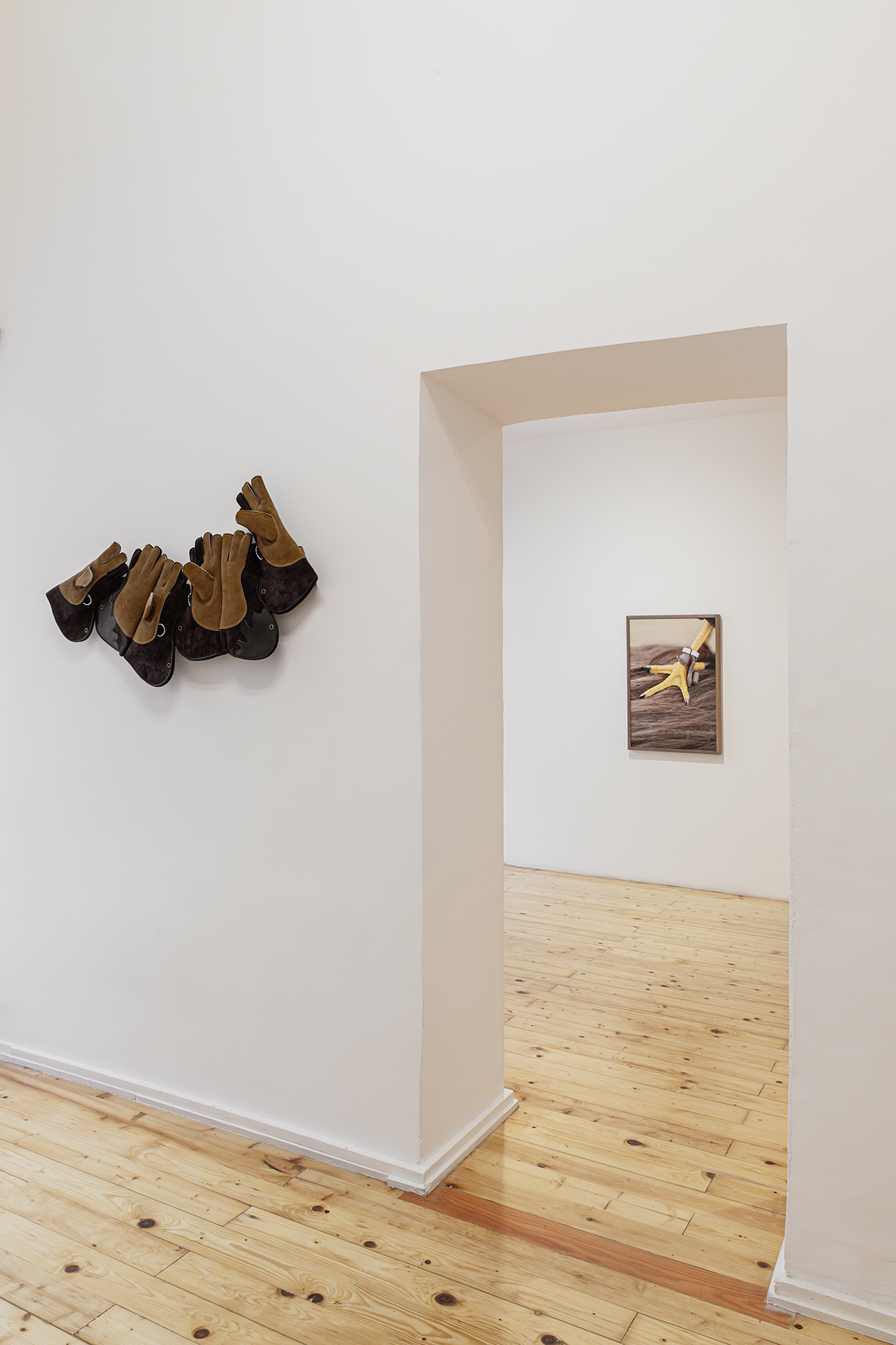 The freedom to remain mere observers is upended in the second room. The dark leather sculptures hanging on the wall are made by assembling falconry gloves. On one hand, we are still spectators; on the other, the gloves evoke a series of desires: to touch them, wear them, smell them, deciphering the seriality and decorative purpose of these originally functional objects. Much of this experience occurs on an unconscious level; we, too, are made of skin.