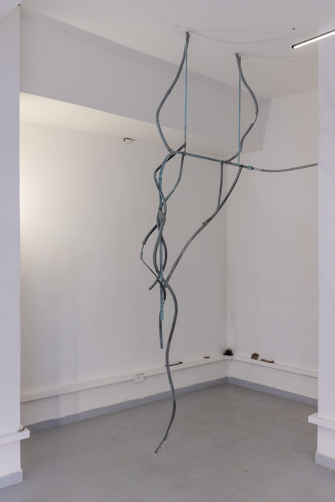 Through a series of sculptural interventions, Andrea Mauti investigates the poetic and narrative potential of objects once liberated from the political and social contexts in which they are embedded. For this edition, he presents Esausta. (Voice Voice) — a site-specific installation made with ashes from the firing of clay objects, soil, vegetable charcoal, fennel essential oil, and steel. The work reflects on the enduring influence of the dead: language itself — and the words through which we communicate — constitute a true legacy, a relic transmitted by those who came before us.