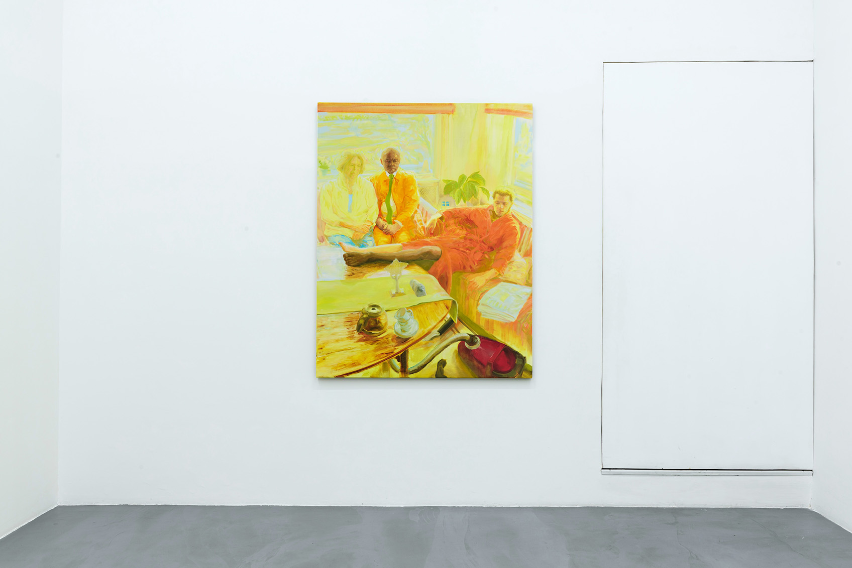 As the artist states it: «My version reimagines this myth through a familial lens. My mother and father sit on a sofa, calmly looking at me – I’m dressed in a robe, legs resting on a table. On the table stand a pot of coffee, an Ethiopian cross, and a small concrete lion – shared cultural signifiers that float between Swedish and Ethiopian heritage».
