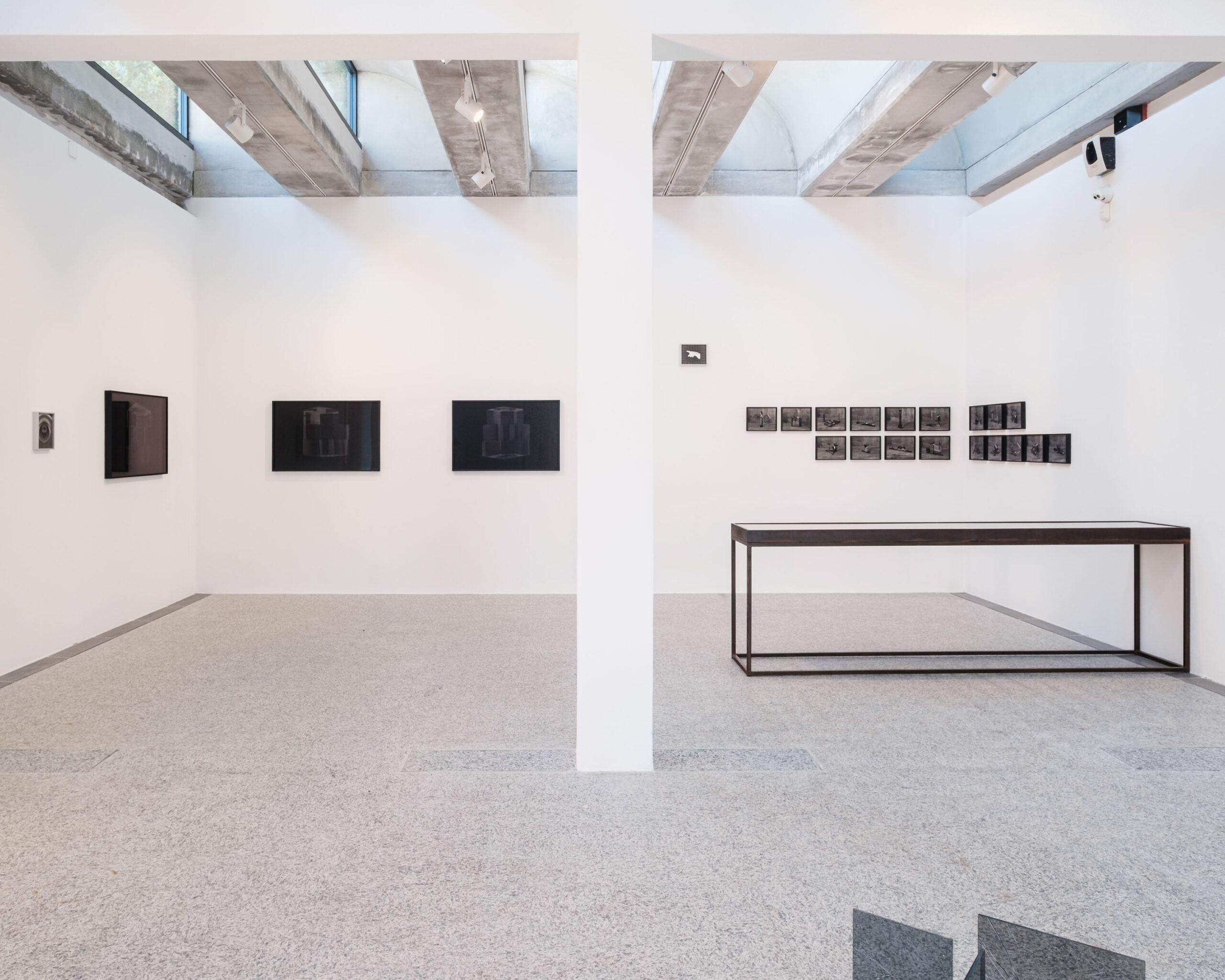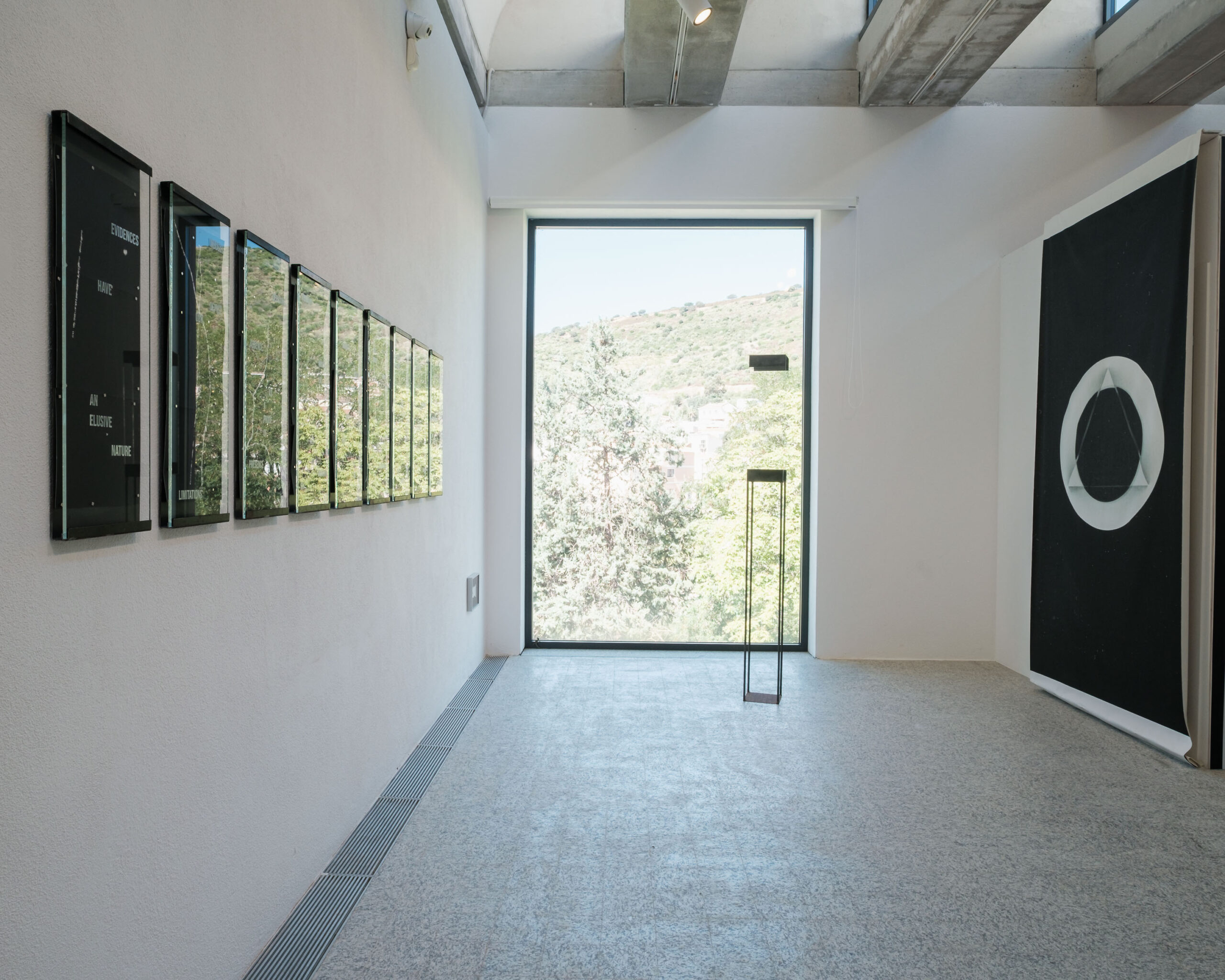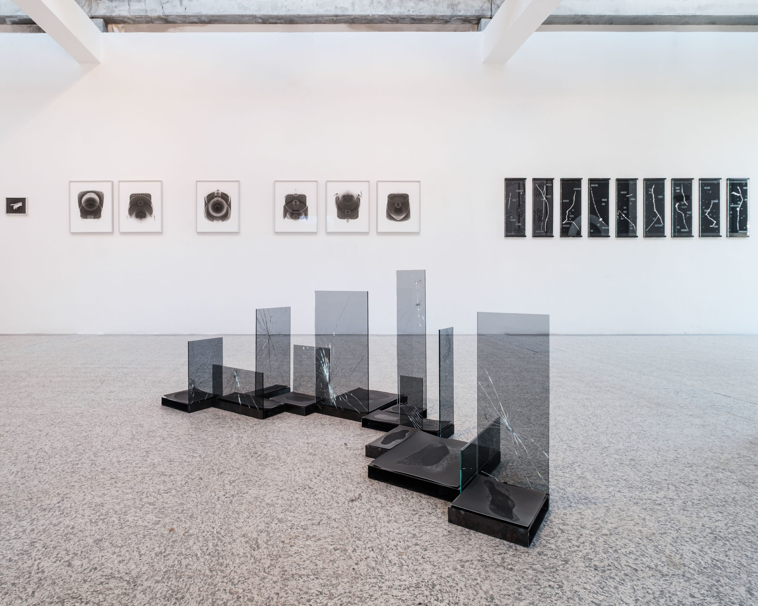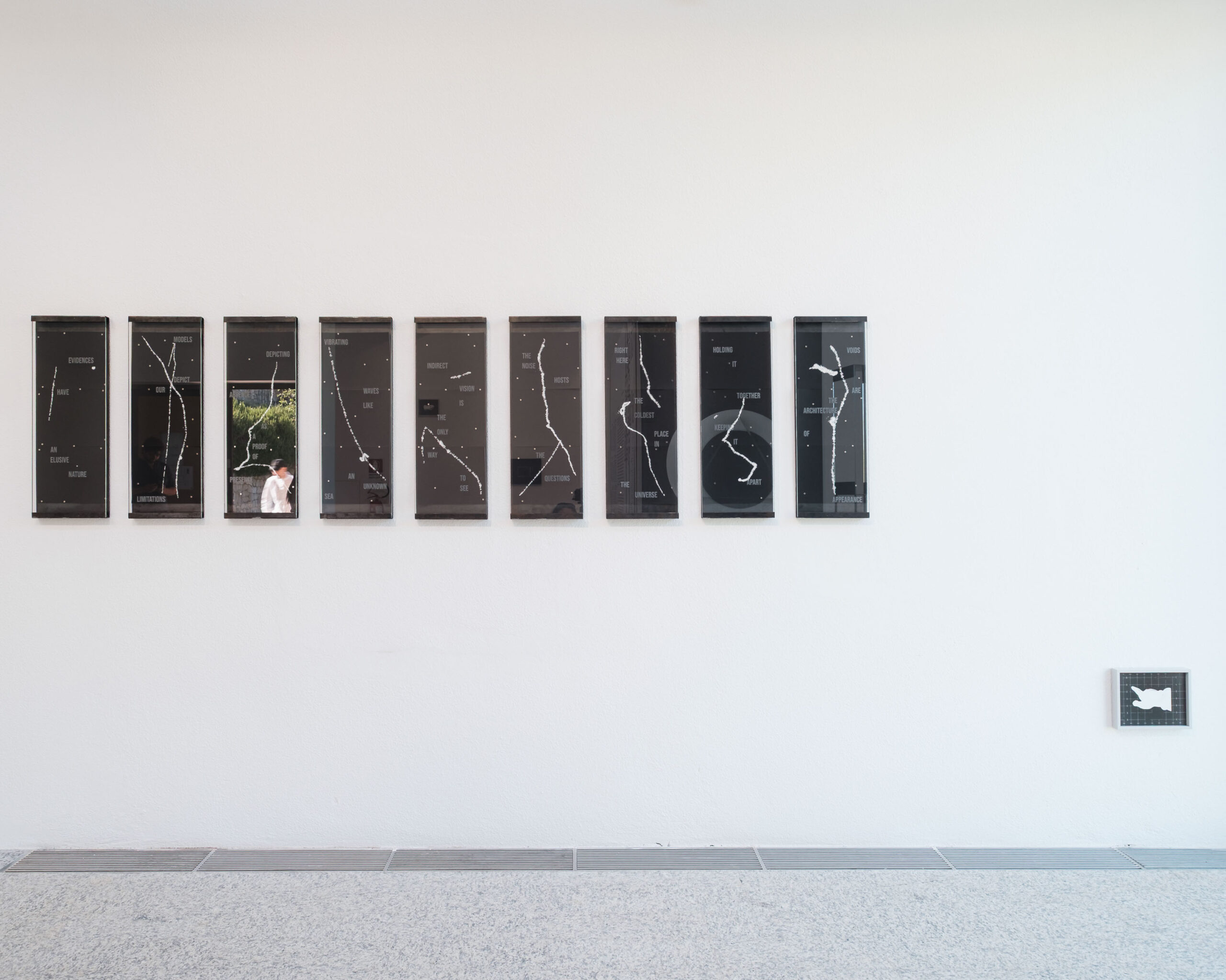 ● Luca Spano presenta due serie di lavori che assemblano materiali diversi – carta fotografica, vetro inciso al laser, metallo – e documentano la traccia di fenomeni invisibili. Prendendo spunto dall’esperimento CYGNO, un progetto del GSSI dedicato allo sviluppo di una camera a proiezione temporale di altissima precisione (TPC) per la registrazione di eventi rari, l’artista costruisce un immaginario visivo ancora assente anche in ambito scientifico. Le sue installazioni interrogano l’inadeguatezza di ogni forma di conoscenza, avanzando ipotesi enigmatiche di rappresentazione del reale e mettendo in relazione immagine e testo come strumenti di indagine complementari.