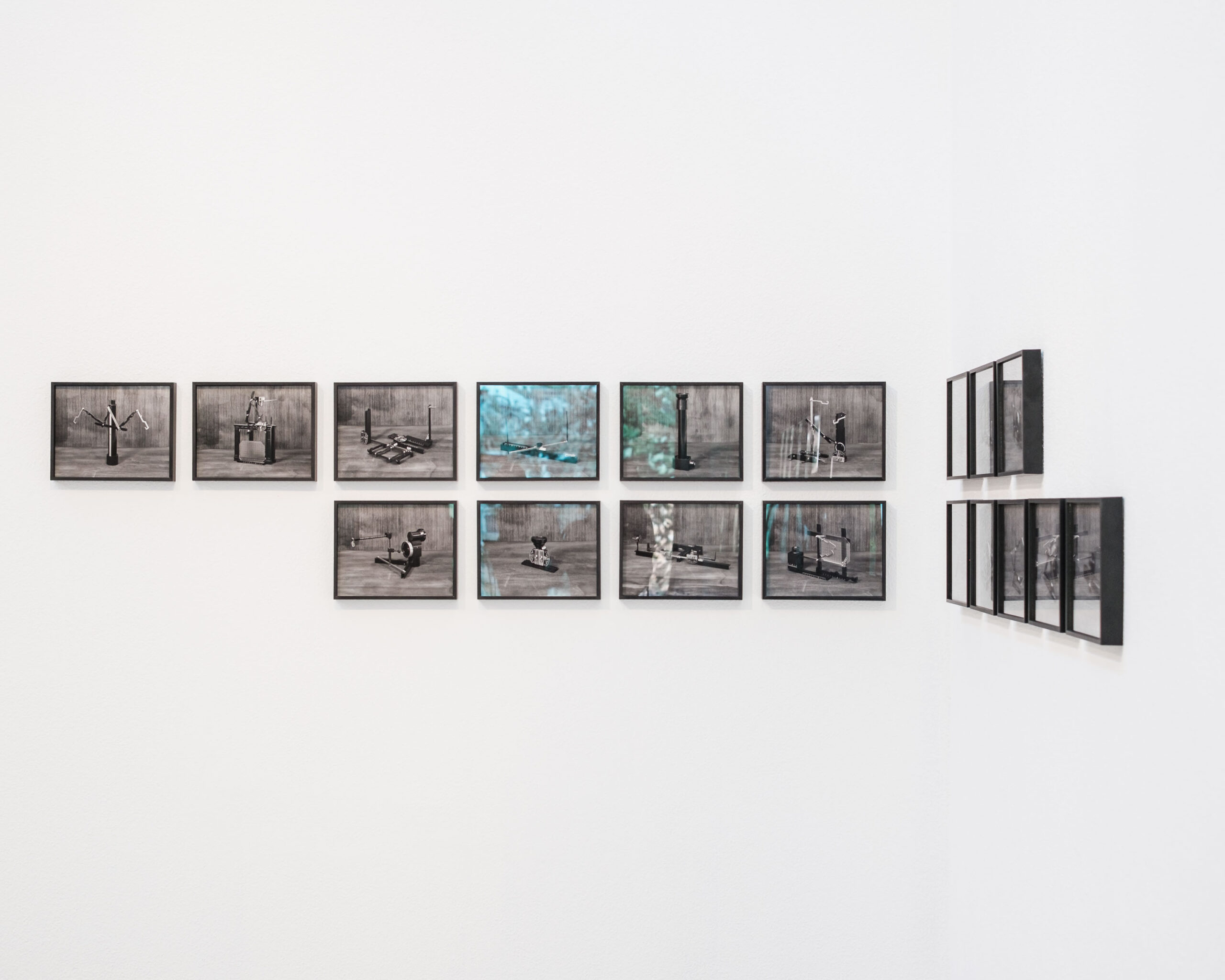 ● Fabio Barile, nell’installazione fotografica, propone tre diversi tentativi di rappresentazione dell’invisibile, mediati da esperienze dirette che alterano e trasformano il processo stesso della visione, rendendolo inevitabilmente fallimentare. L’osservazione degli strumenti di lavoro della fisica e della fotografia – e, più in generale, della conoscenza – lo conduce a registrare gli esiti di un’ironica sfida intellettuale alla decostruzione dei saperi: il banco ottico dell’artista viene smontato e rimontato, generando una sequenza potenzialmente infinita di strumenti precari e inservibili. Una serie di fotogrammi riflette inoltre sull’atto del guardare attraverso “qualcosa”, deformando lo spazio fisico e amplificando la percezione. Completa l’installazione una sequenza di immagini di mani che indicano un oggetto sempre esterno alla scena, destinato a restare ignoto.