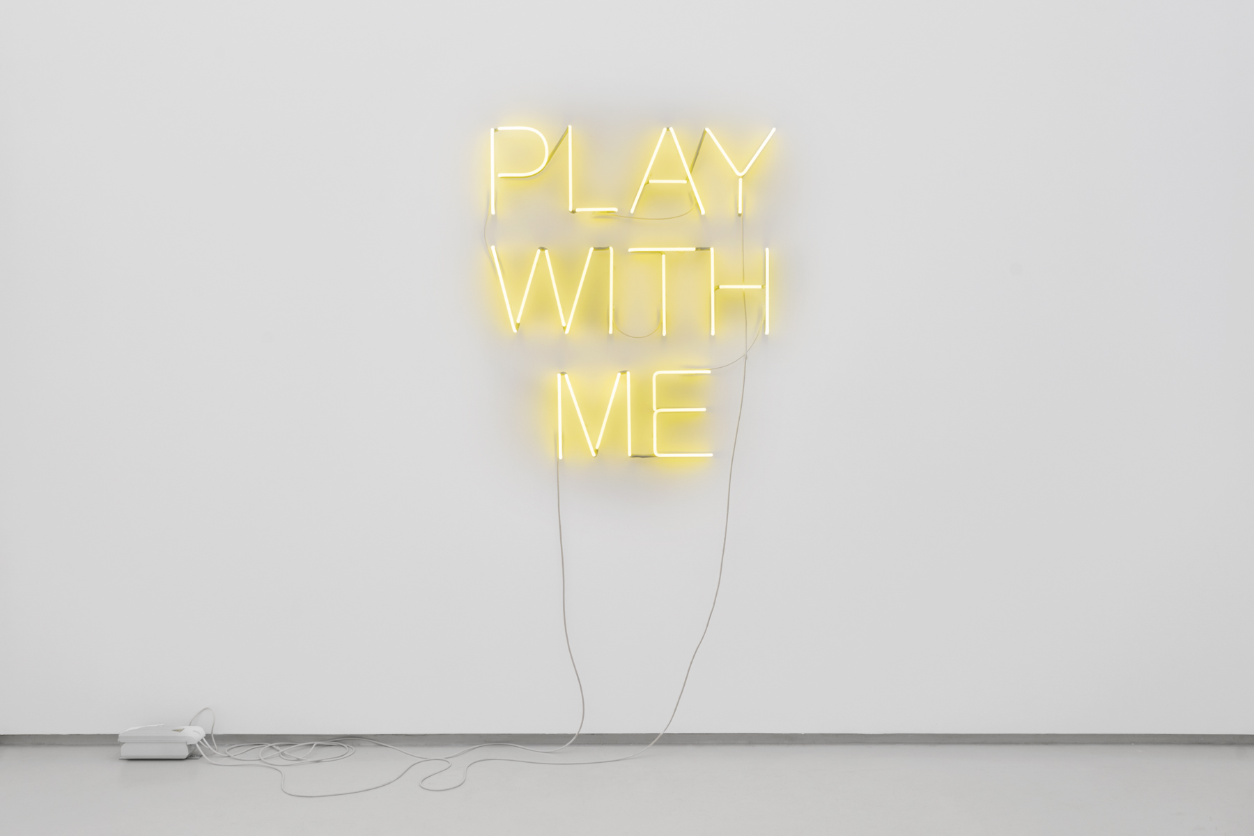 Meanwhile, the neon piece PLAY WITH ME — a pop quotation and distinctly perverse mantra — exposes the ambiguity of a mediated eroticism that confuses seduction and submission, power and vulnerability.