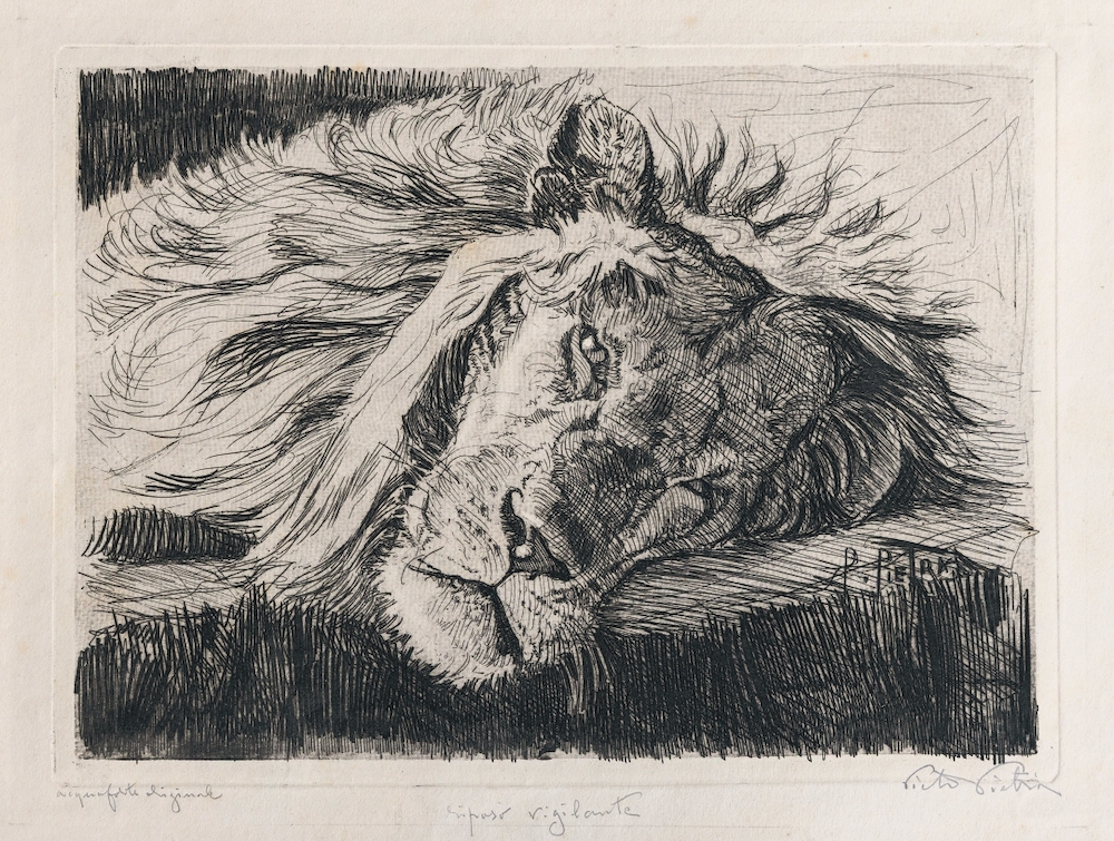 Artista sensibile e attento osservatore, anche grazie all’intenso studio condotto nel Giardino Zoologico di Roma tra il 1914 e il 1915, Pietra si distinse sin da subito come disegnatore di animali, capace di coglierli con rigore naturalistico e sensibilità poetica. Nei suoi disegni, ogni creatura — cani, leoni, tigri, gatti o cavalli — è resa con straordinaria precisione e profondità: non solo ne intuiamo l’aspetto esteriore ma anche l’essenza più intima di ciascun esemplare, spesso ritratto come essere senziente e fiero. Da queste rappresentazioni emerge il senso di rispetto che l’artista rivolgeva al mondo animale, anticipando una sensibilità animalista ed ecologica certo più propria della contemporaneità in cui viviamo. Pietra resta fedele alla tradizione bolognese ottocentesca e al mestiere dell’artista, pur aprendosi a riflessioni moderne sulla sintesi, sul dinamismo e sulla psicologia del disegno. Il tratto rapido e mnemonico diventa strumento per catturare l’essenza del movimento e dell’anima del soggetto, in continuità con la lezione leonardesca sul “moto interiore”.