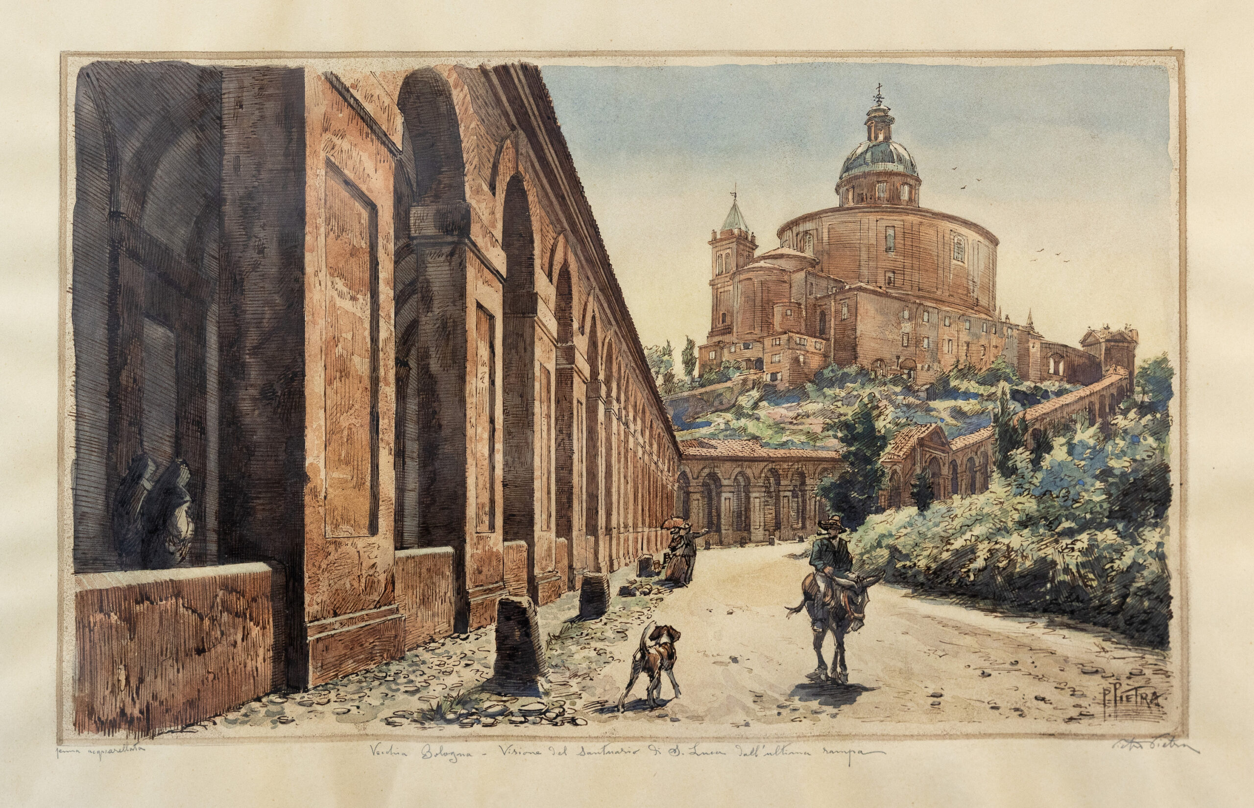 La mostra monografica intende ripercorrere la tradizione del disegno e della grafica bolognese a cavallo tra Ottocento e Novecento, seguendo le tracce dell’intensa e poliedrica produzione di Pietro Pietra: un artista sognatore che ha profondamente amato Bologna, ritraendola in suggestive vedute e immortalando nei suoi lavori i luoghi simbolo della città — le storiche vie porticate, le antiche porte della cinta muraria, le piazze più caratteristiche. Qui il gusto per la veduta architettonica e il rigore prospettico si fondono con la teatralità scenografica e la dimensione narrativa, mentre le persone, ridotte a macchie o tratti essenziali, vengono spesso impiegate per misurare e animare la monumentalità urbana. Pietra rappresenta una Bologna ormai scomparsa, trasformata dai restauri e dalle demolizioni di fine Ottocento, recuperandone la memoria attraverso le sue vedute ad acquerello, tra realtà storica e visione onirica.