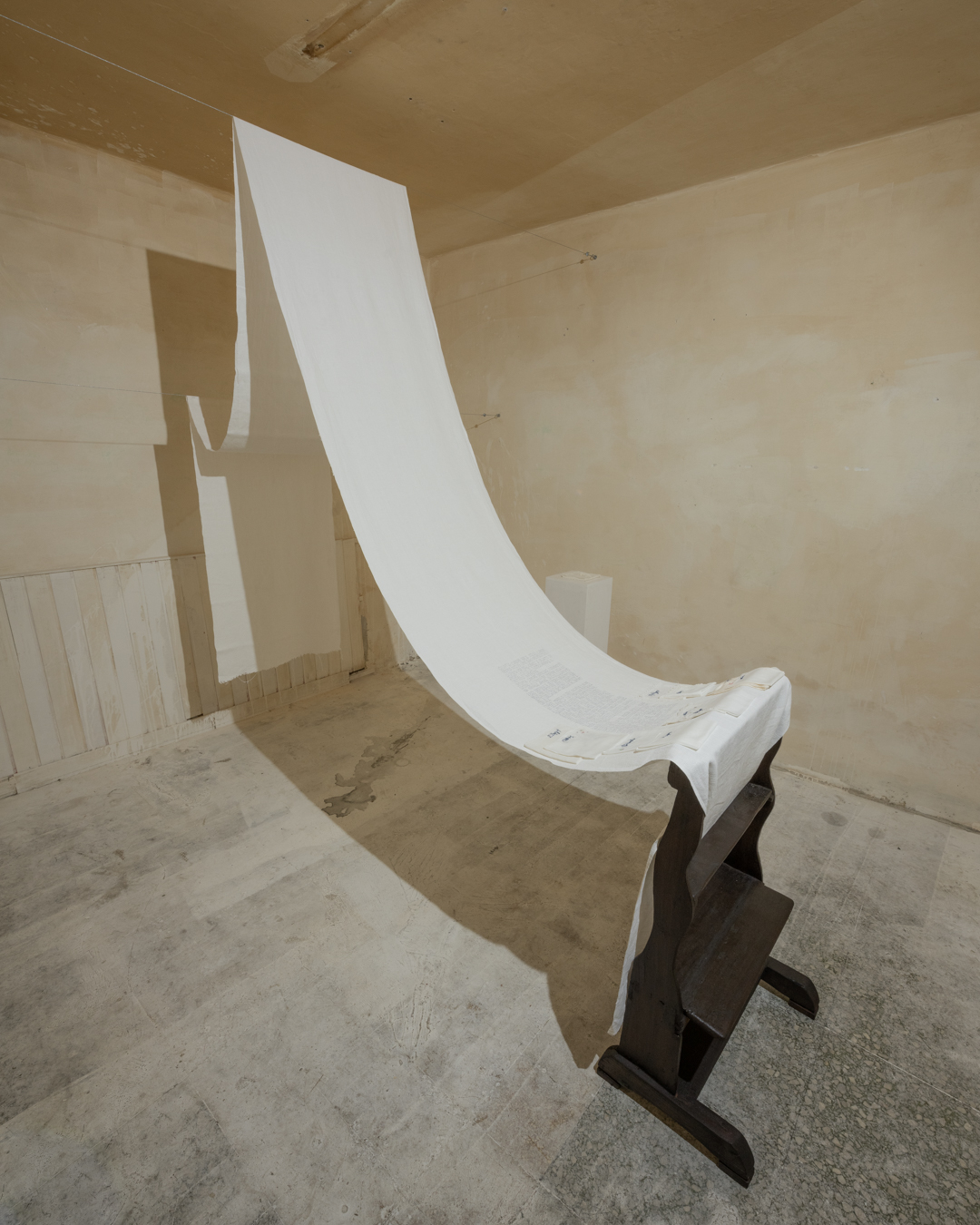Il lungo telo tessuto a mano, presentato come un telaio mentale, traduce visivamente il processo di articolazione semantica: un léksis materializzato, un dispositivo che intreccia significati e corporeità. La sostituzione della struttura del telaio con un inginocchiatoio domestico è una scelta che riporta l’atto della lettura alla dimensione rituale.