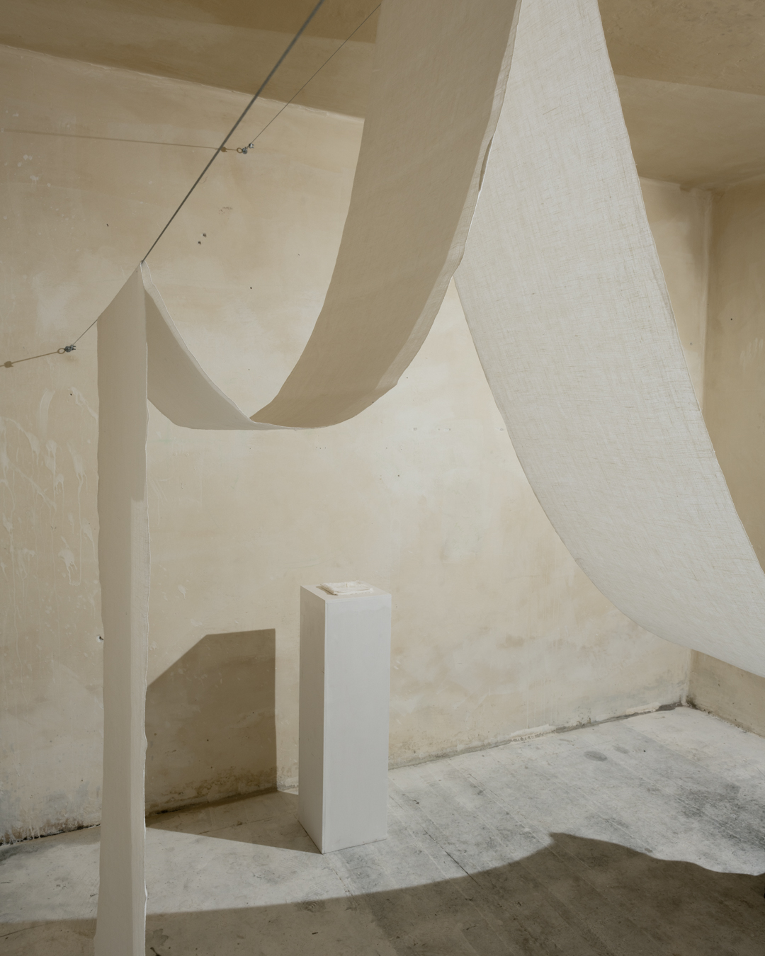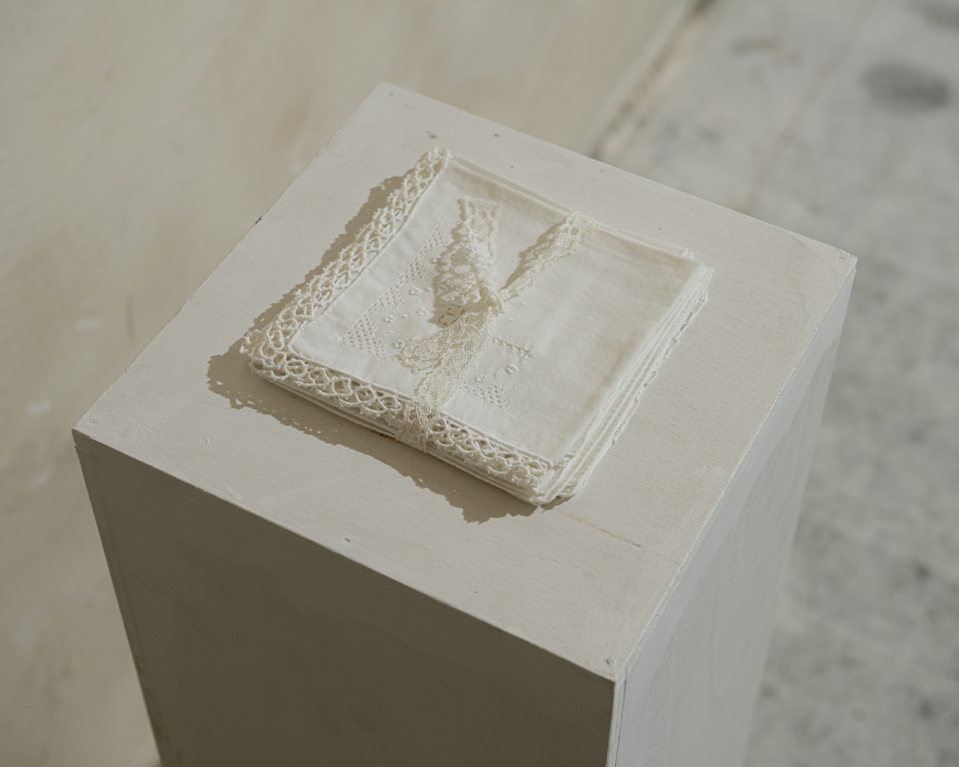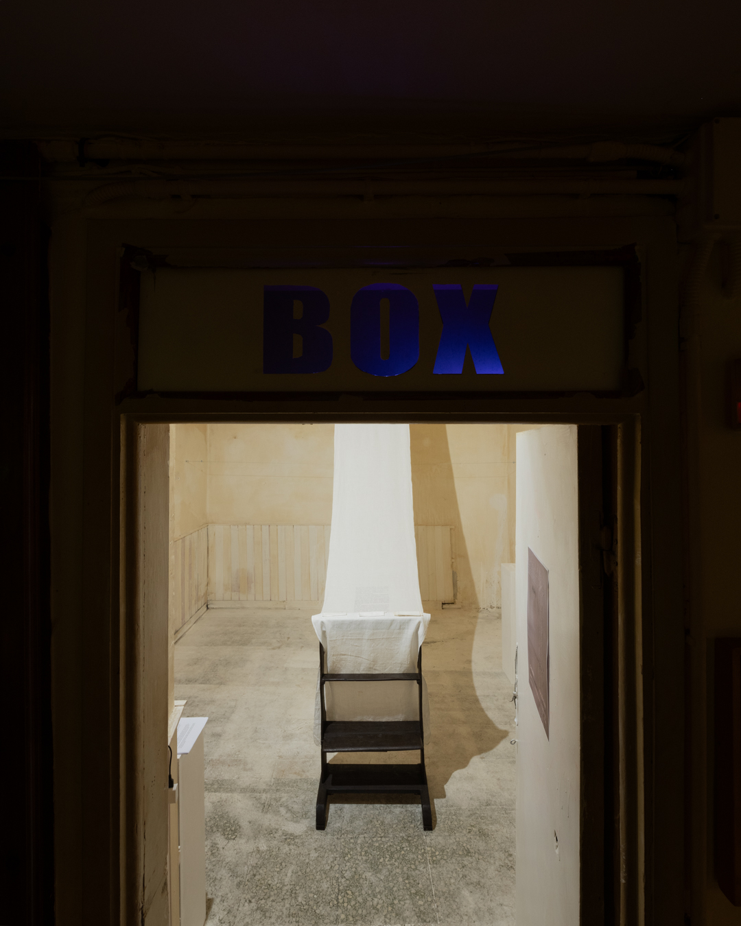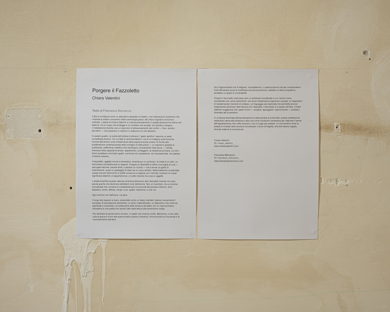 Porgere il fazzoletto costruisce così un ambiente concettuale in cui l’amore viene considerato non come sentimento, ma come infrastruttura cognitiva e sociale: un dispositivo di resistenza nei momenti di collasso, un linguaggio pre-razionale che permette ancora l’esperienza condivisa. Nell’intreccio tra i fazzoletti, il telo-telaio e lo spazio del Box, Chiara Valentini suggerisce che i gesti minimi — porgere, appoggiare, inginocchiarsi — possano diventare atti di pensiero.