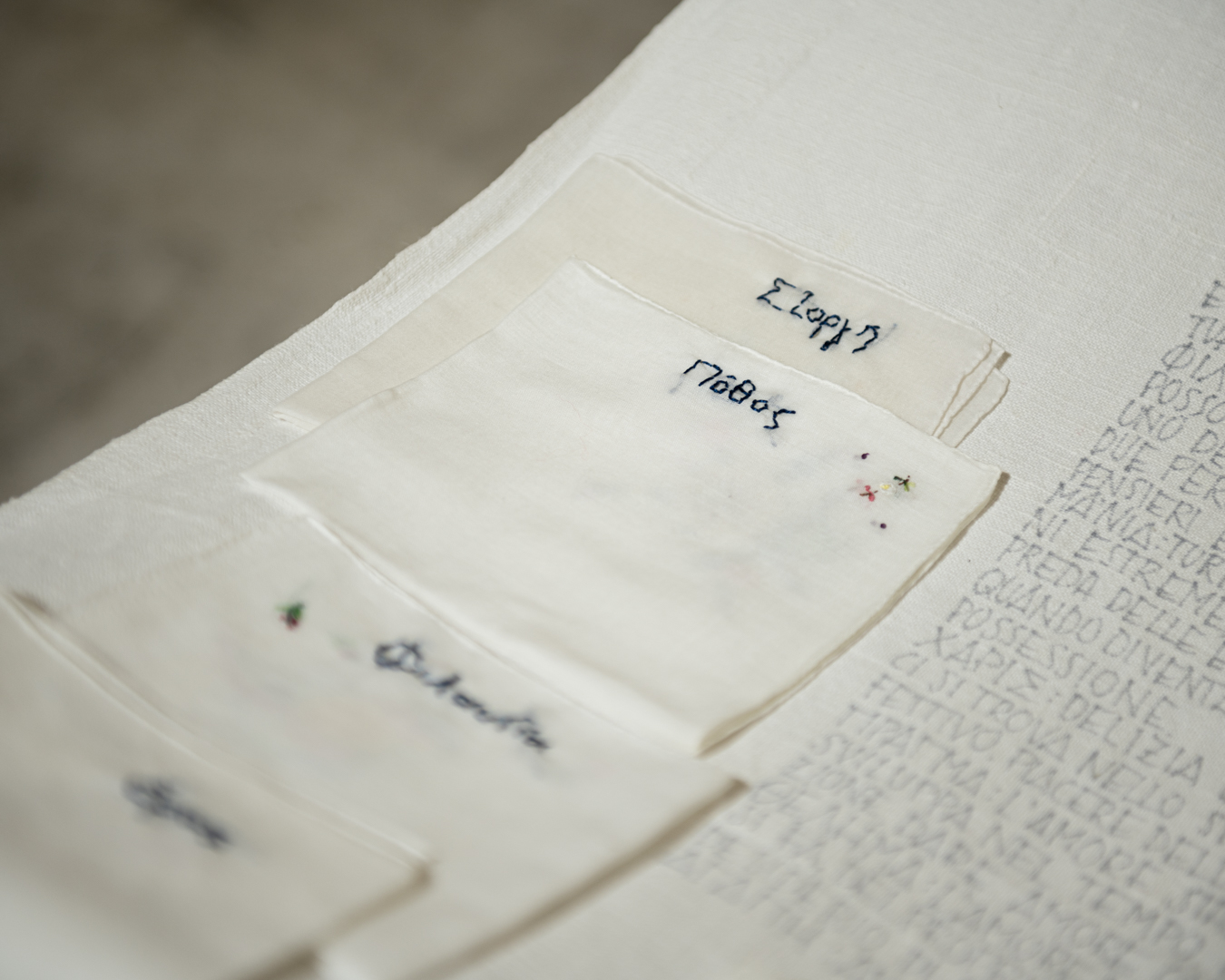 L’artista amplifica questa valenza simbolica attraverso dieci fazzoletti ricamati con dieci parole greche che declinano altrettanti modi dell’amore. Non un inventario, ma un prisma concettuale che richiama la complessità già riconosciuta dal pensiero ellenico: érōs, desiderio; philía, affinità; storgē, cura; agápē, dedizione; e così via.