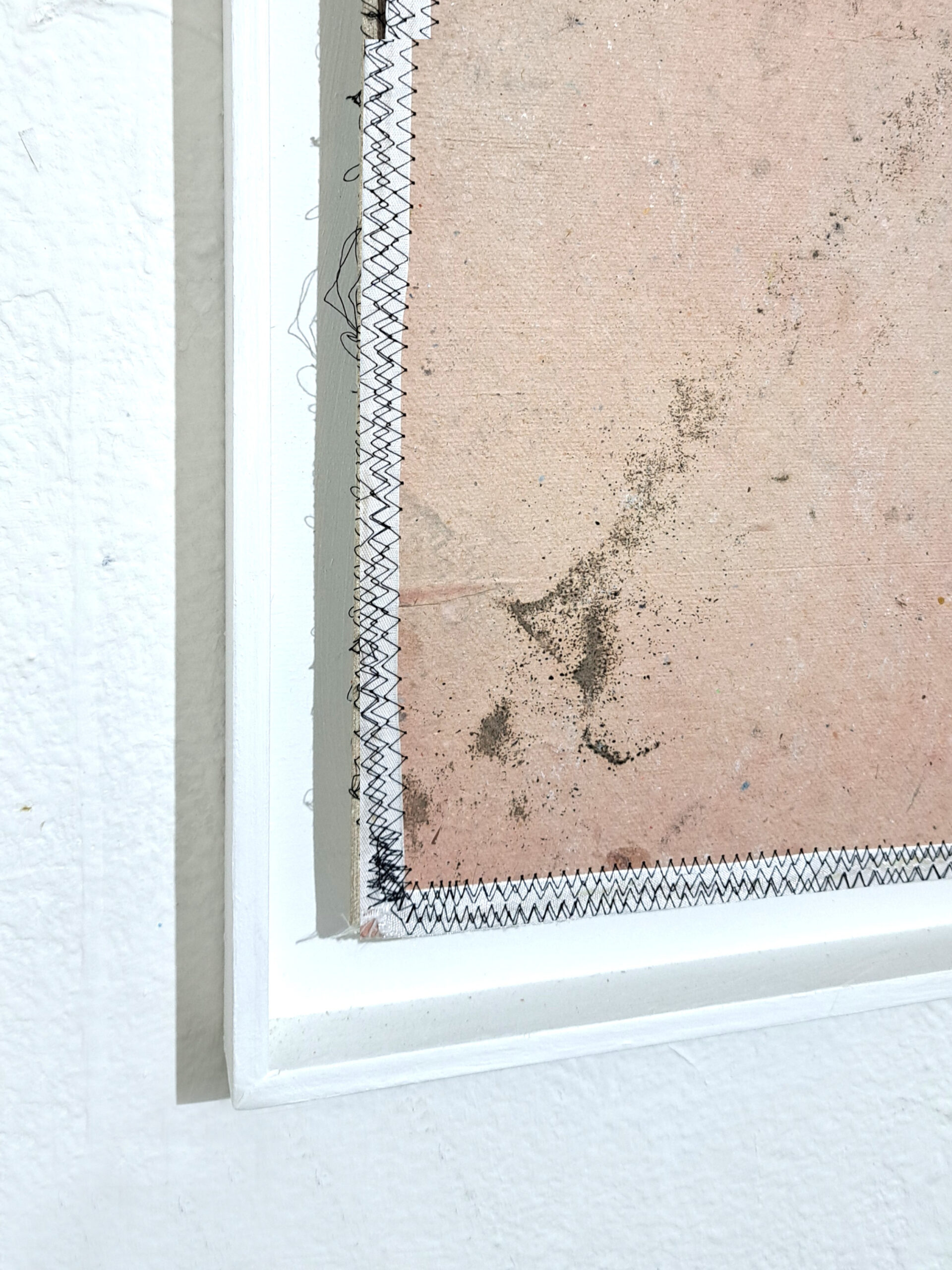 All the canvases are square in shape and are closed with stitching measuring approximately 90 × 90 cm. In order to be worked on, they were “stretched” over a wooden frame and are “double,” meaning they are “wrapped” in paper on both sides. This technique, in addition to ensuring the durability of the object, became a defining aspect of the artistic process: in many cases, the color or glue that seeped through the canvas suggested forms or backgrounds from which to begin or that inspired the “reverse side,” and vice versa. This continuous act of turning and flipping the canvas helped achieve results that intentionally escaped my control and allowed me both to evade technique and avoid being trapped by it.