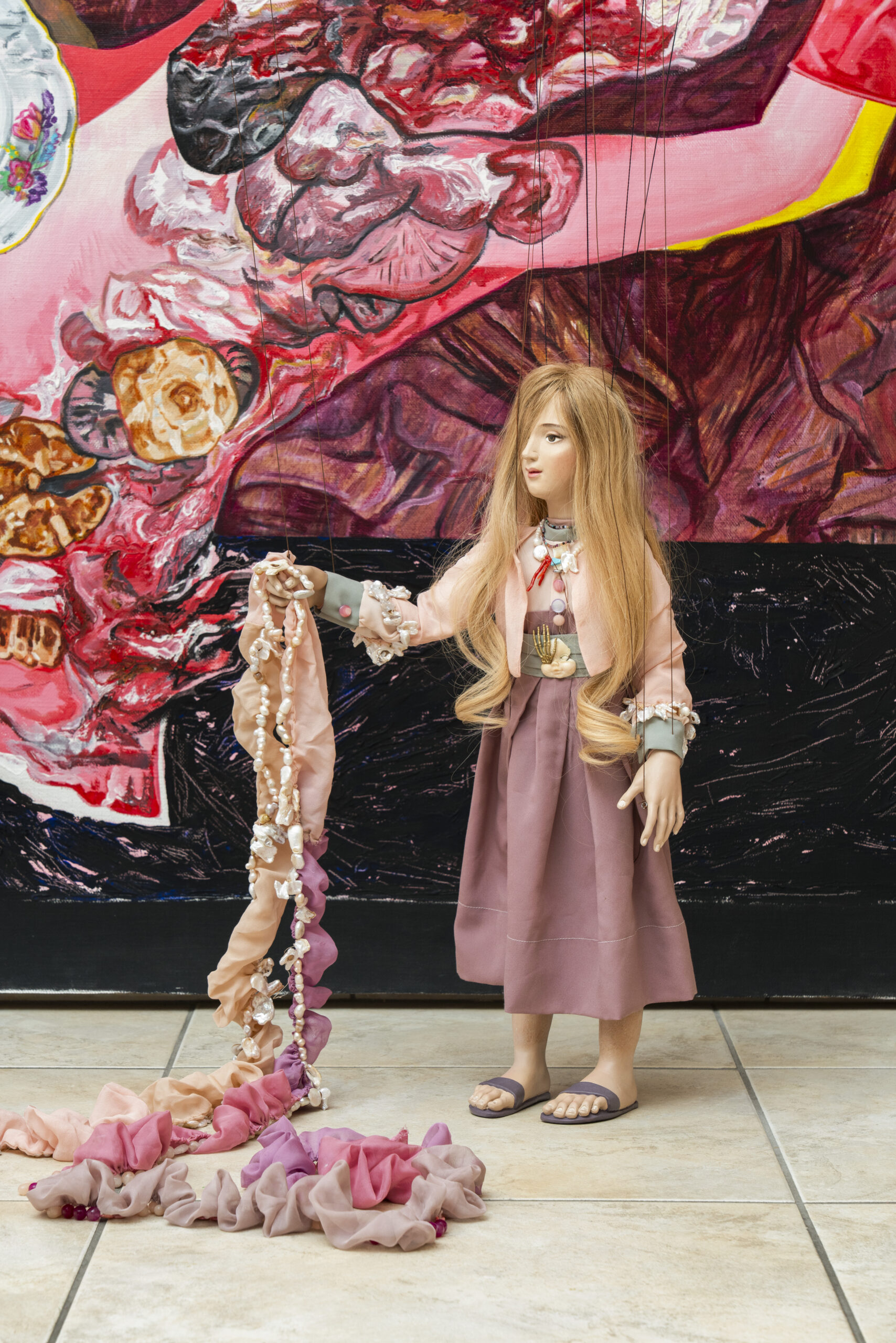 The comparison between the two artists reveals a profound harmony in their freedom of expression. Through Pharaildis’s artworks, Lucia Leuci explores new horizons, deepening themes that have long been central to her artistic research: the female body and the way it is dressed, decorated, fed, exposed, and appropriated. Her artworks take the form of spaces in which the collective and the private, reality and fiction, precious and discarded materials overlap and contaminate each other. In this web of layers, the artist melts the usual boundaries between what is considered appropriate, beautiful, and conforming, to embrace those aspects of inner and outer reality that most attract and at the same time repel our gaze.