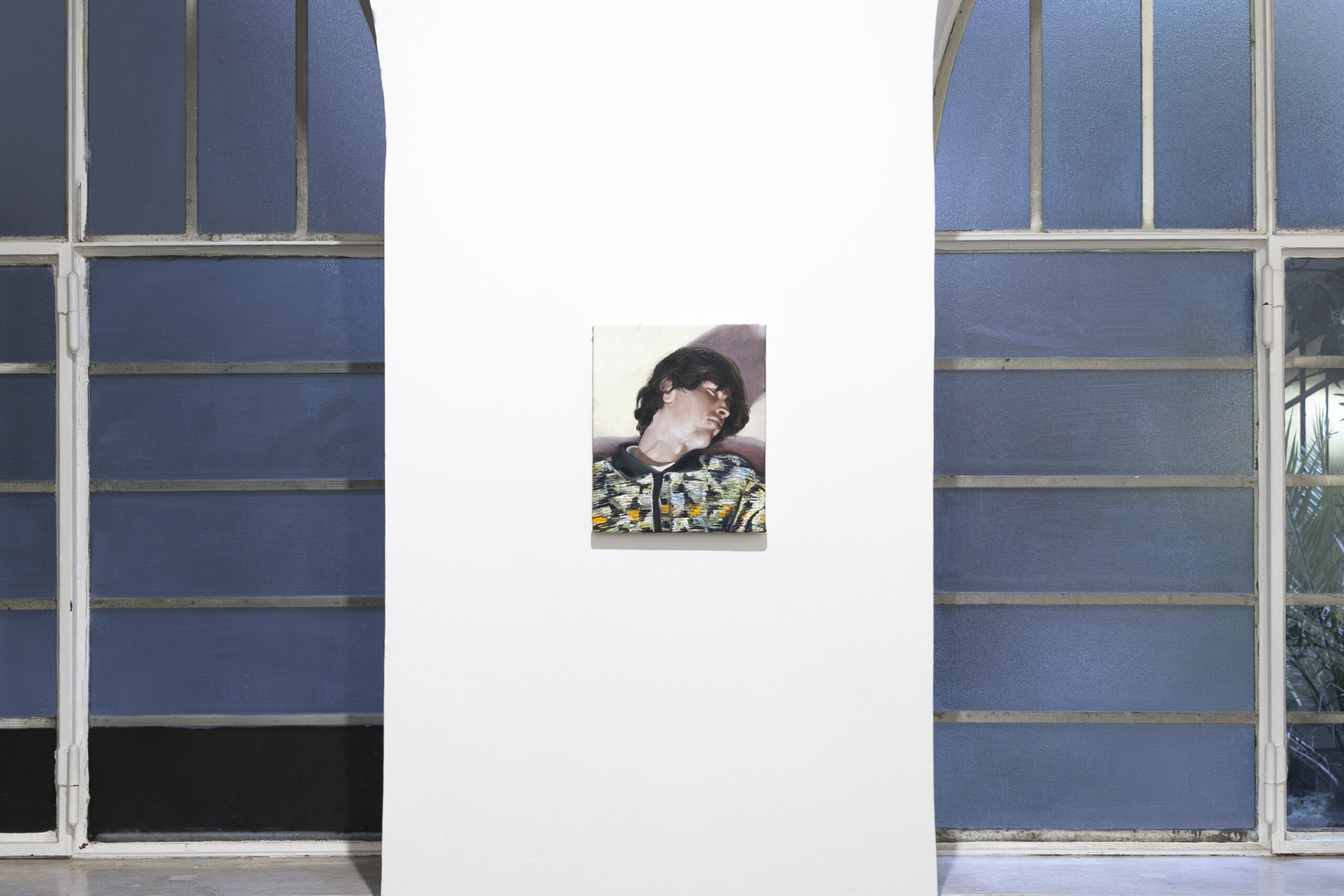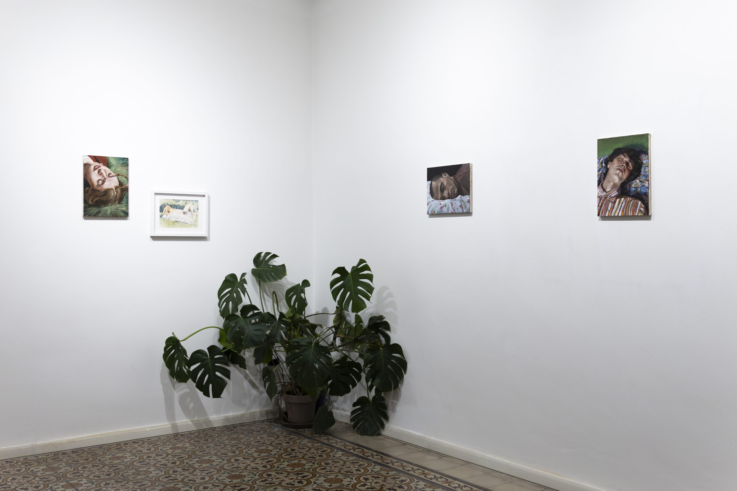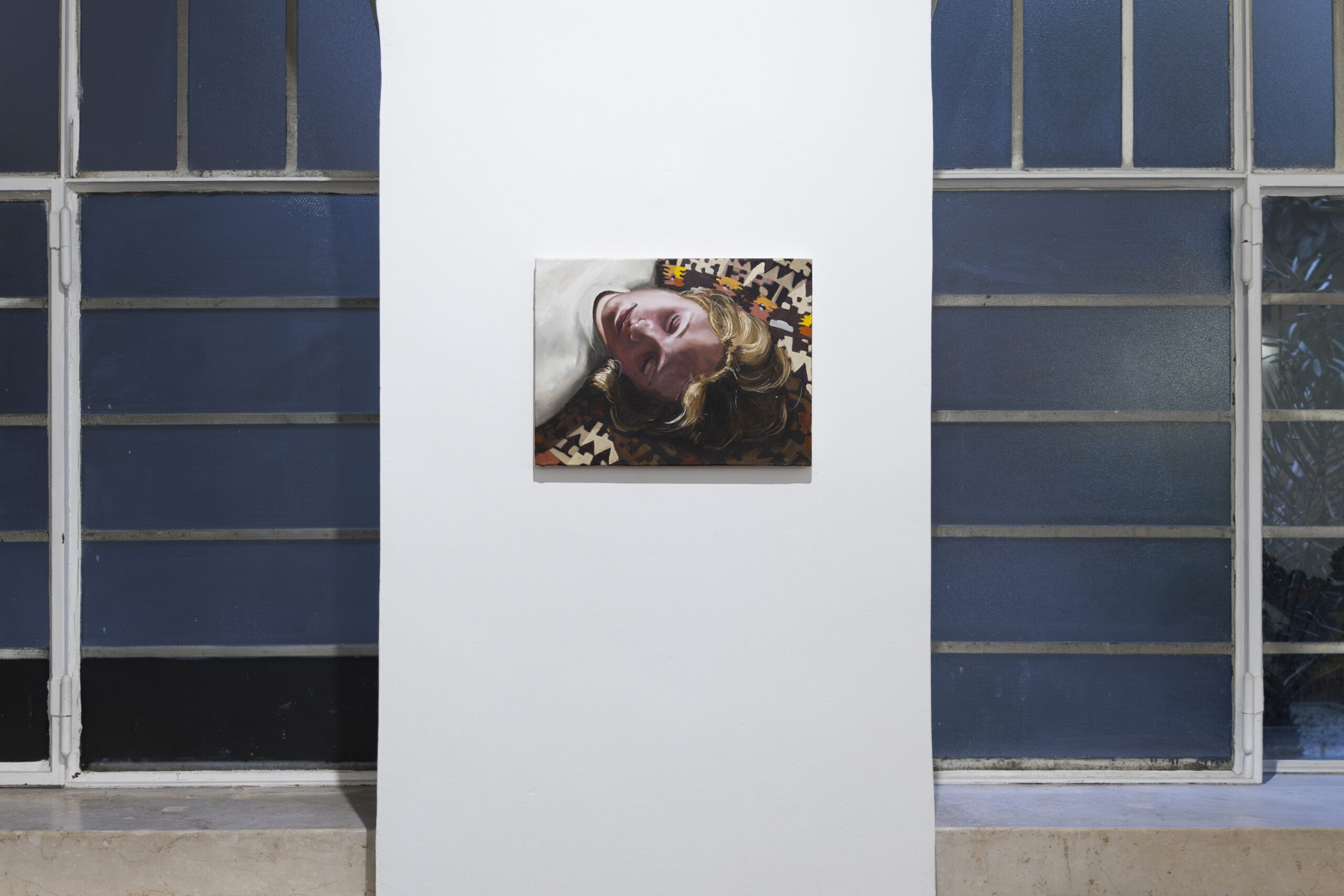 The artist conceives the exhibition space as a single choral work: paintings hung at varying heights, monumental prints, overturned canvases, patches of synthetic grass. A subtle choreography of presences that together creates a narrative broader than the individual images.