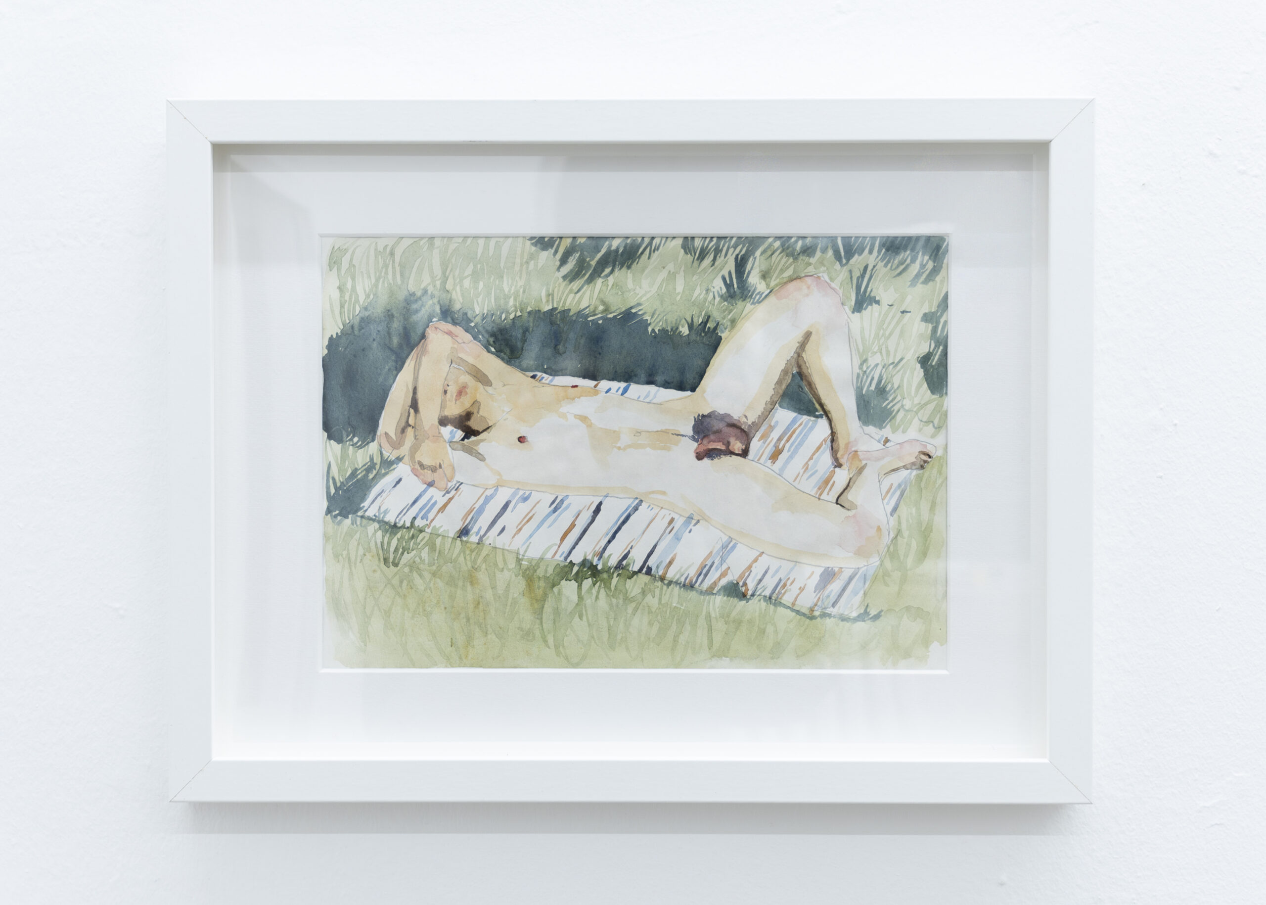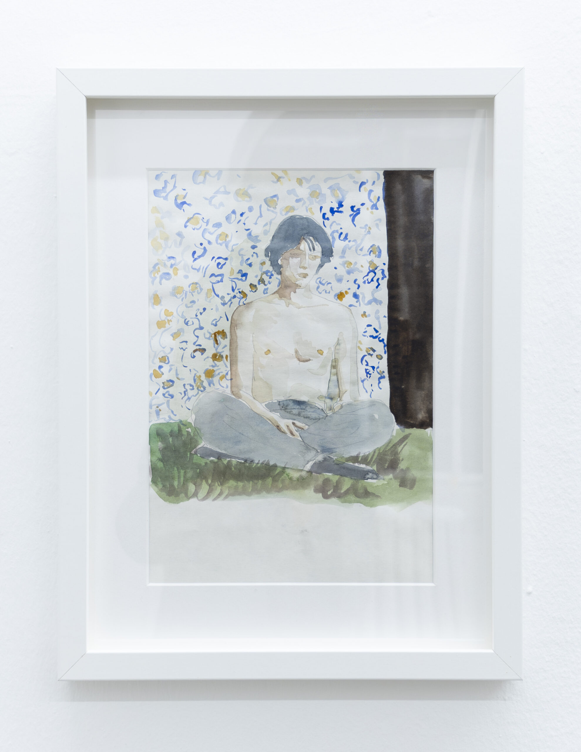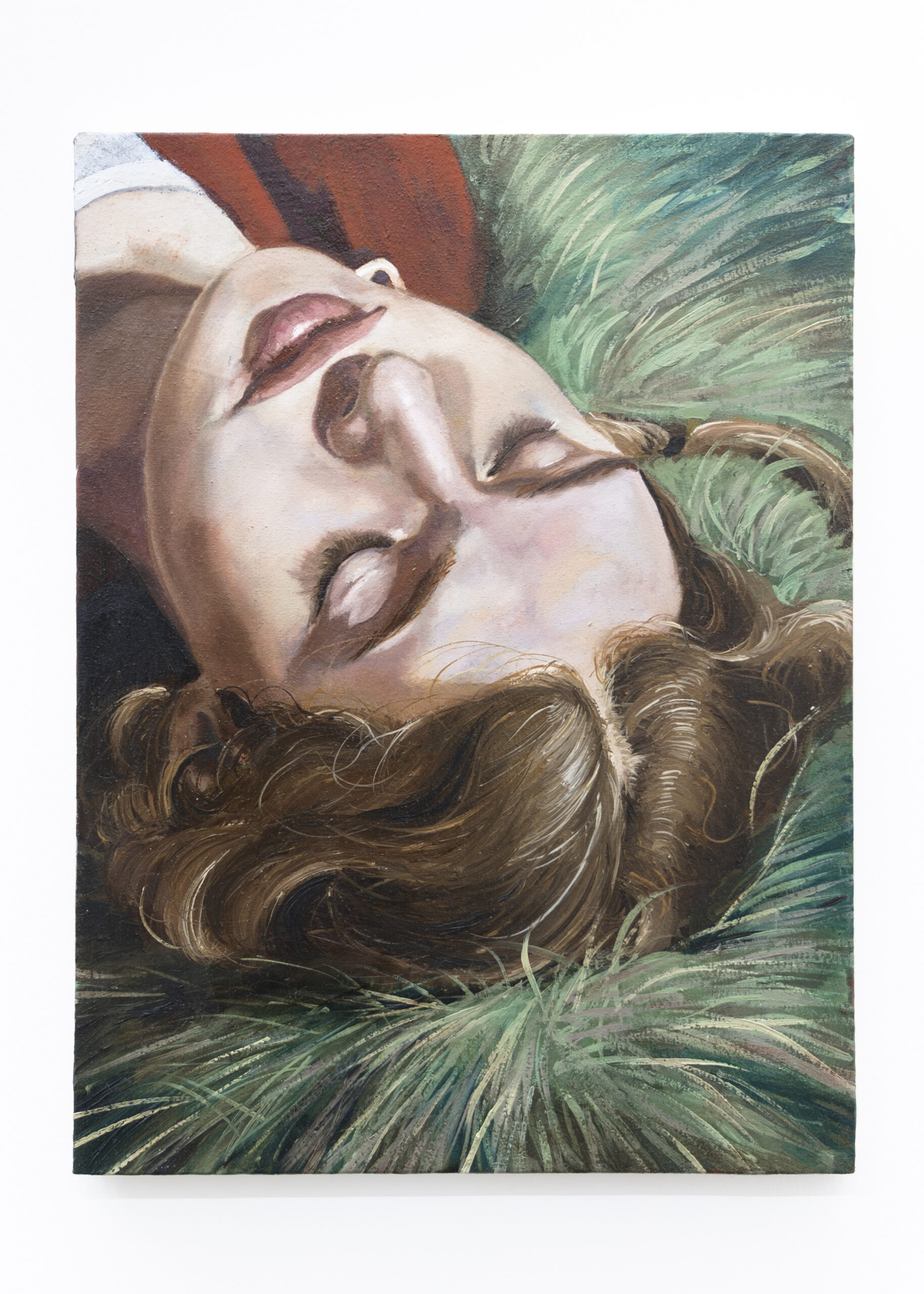 The artist conceives the exhibition space as a single choral work: paintings hung at varying heights, monumental prints, overturned canvases, patches of synthetic grass. A subtle choreography of presences that together creates a narrative broader than the individual images.
