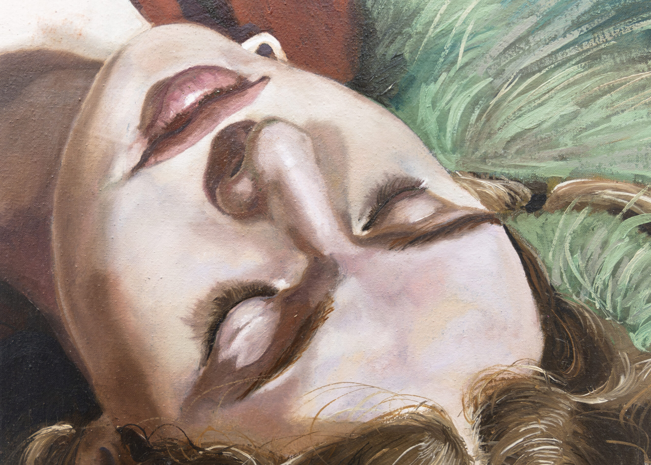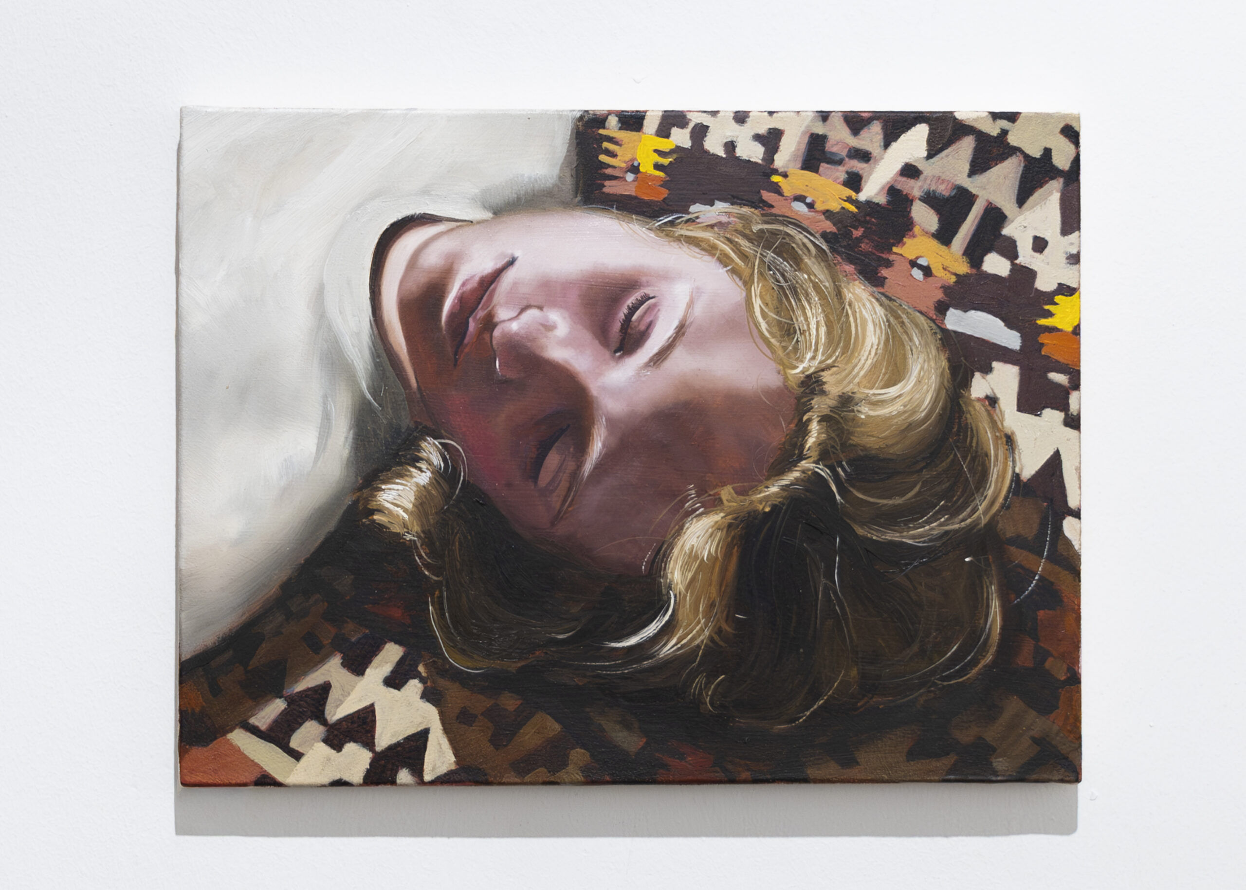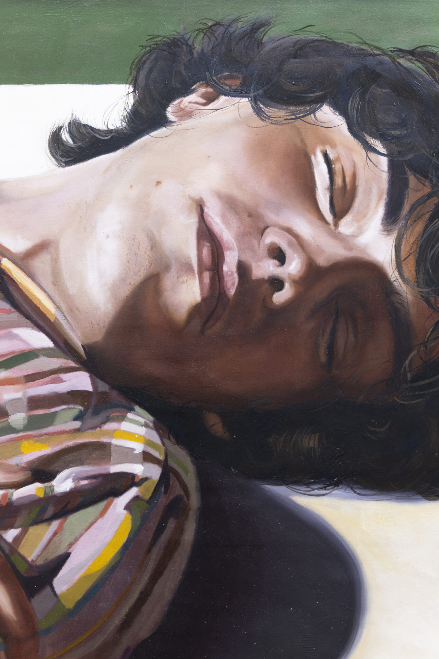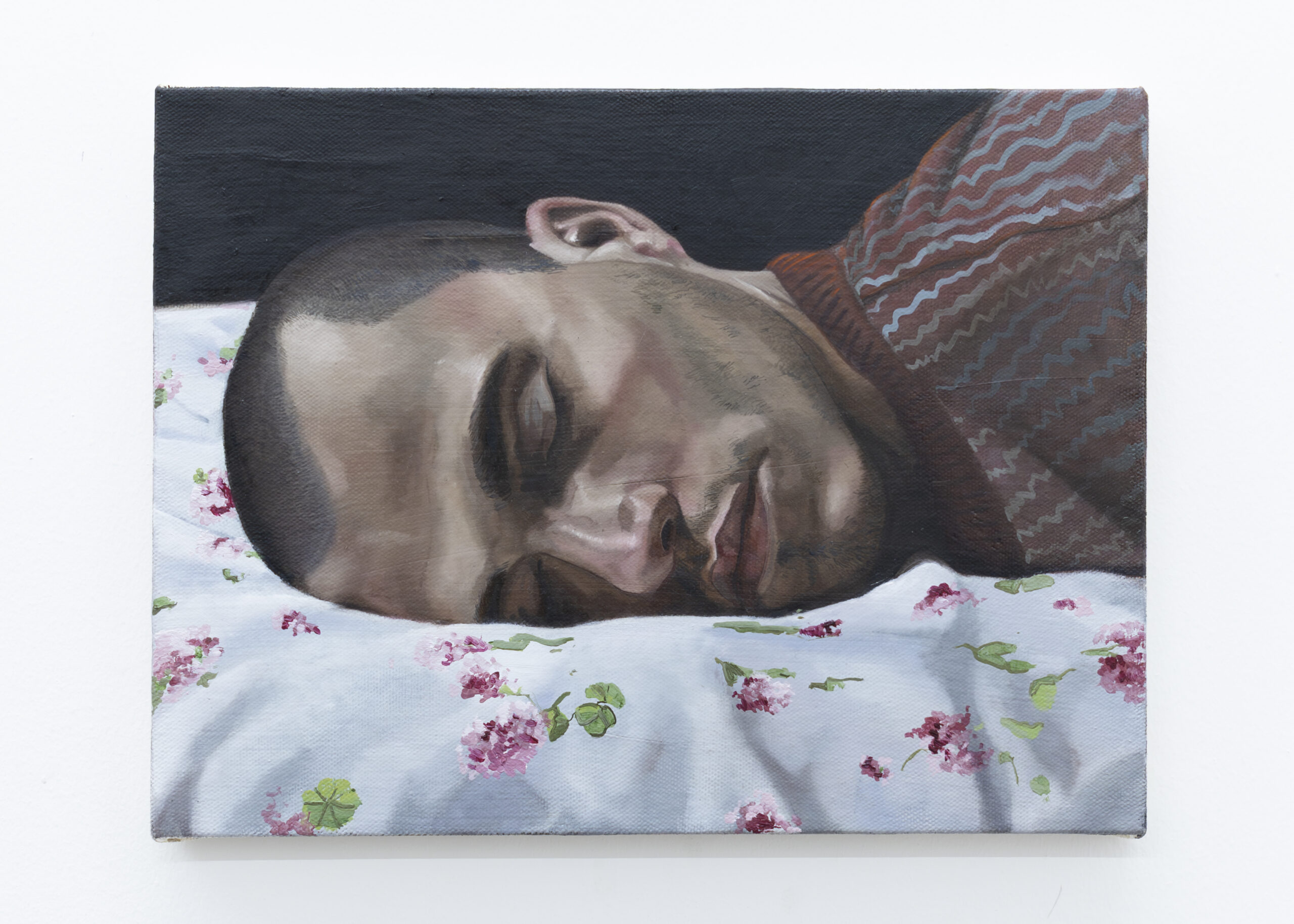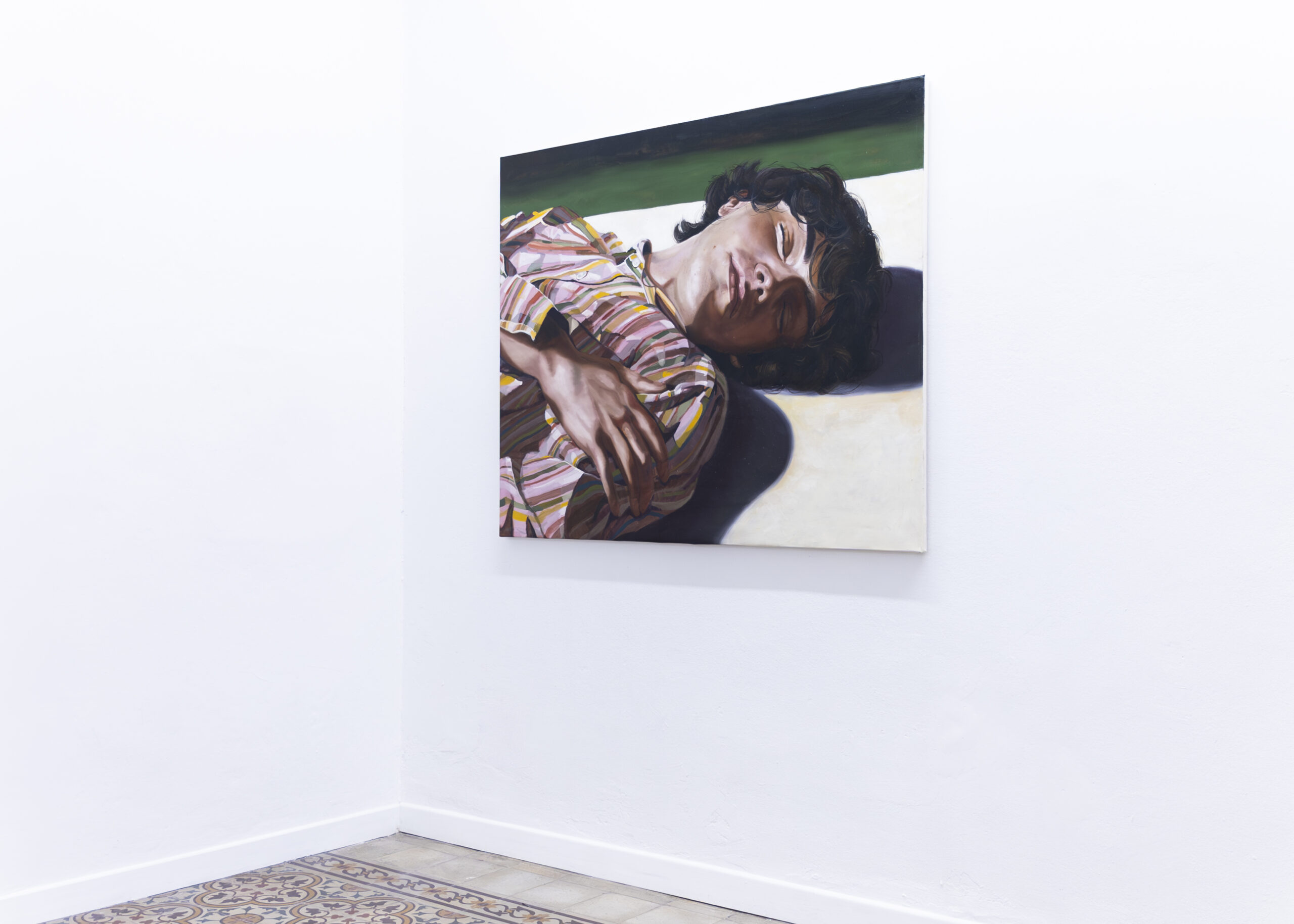 The body, often nude and intimate, is his guiding thread/filled with rouge. Identity remains concealed, while the textures of fabrics do the speaking: kilims, floral bedsheets, colorful knitwear, surfaces almost more eloquent than the faces themselves. The canvases thus become cinematic planes in which one seems to catch a shift of light, the rise of a breath. For Zambello, the body is not only a subject but also a tool: a means of understanding the world, the living boundary that separates us from and simultaneously connects us to what surrounds us: the world.
