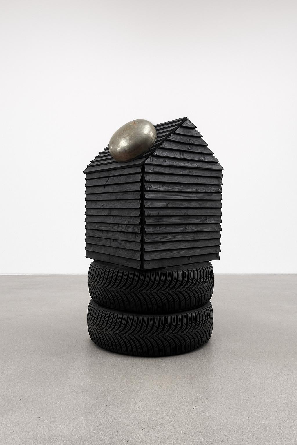 Within this state of collapse, Edoardo Caimi, drawing from peripheral suburban and rural cultures, from practices such as graffiti, and from the use of industrial materials, reimagines contemporaneity within a cosmogonic and survivalist narrative. His work reflects on a non-linear time — a time that belongs to the present as much as to the past, or even to the future — evoking scenarios of social erosion and contaminated landscapes in which new forms of tribalism, organizations, and resistance groups find their habitat.