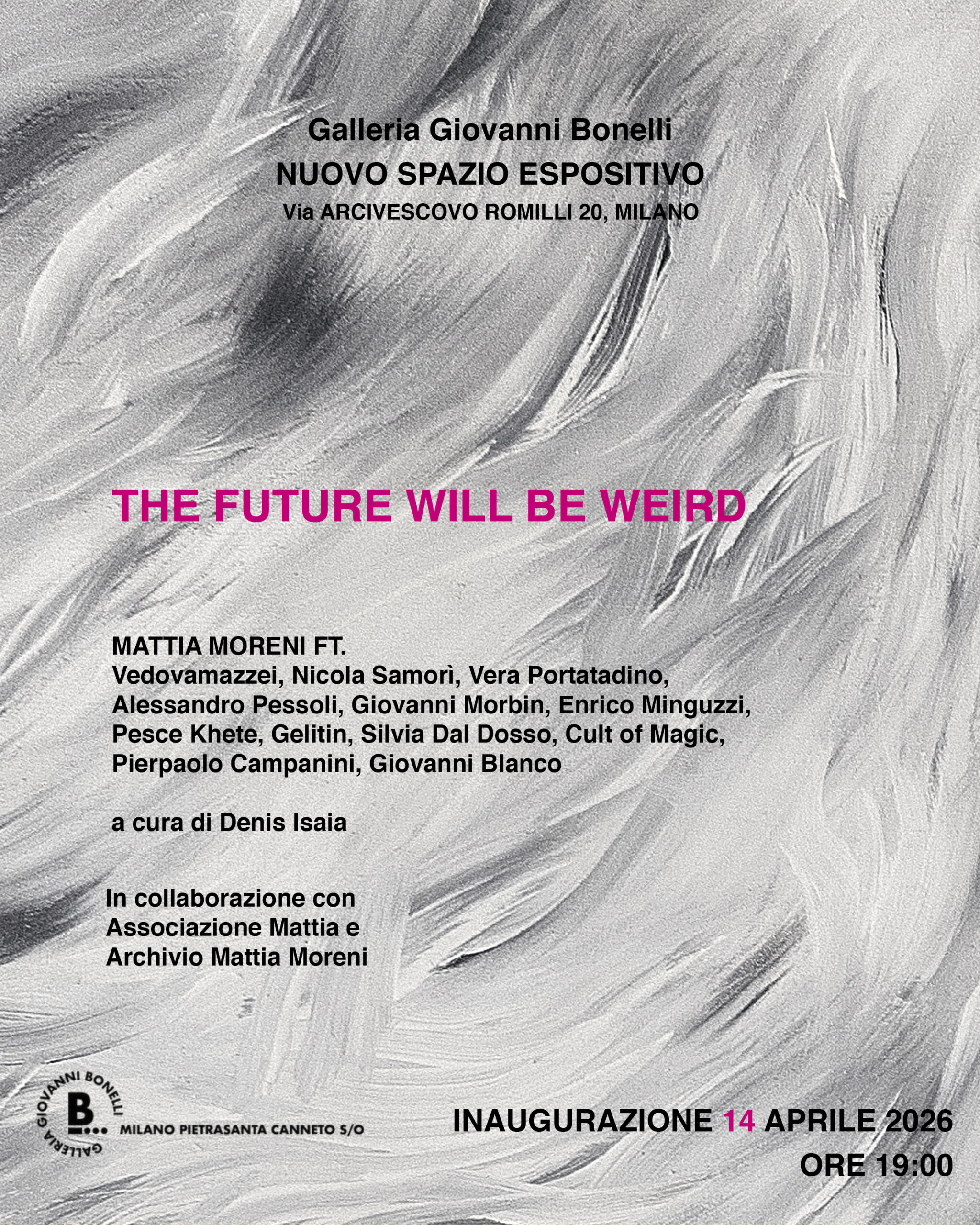 The Giovanni Bonelli Gallery is delighted to announce the opening of its new space with a caustic, post-prophetic and punk exhibition that celebrates the freedom of art as a necessary form of resistance: The Future Will Be Weird. With this exhibition, the gallery officially inaugurates a new chapter by relocating its historic premises from the Isola district to Corvetto, one of the city’s most dynamic and rapidly changing neighbourhoods, home to some of the most vibrant institutions on the art scene.