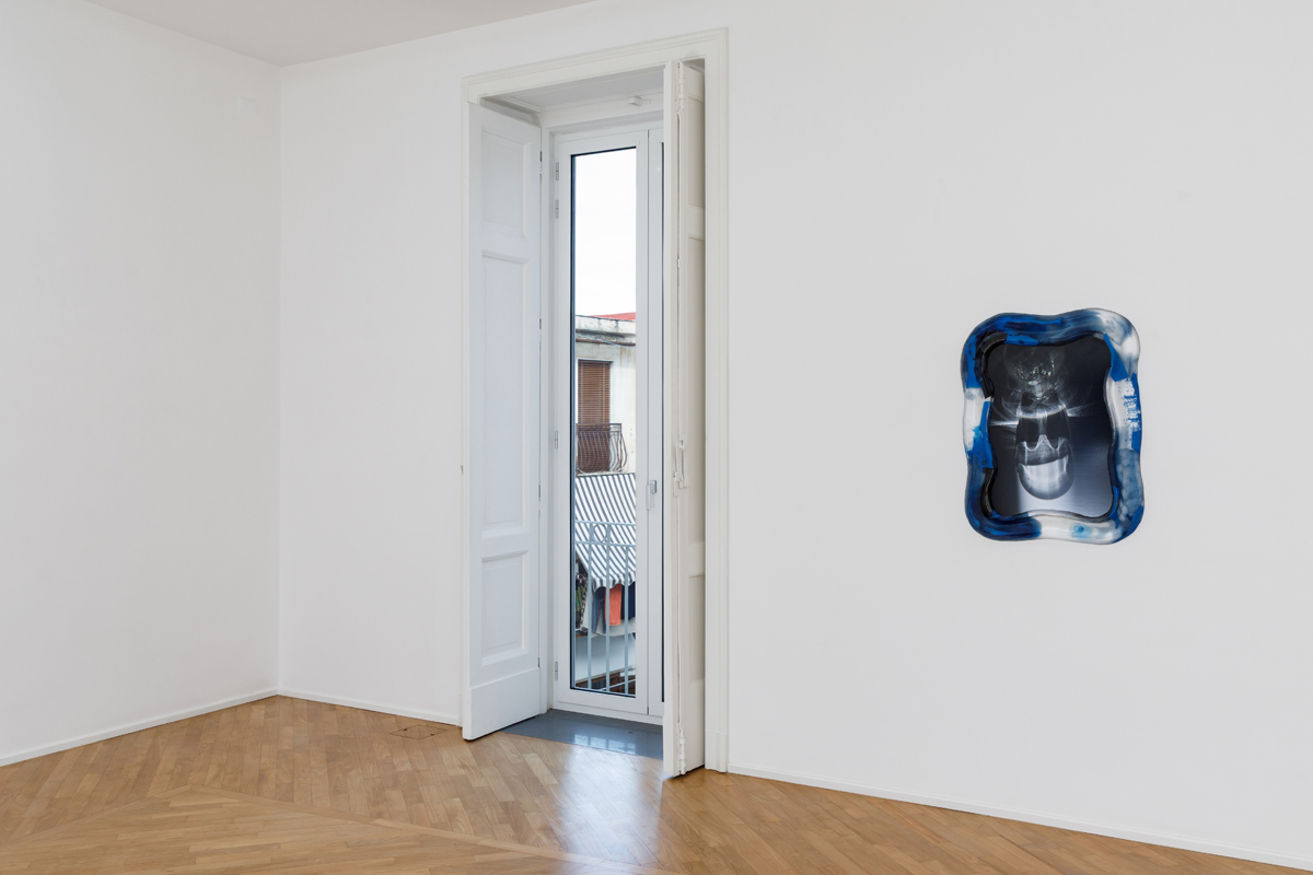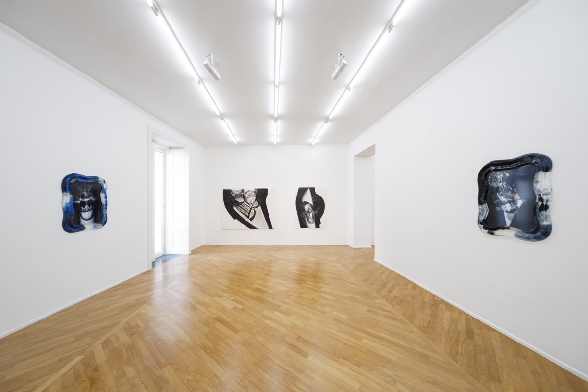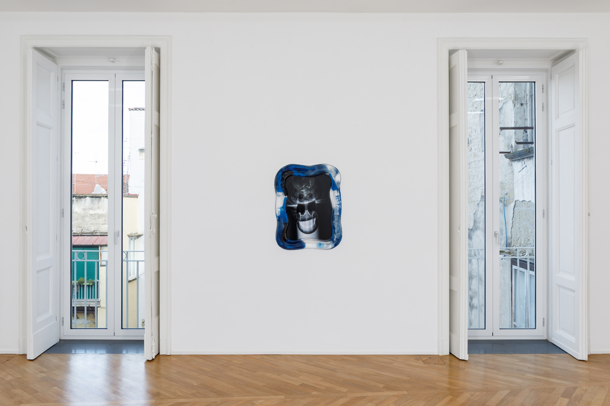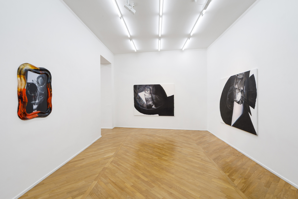 The exhibition presents a new body of work, produced entirely in Naples, arising from the observation of sunlight and the way its rays, passing through everyday glass objects, become distorted as they project onto a horizontal surface. Within this set of accidental refractions, a dual intention of translating the real image takes shape. On the one hand, photographs with glass-paste frames, where a crystallized nature surrounds the photographed caustics of light, held in the instant of their appearance. On the other, in the large paintings made with airbrush, charcoal, and chalk, fields of shadow on a white ground circumscribe the suggestions of light, which emerge as vaporized forms, cuts, or contours.