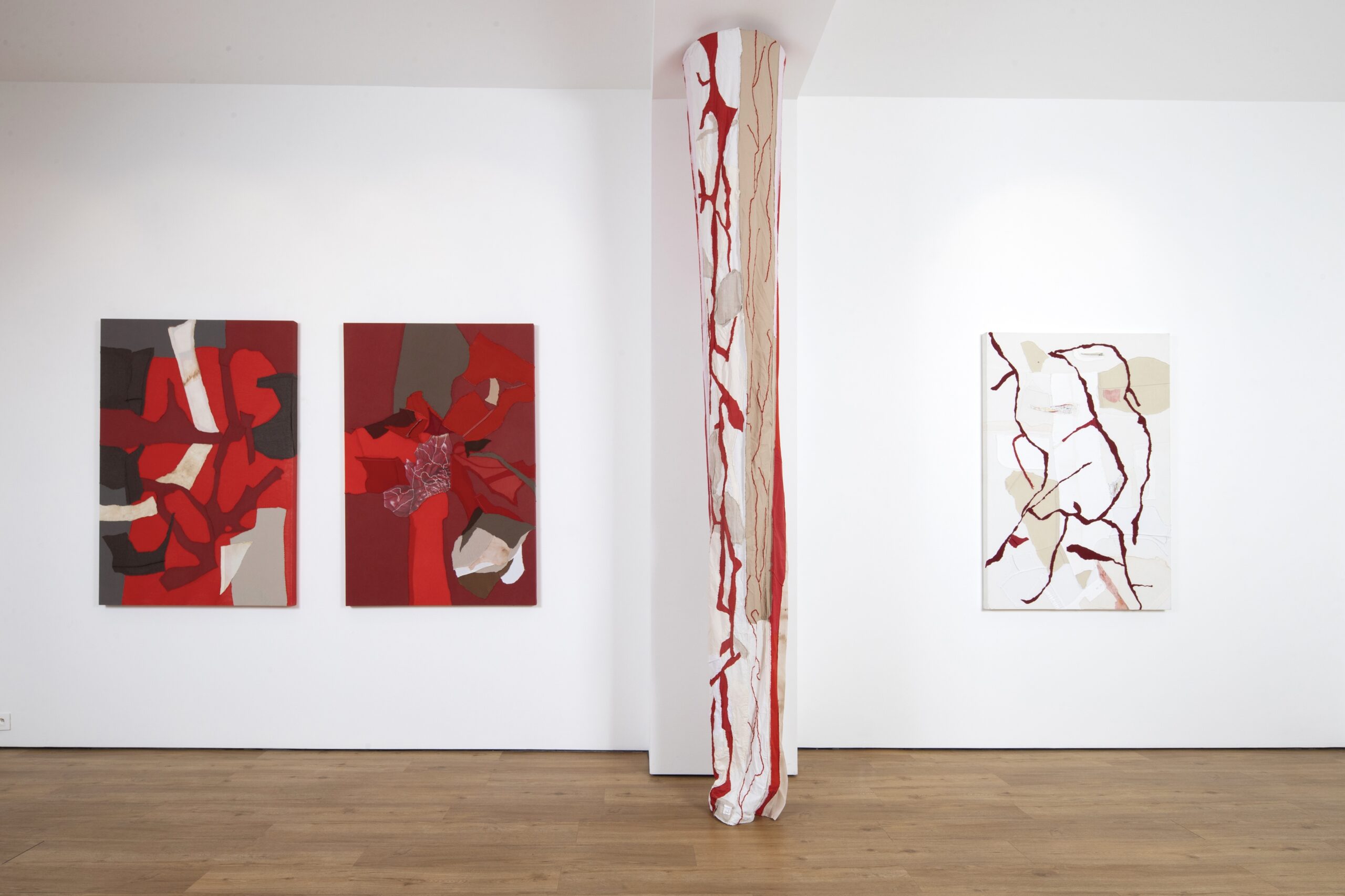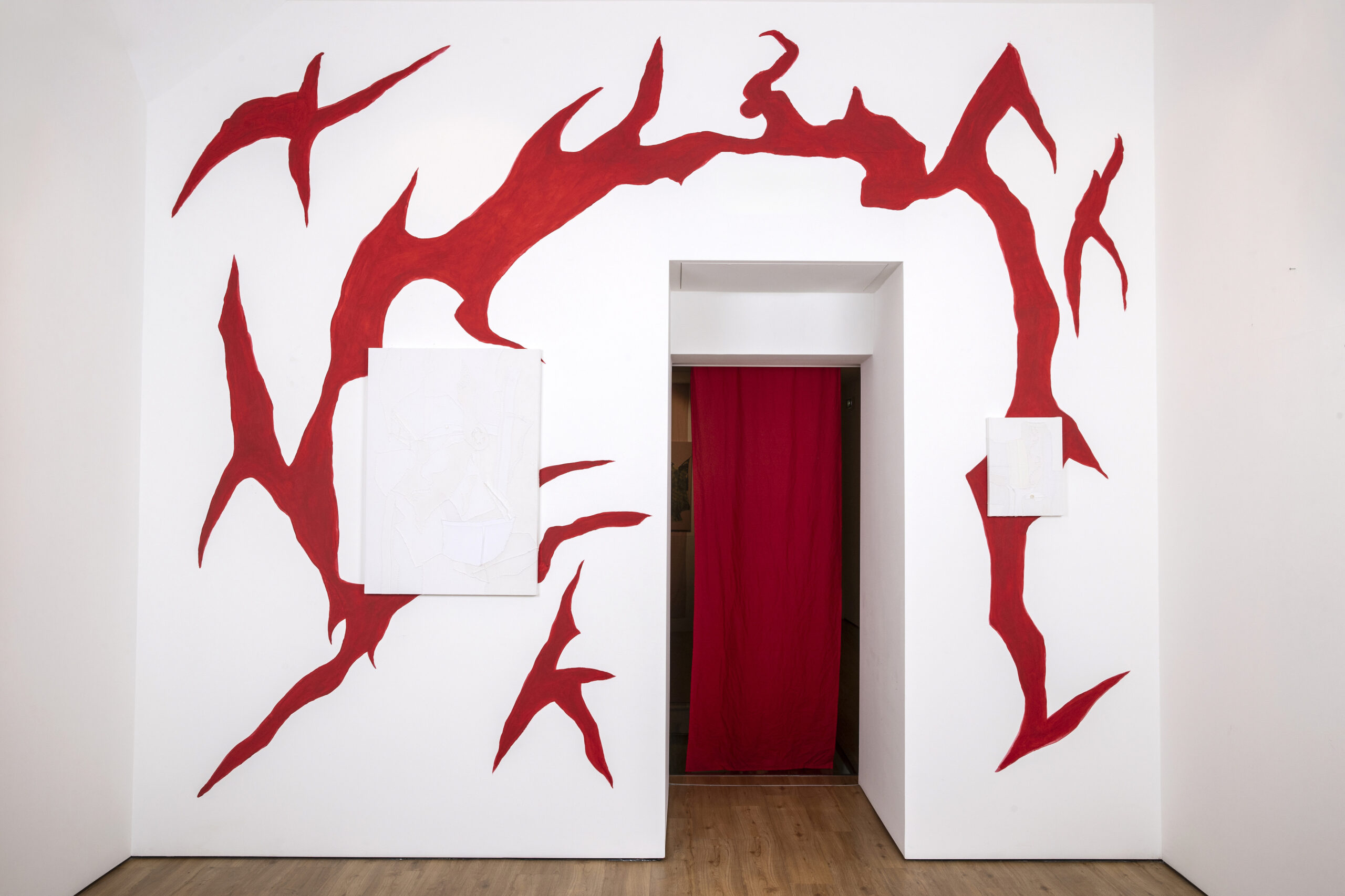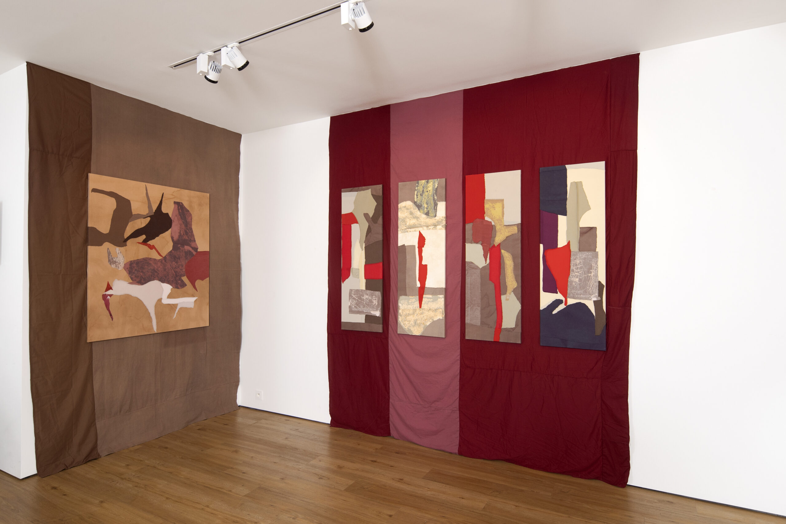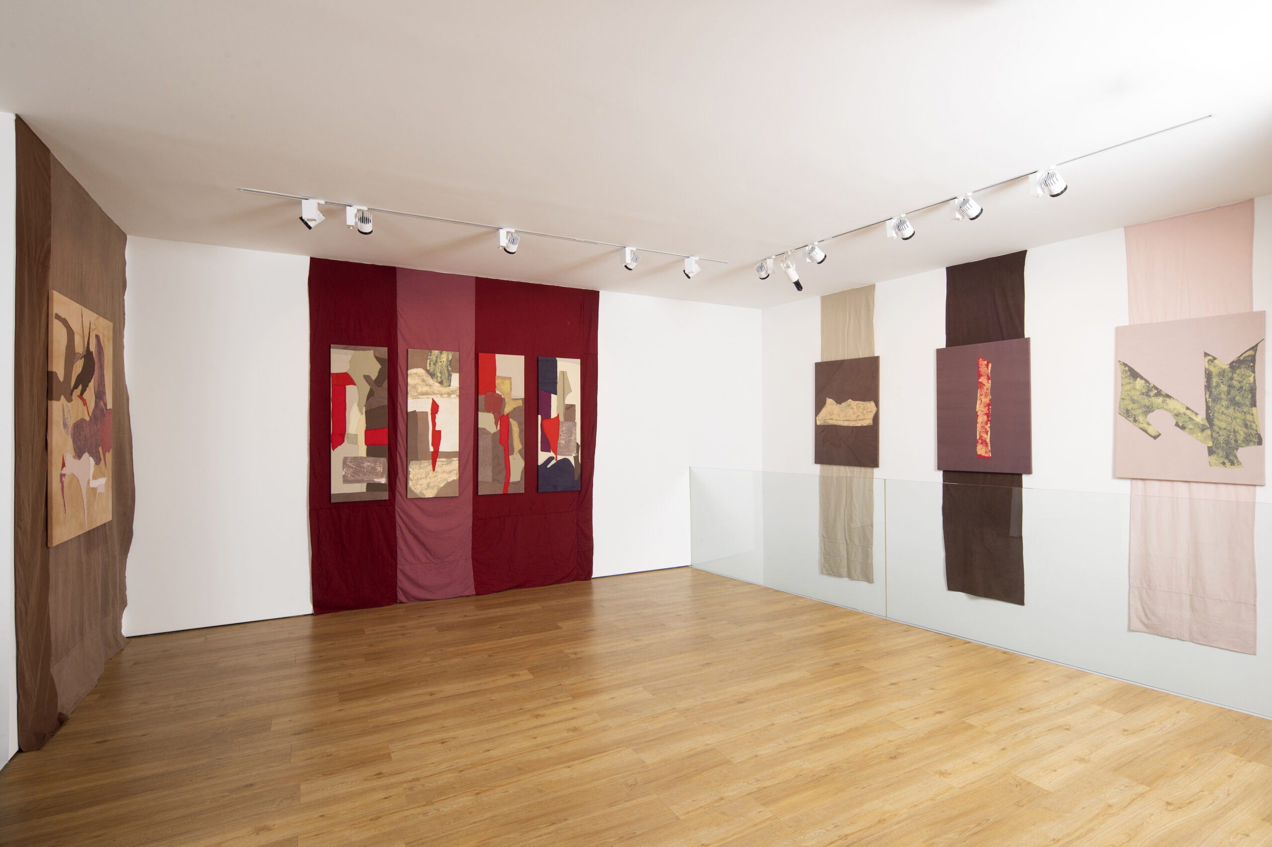 For the occasion the artist executed a wall painting to frame the works while two columns of fabric welcome the viewer and move lightly as he passes.