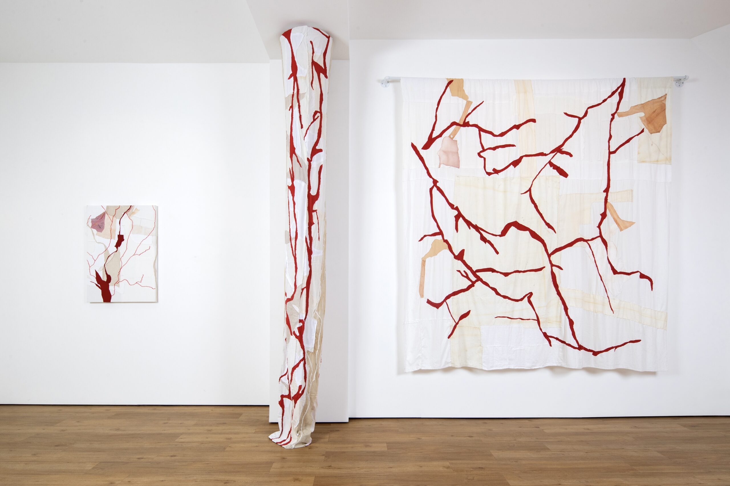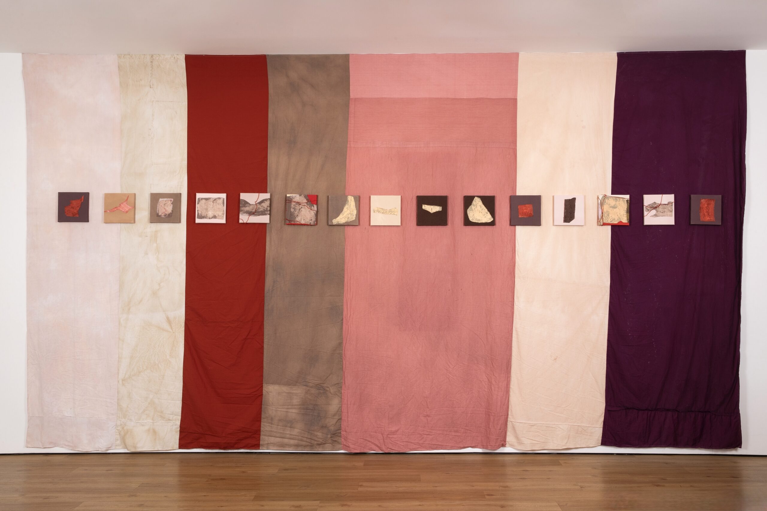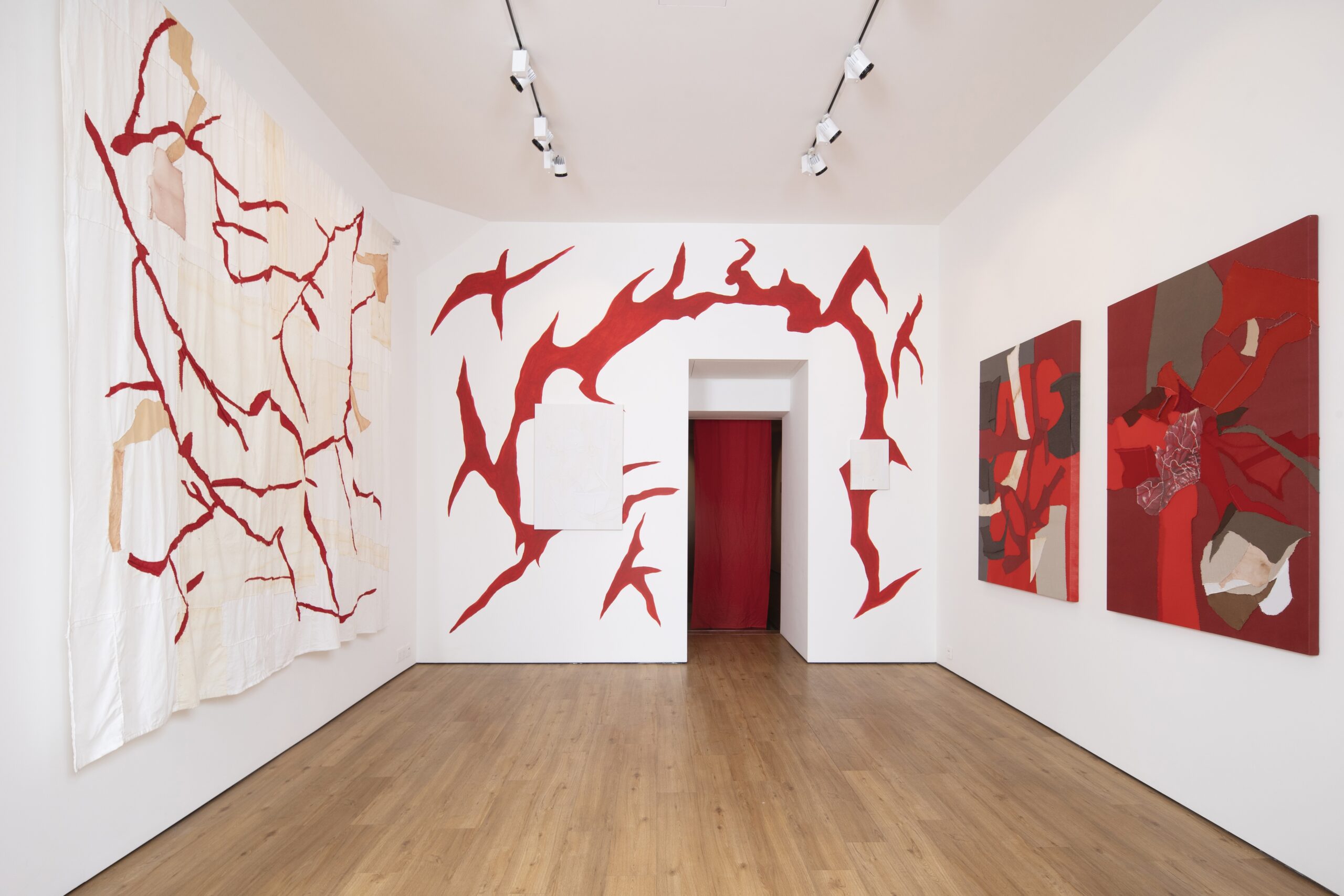 In the first room are on display the series « Sutura », « Spolia » and « Untitled red monochromes ». The practice of Lino founds his mantra in the gesture of sewing applied to fabrics belonging to the family environment but also to strangers and to the use of natural pigments obtained from avocado, tea, beetroot and curcuma.