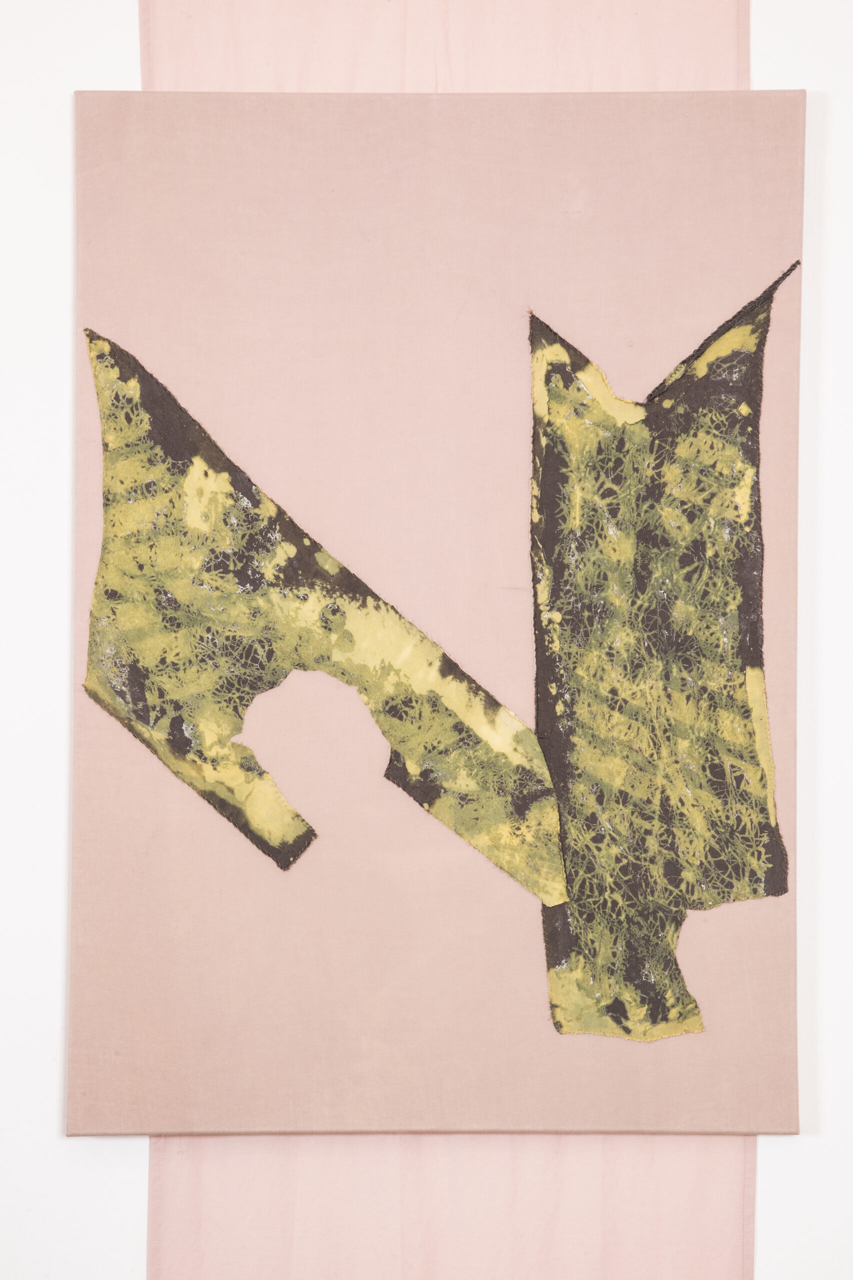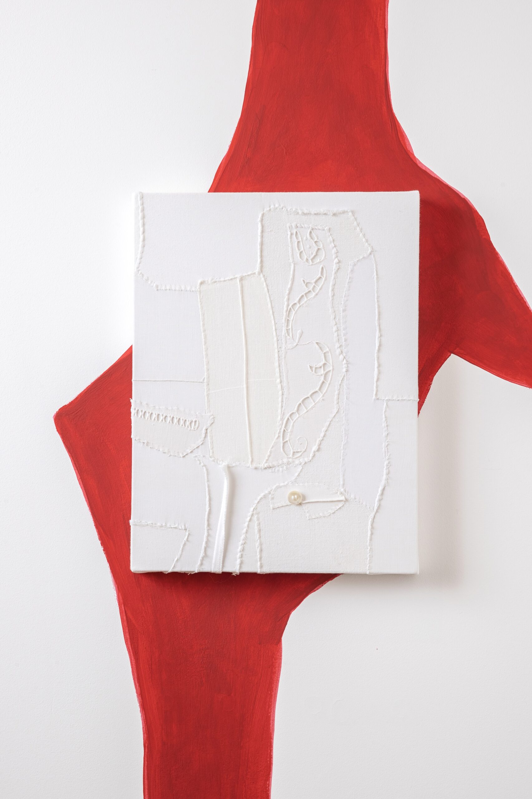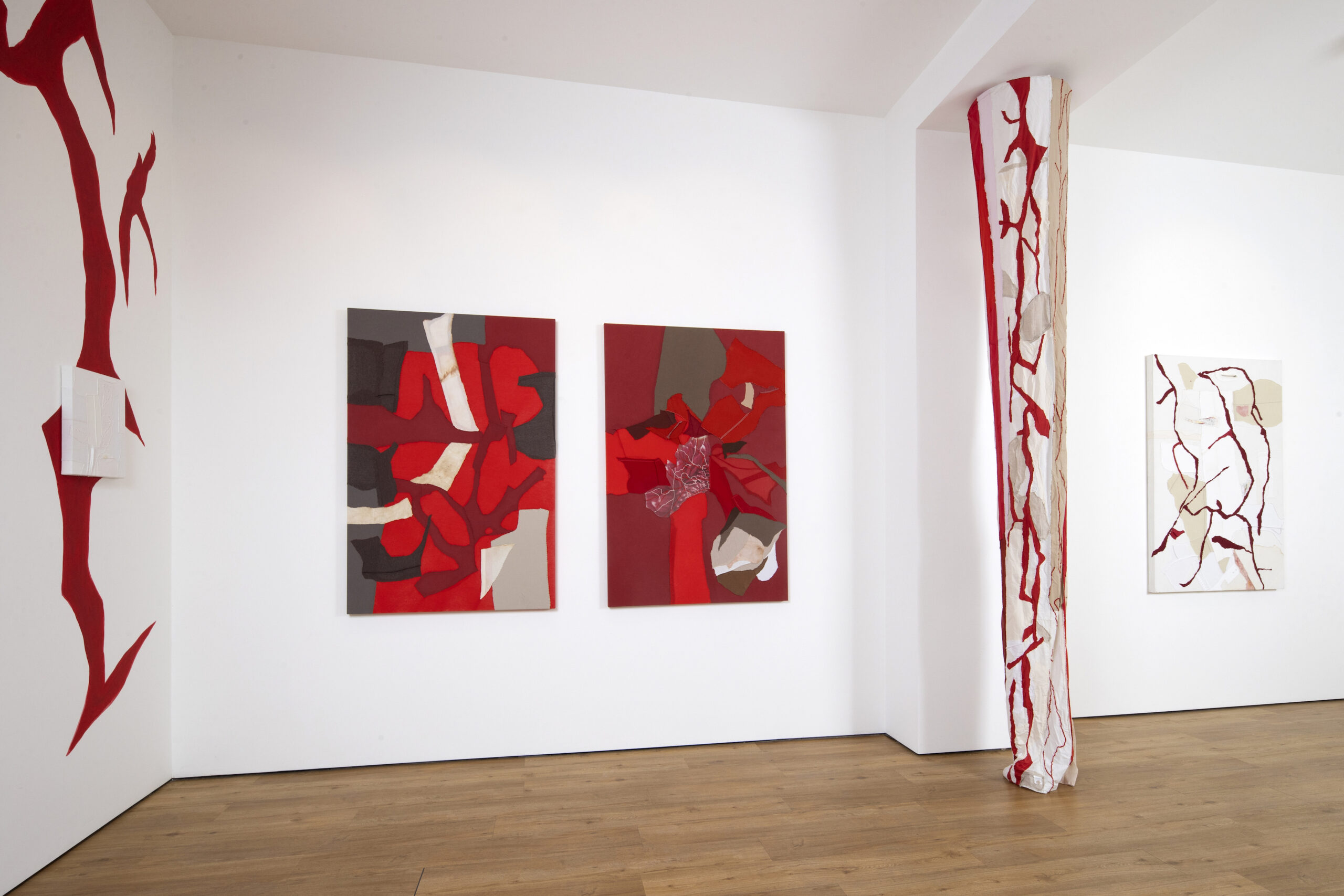 In the first room are on display the series « Sutura », « Spolia » and « Untitled red monochromes ». The practice of Lino founds his mantra in the gesture of sewing applied to fabrics belonging to the family environment but also to strangers and to the use of natural pigments obtained from avocado, tea, beetroot and curcuma.